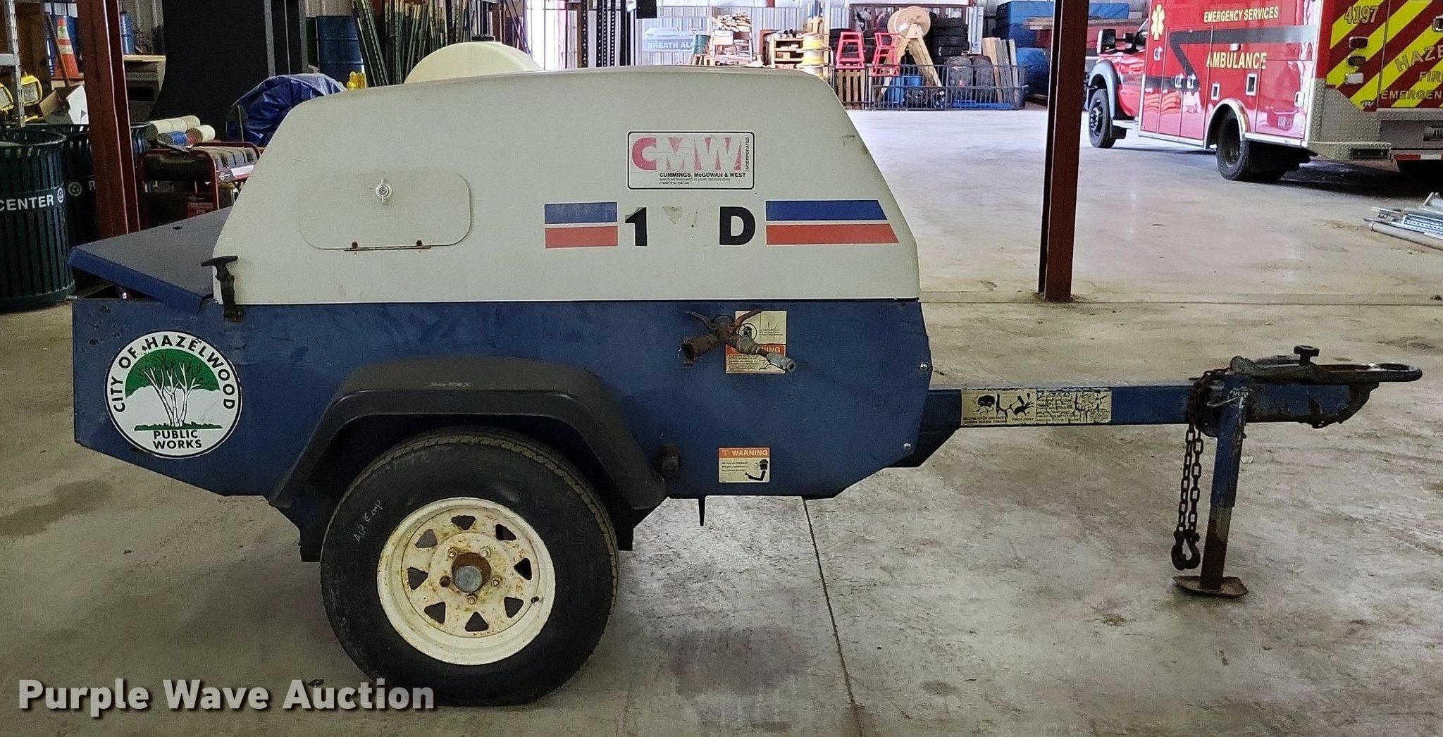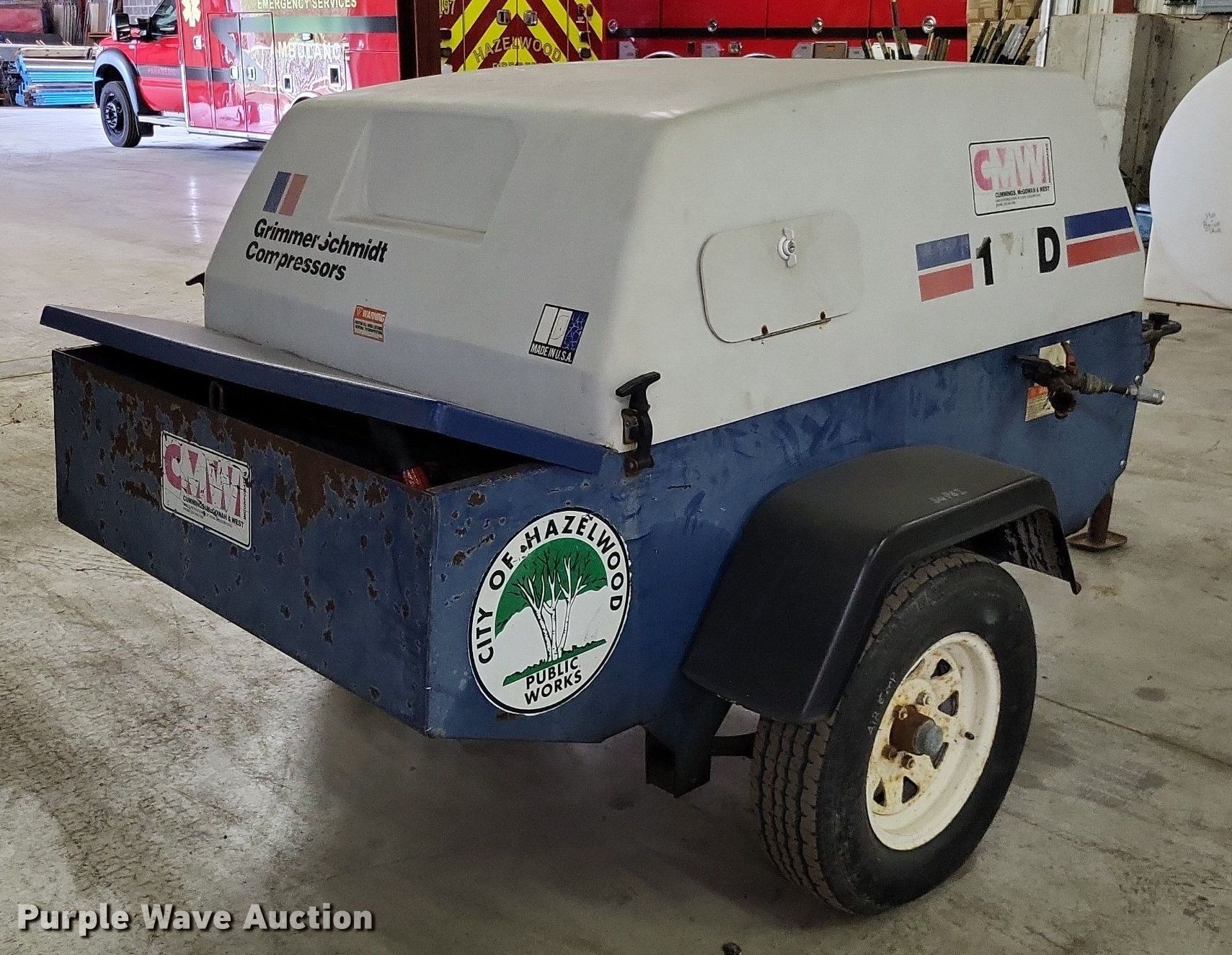 Grimmer Schmidt 175D air compressor. Hours: 875 on meter, Serial: 16657, Unit #: PG408. Engine John Deere 175D/58, Serial: 971226, Cylinders: 3, Fuel type: Diesel. Trailer Suspension: Spring, Axles: Single, Tire size: ST175/80R13. Transfer of ownership documentation will be a bill of sale. City of Hazelwood, MO. Hazelwood, MO 63042
