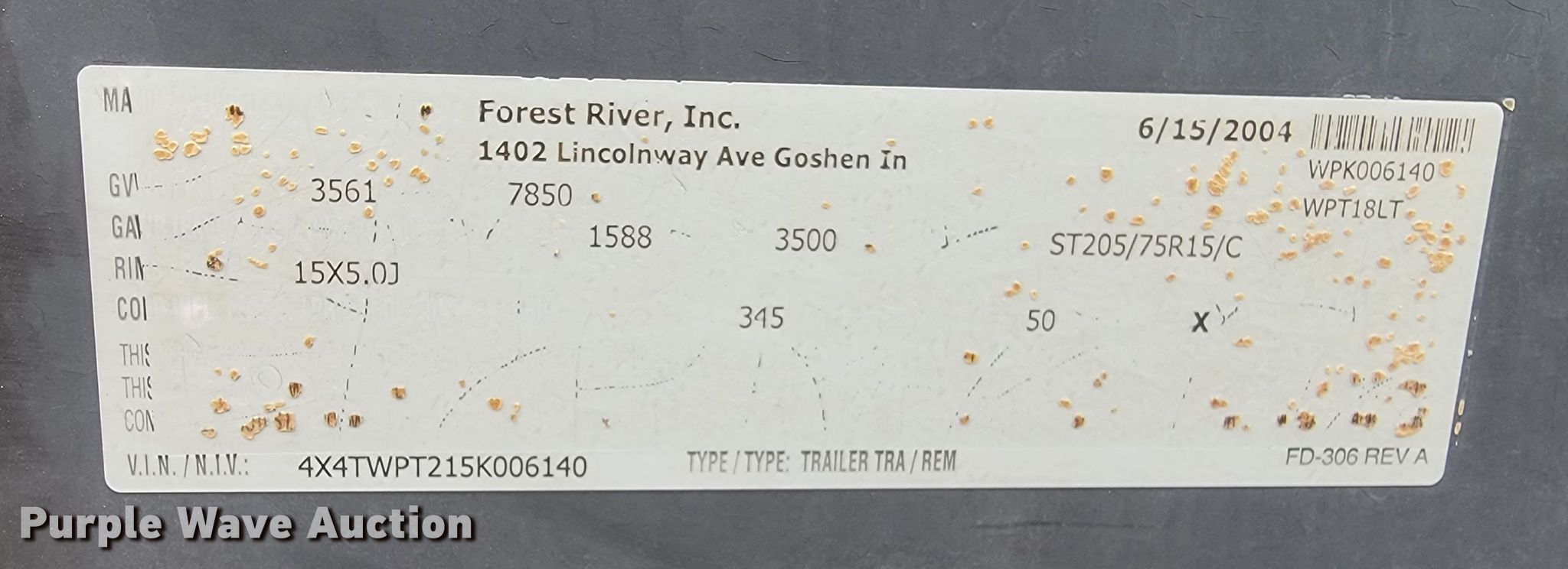 2005 Forrest River Work N Play camper. Camper length: 24', VIN: 4X4TWPT215K006140, Unit #: SDWF-6. Chassis Axles: Tandem, Suspension: Spring, Brakes: Electric. Interior Kitchen: Sink, Refrigerator, Stove: Propane, Living room: Table, Bathroom, AC units: 1. Features Awnings: 1 Awning type: Manual, Rear door/ ramp, Ball hitch: 2 5/16". Tires Size: ST205/75R15. Notes Unit has been modified, Parts may be missing, Unknown operating condition. South Dakota title. State of South Dakota Property Management. 3305 West South Street. Rapid City, SD 57702