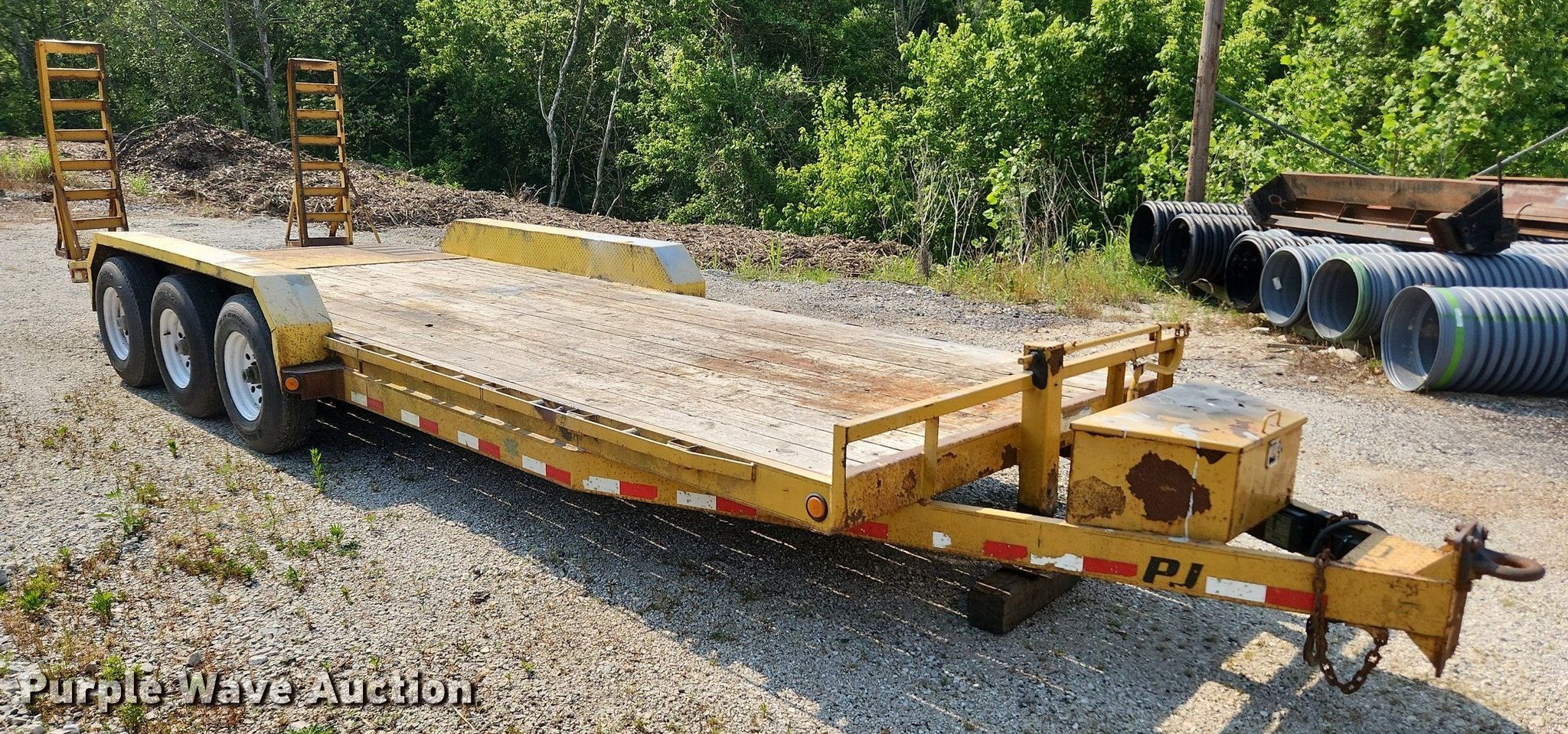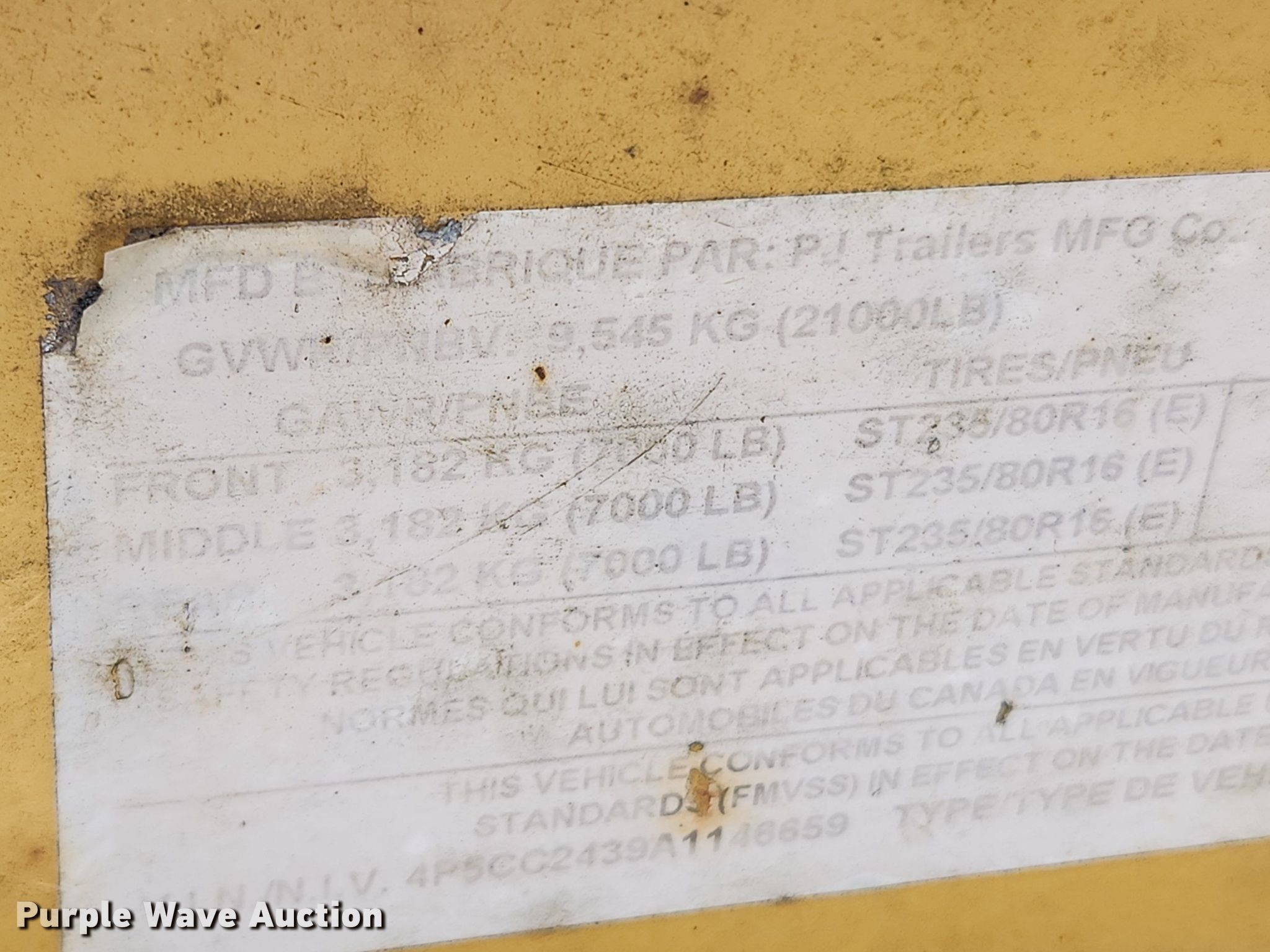 2010 PJ CC243 equipment trailer. VIN: 4P5CC2439A1146659. Dimensions Overall: 29' L x 102" W, Deck: 22' L x 102" W, Tail length: 2', Ramps: Manual Length: 5'. Features Deck type: Wood. Chassis Hitch: Pintle, Landing gear: Single, Suspension: Spring, Brakes: Electric, Axles: Triple, GVWR: 21,000 lbs, GAWR: 7,000 lbs. Tires Steel wheels, Size: 235/85R15. Missouri title. Title distribution may be delayed up to 14 days from verification of funds. Franklin County, MO. Union, MO 63084