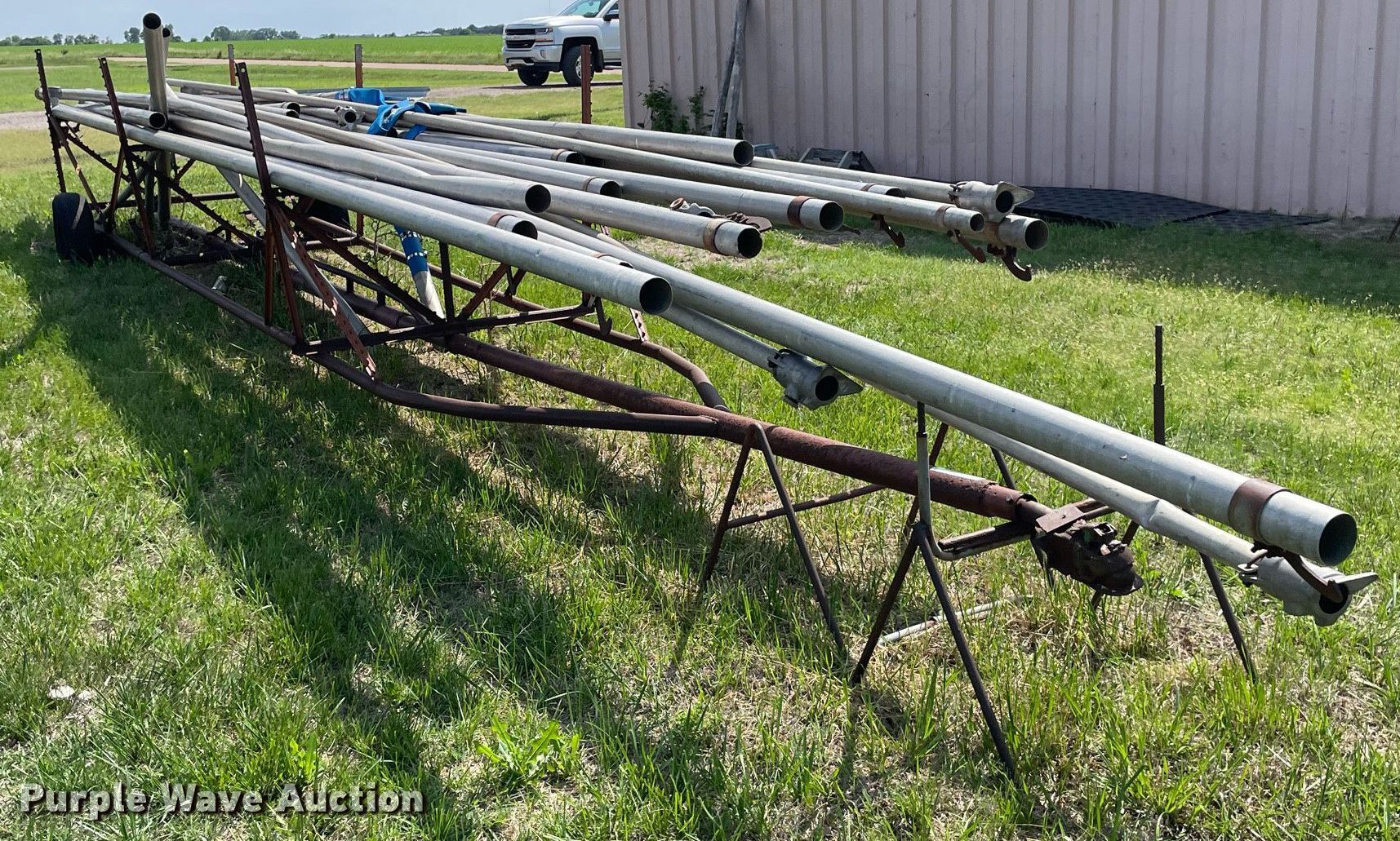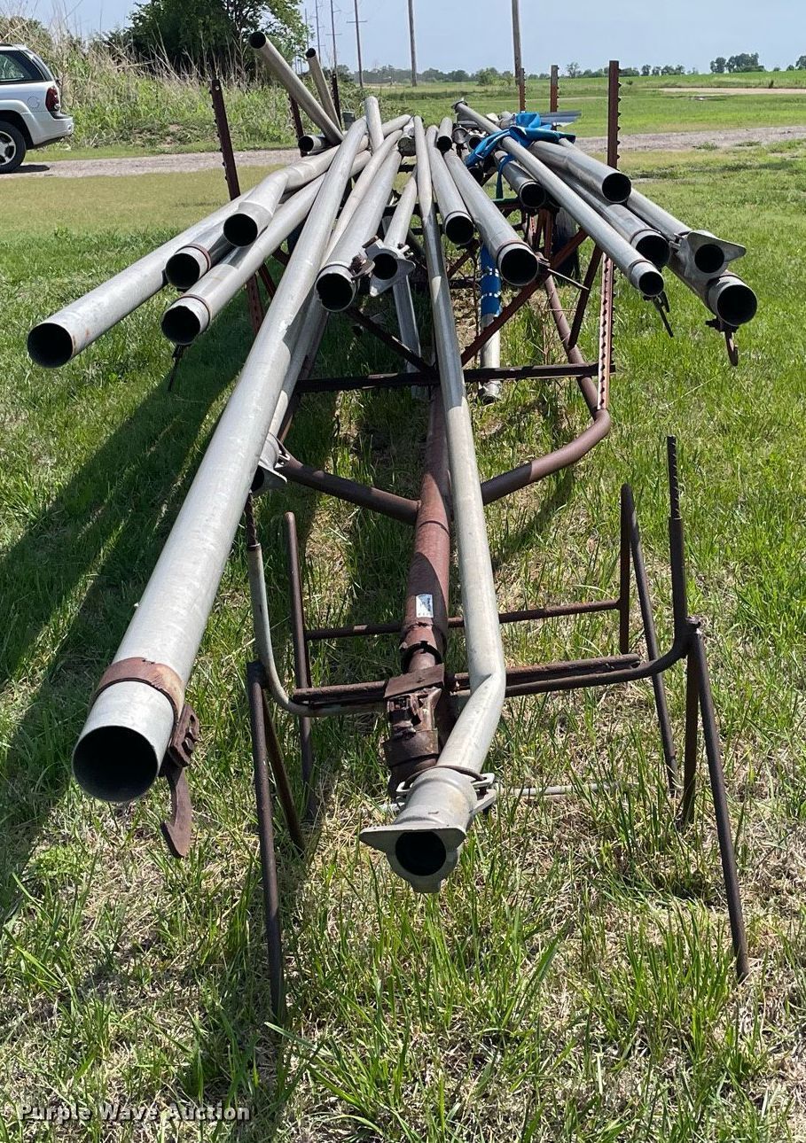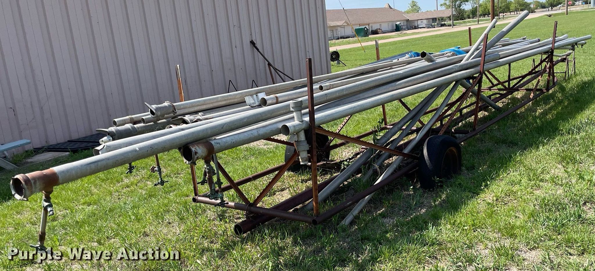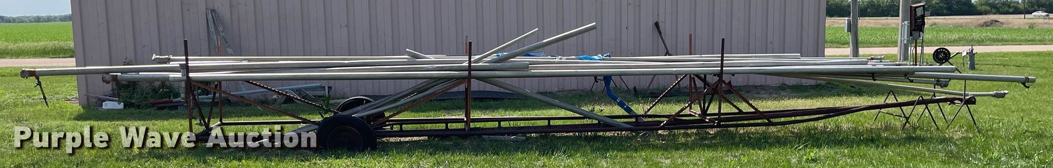 Purple Wave is selling a used Trailer Other in Kansas. This item is a Shop built irrigation trailer with the following: Overall: 32' L x 52" W, Approx. 20 pieces of pipe, Widths range: 2"-3", Lengths range: 26"- 39'