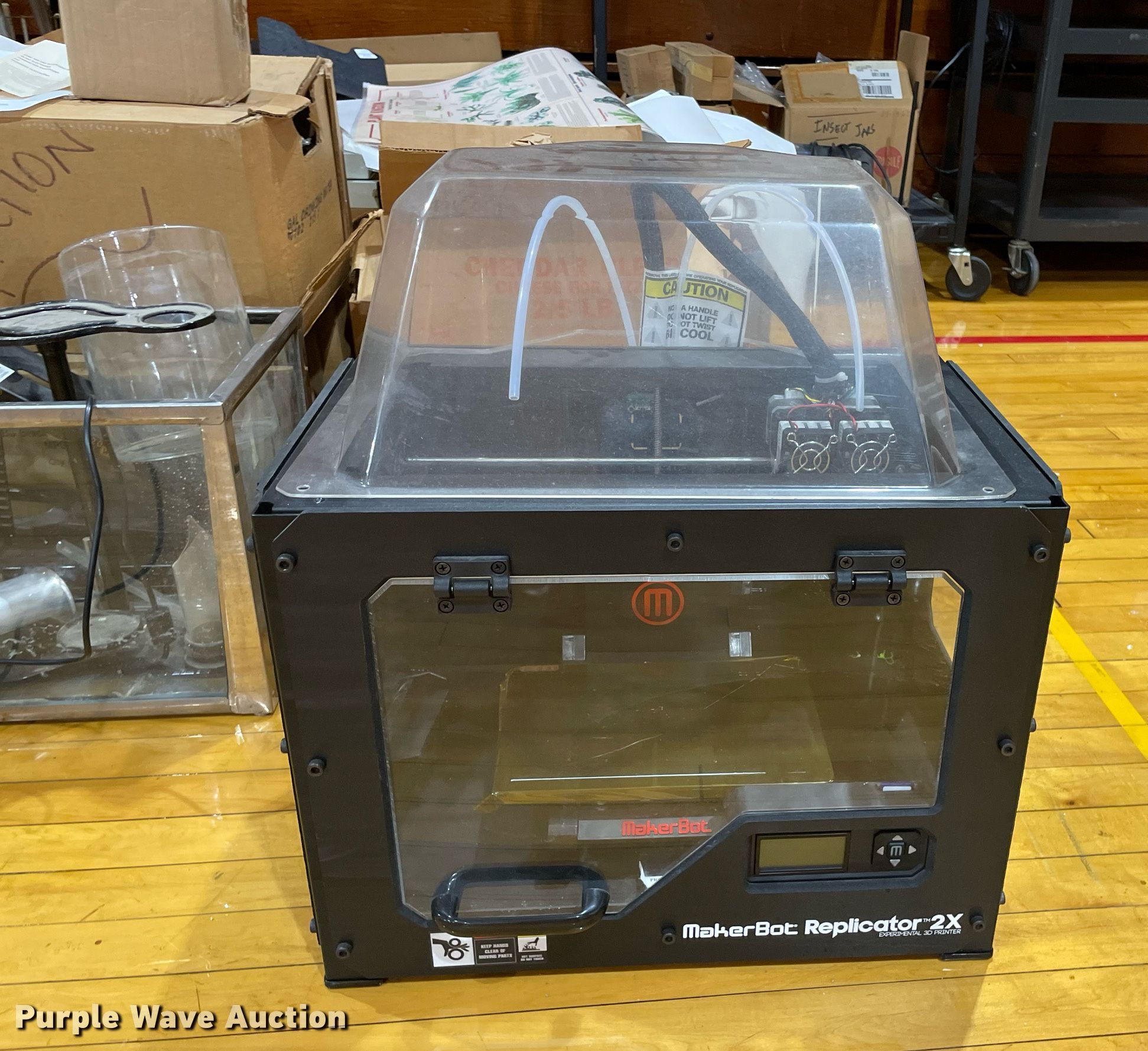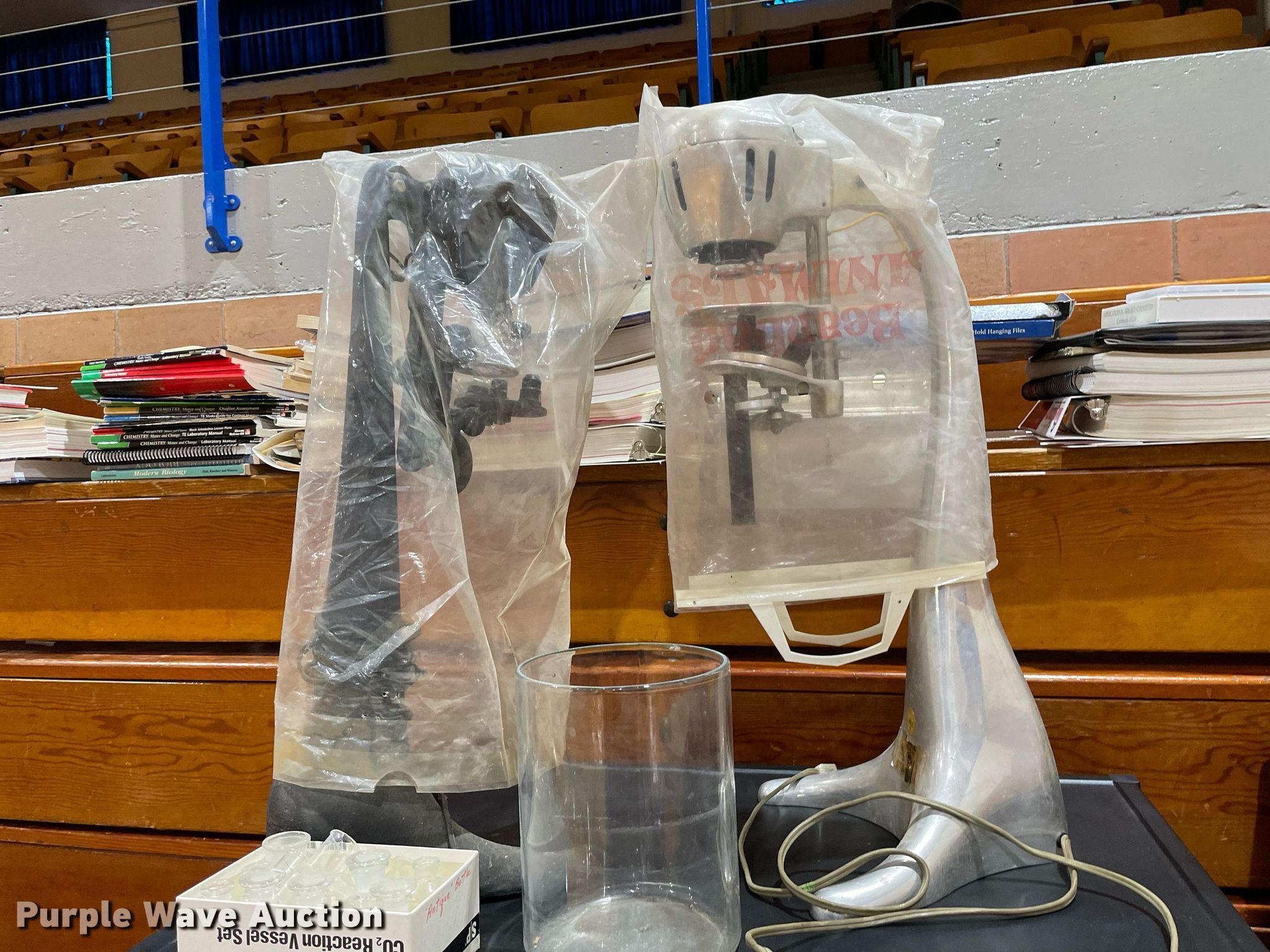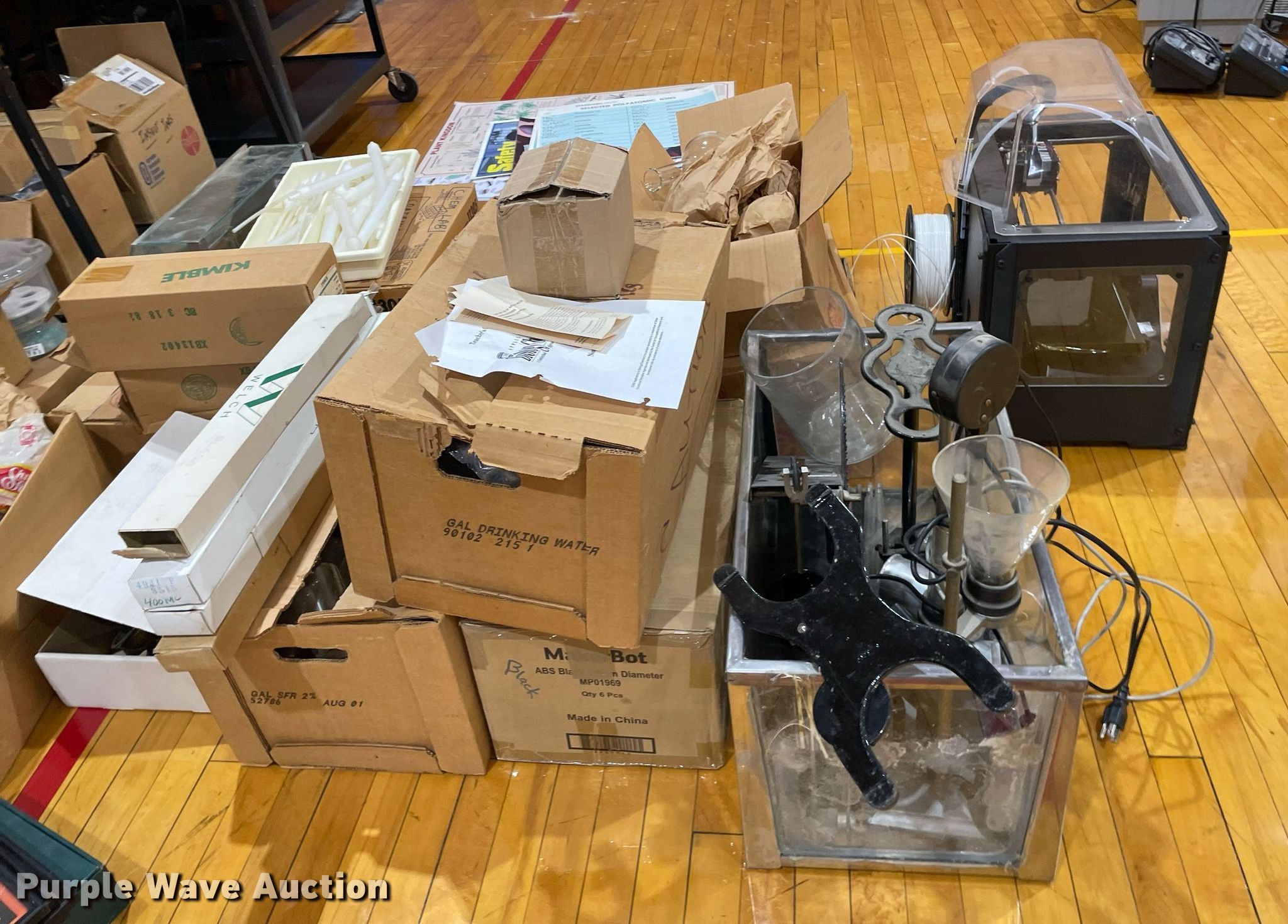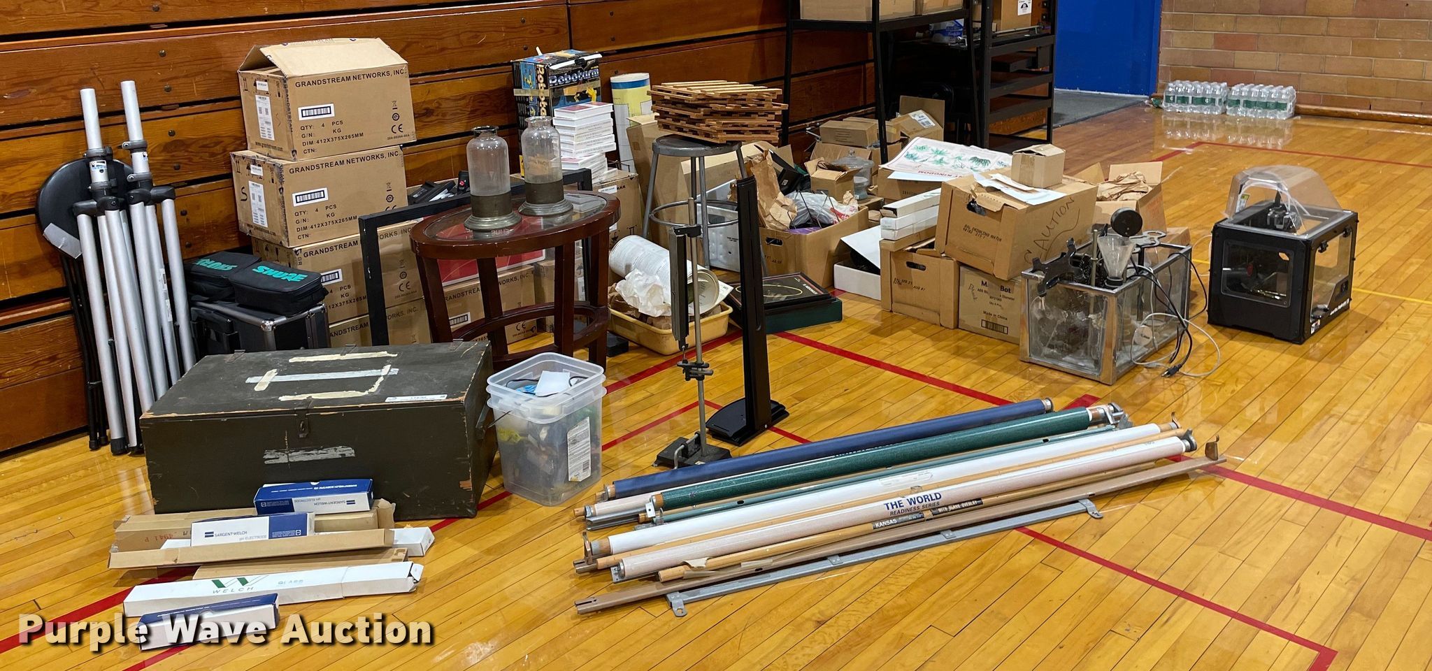 Purple Wave is selling a used Office Supplies and Equip. in Kansas. This item is a Office supplies and equipment with the following: Maker-Bot Replicator 2X 3D printer, Science equipment, Microscopes, School books, (7) overhead projectors, (2) Sargent-Welch PH8000, Maps, (2) tripods, (2) rolling carts, End table, Phones, Stool and more