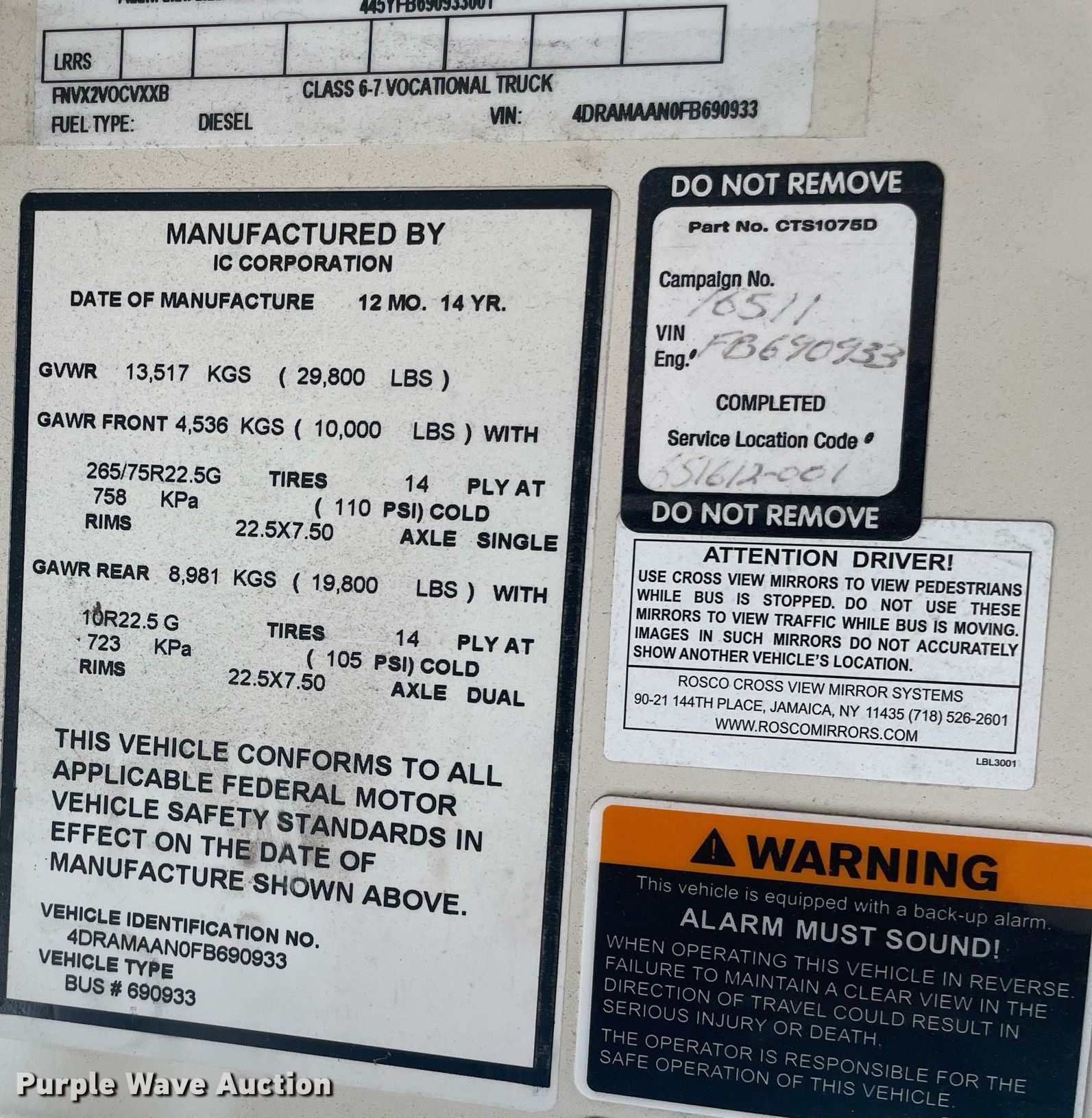Purple Wave is selling a used Bus in Kansas. This item is a 2015 IC Corporation PC105 school bus with the following: Miles: 130,490 on odometer, Hours: 8,339 on meter, VIN: 4DRAMAAN0FB690933