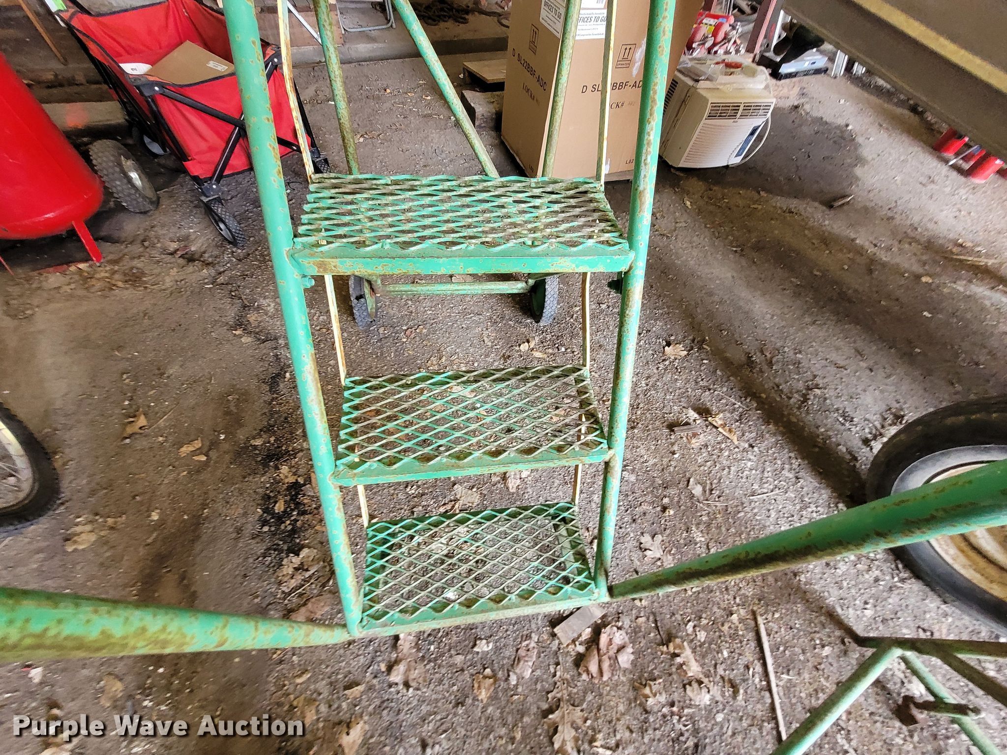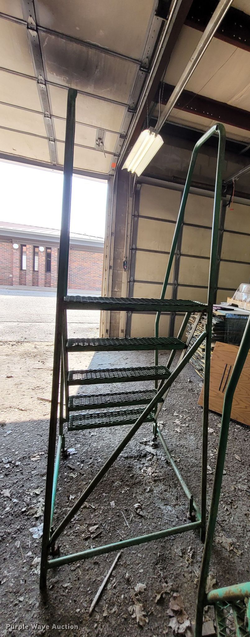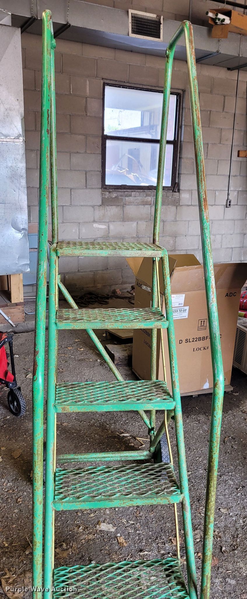 Purple Wave is selling a used Tools in Kansas. This item is a (2) five step warehouse ladders with the following: Wheels worn