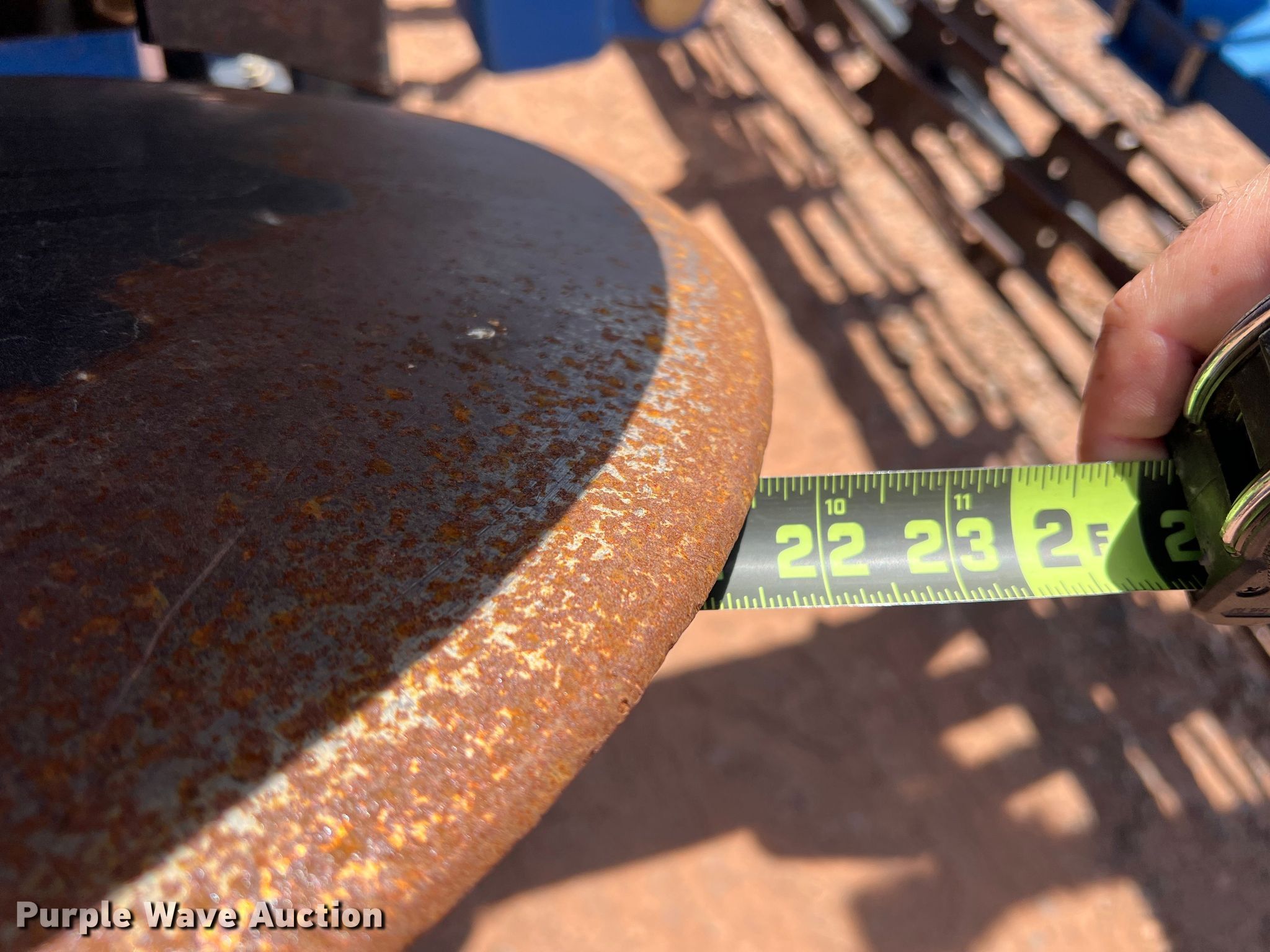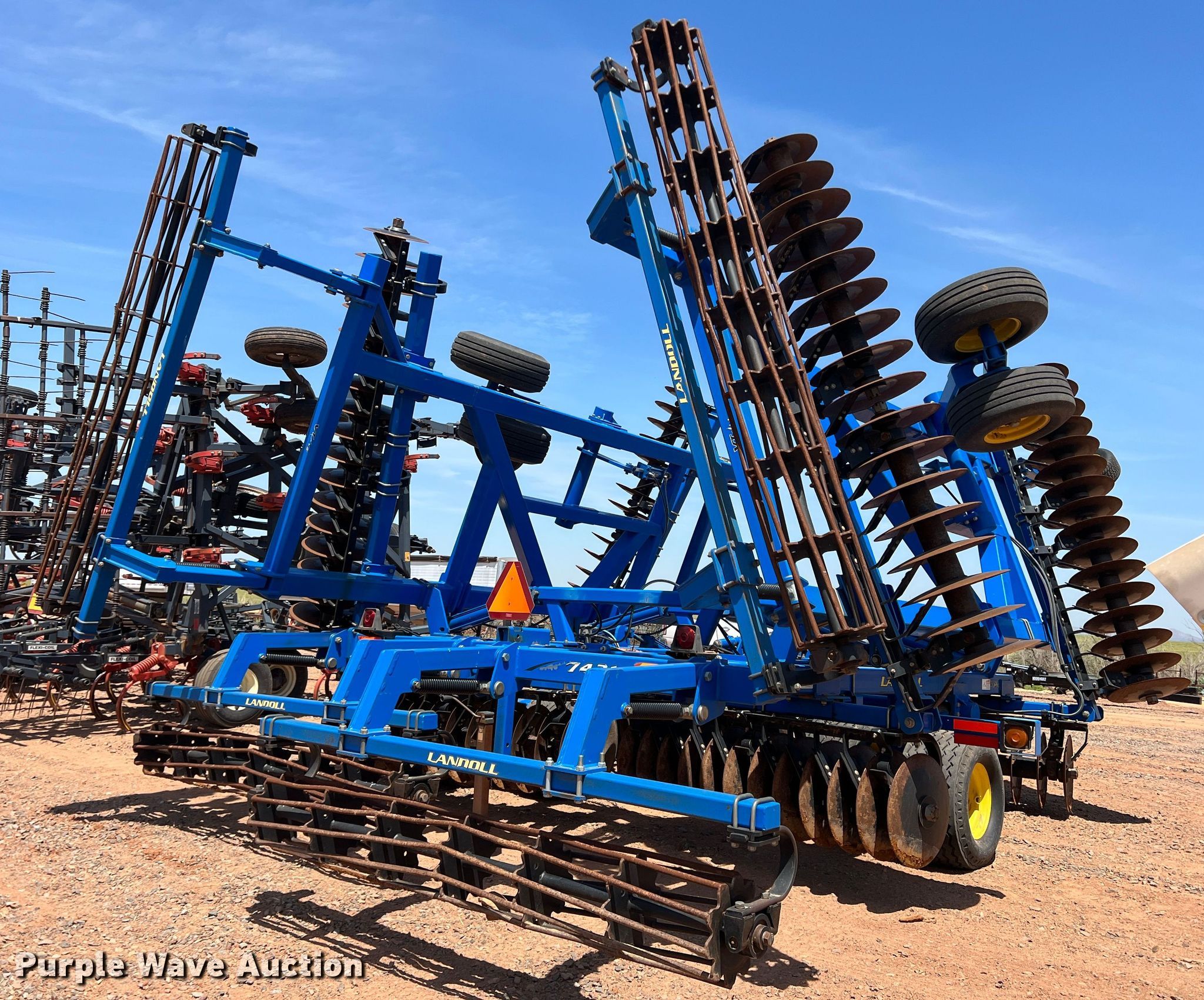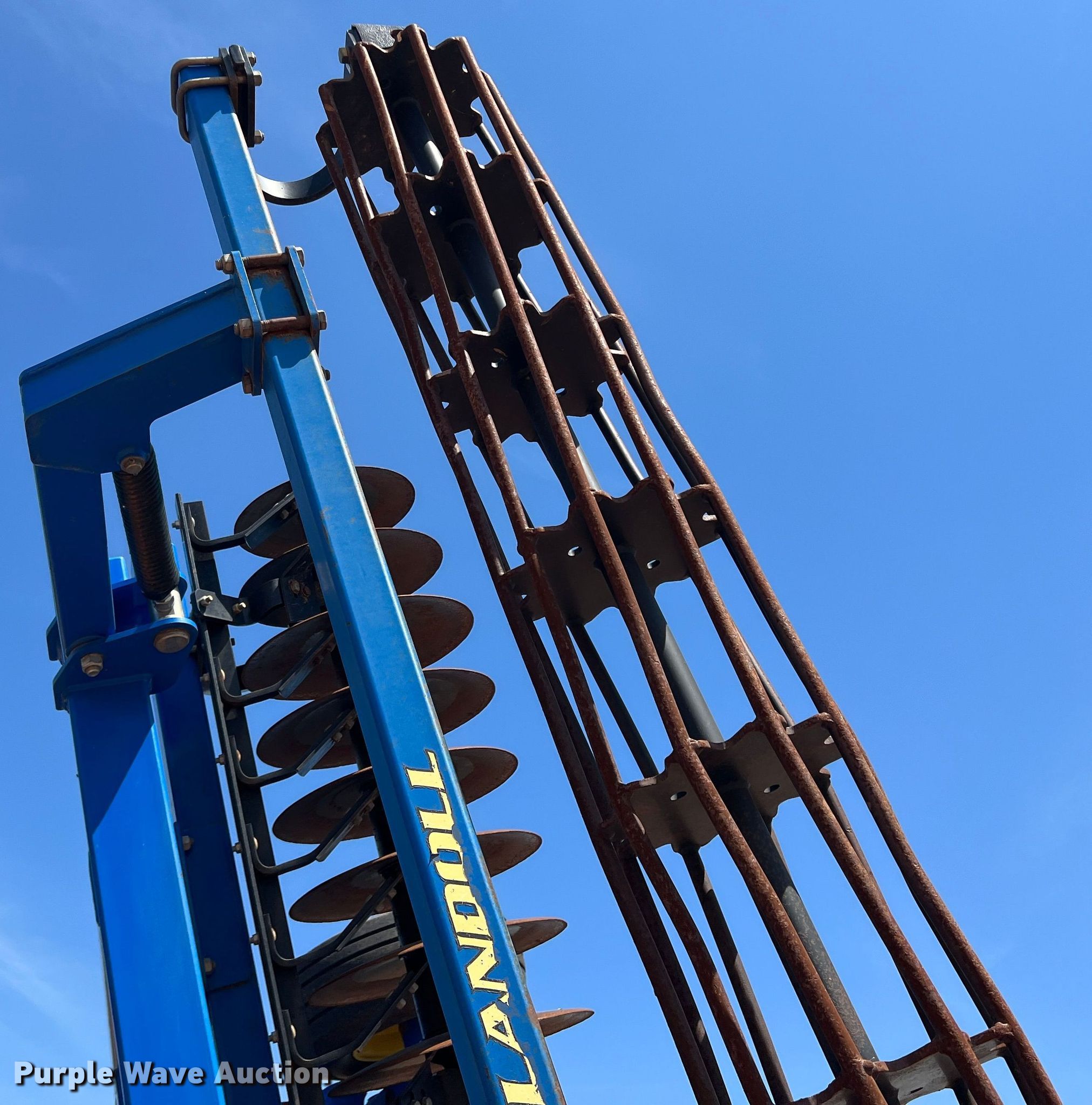 2012 Landoll 7431-33 vertical tillage. Overall width: 33', Serial: 74E1203000. Features Front blades Diameter: 22", Spacing: 7", Rear blades Diameter: 22", Spacing: 7", Operation Hydraulic lift, Hydraulic fold, Leveler: Hydraulic, Walking tandem axle, Attachments Reel/ rolling basket, Transport lights. Tires Tire size: 32x15.50-16. Miller Family Farms LLC. 21246 SCR 162 Rd. Headrick, OK 73549