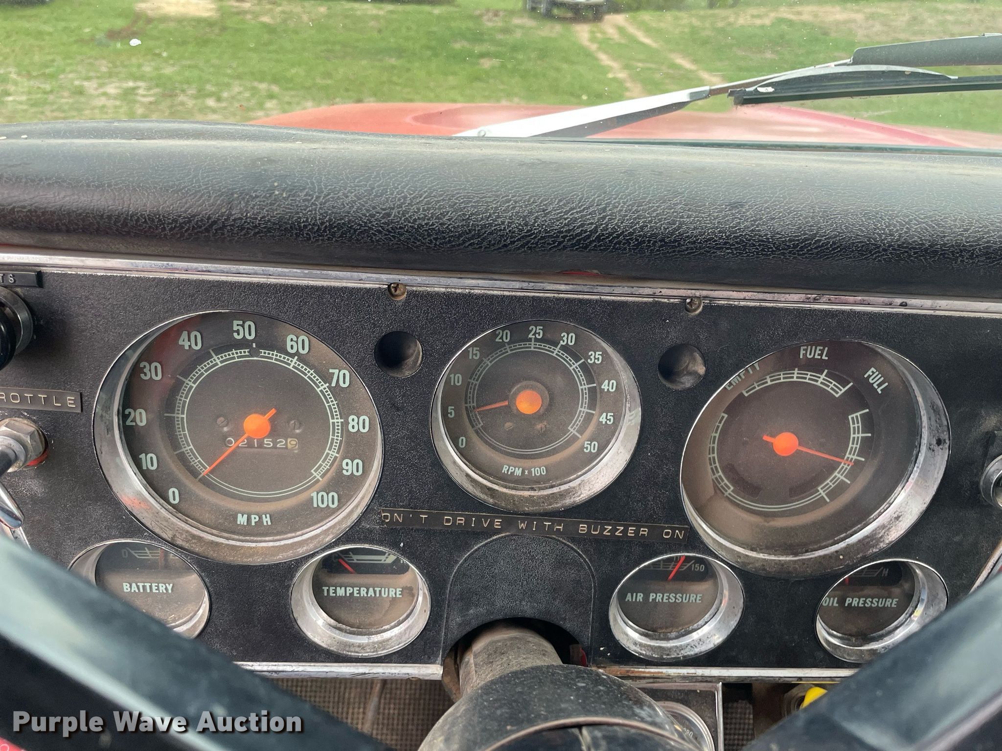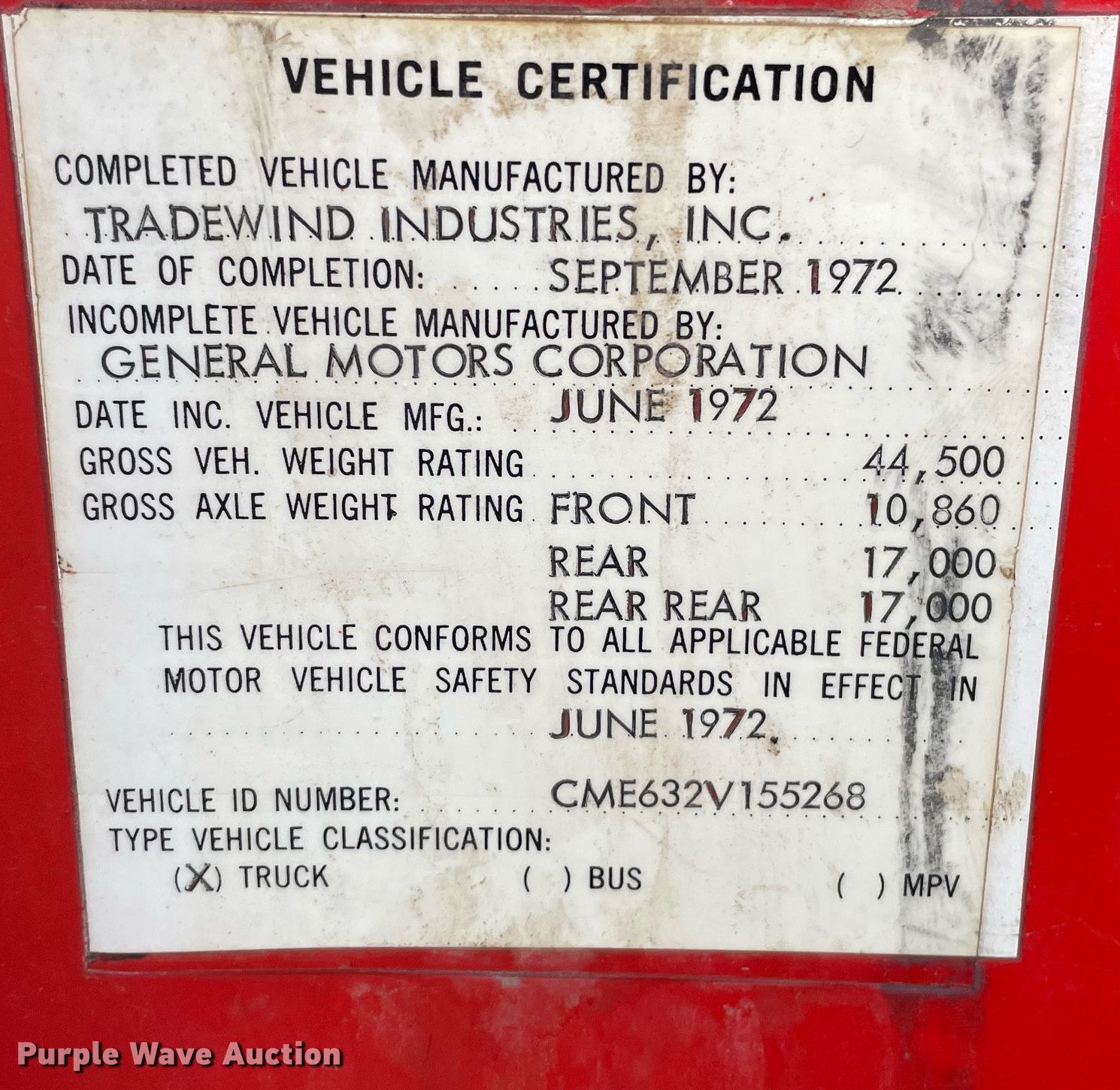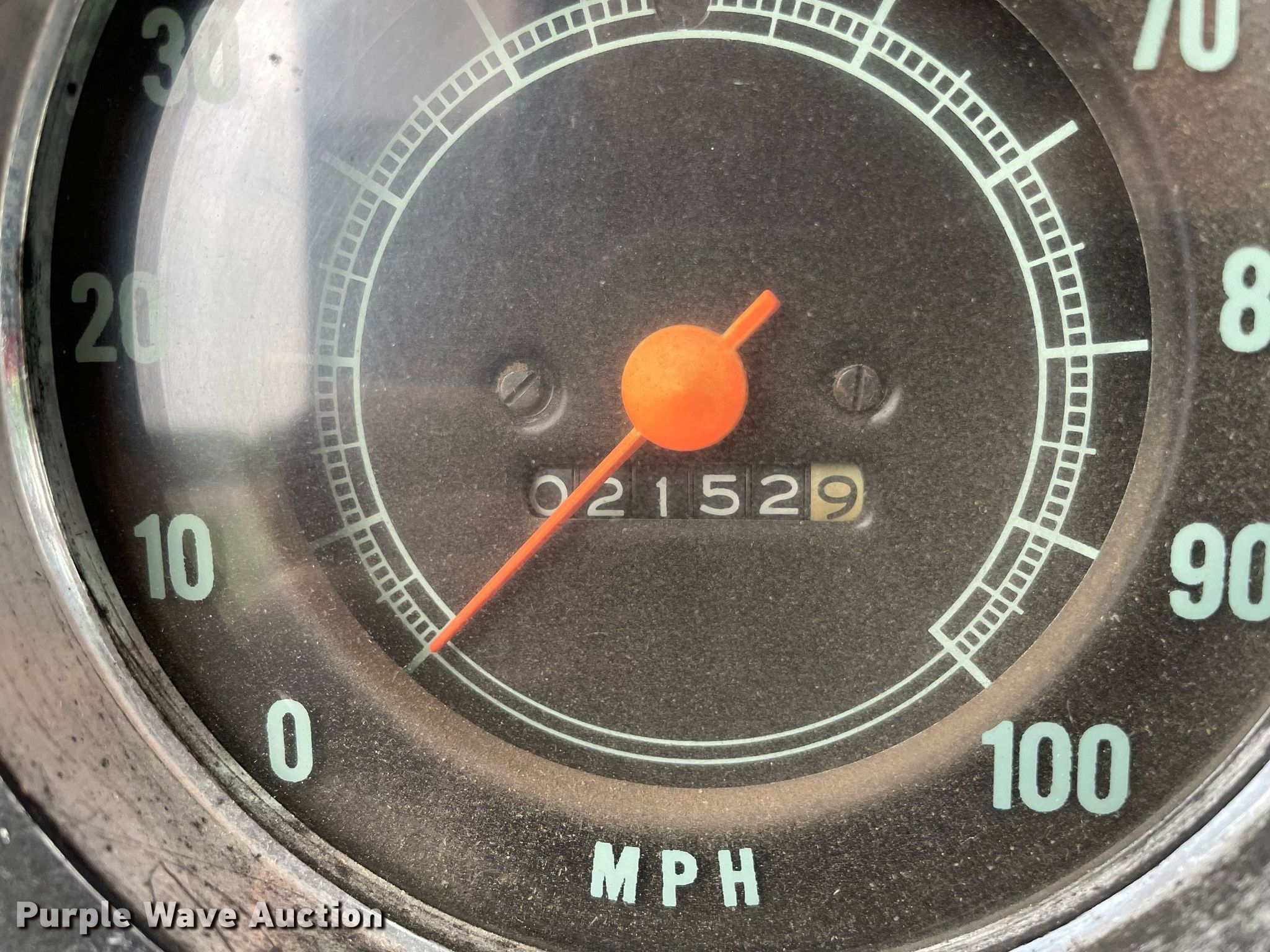 1972 Chevrolet C60 grain truck. Miles: 2,153 on odometer, VIN: CME632V155268. Engine Displacement: 427 C.I.D., Cylinders: 8, Fuel type: Gas. Transmission Manual, Speed: 5. Chassis Axles: Tandem, Suspension: Spring over walking beam, Brakes: Air, PTO, GVWR: 44,500 lbs. Interior Heat. Features Dump bed 20' L x 92" W, Side height: 52", Bed type: Steel, Roll tarp, Ram: Dual, End gate: Manual. Tires Size: 10.00-20. Notes Non-operational heater. Kansas antique title. Title distribution may be delayed up to 30 days from verification of funds. Kingman, KS 67068