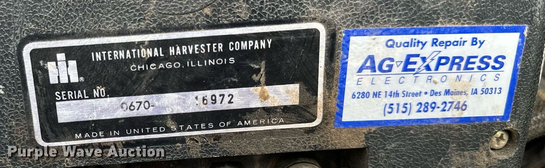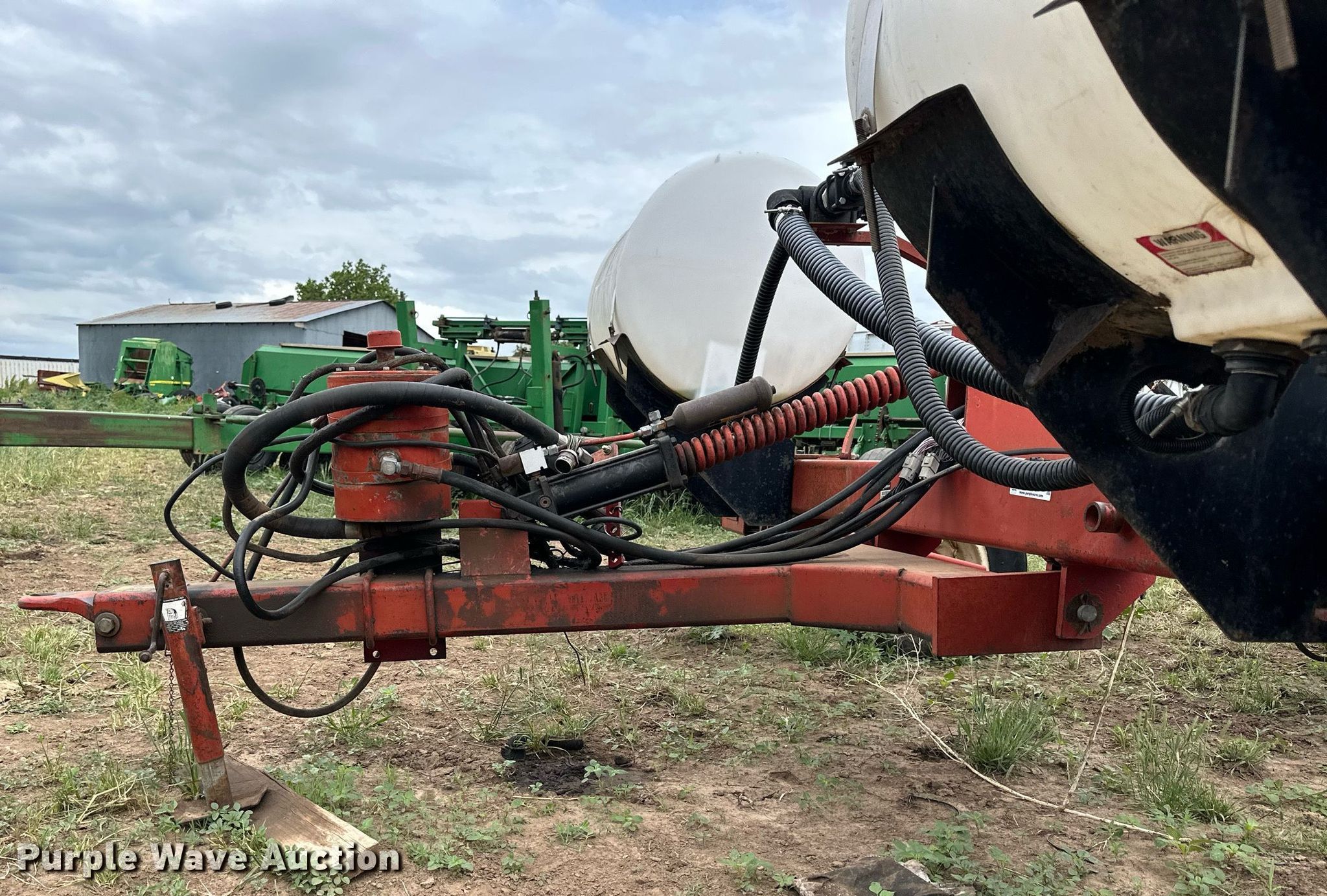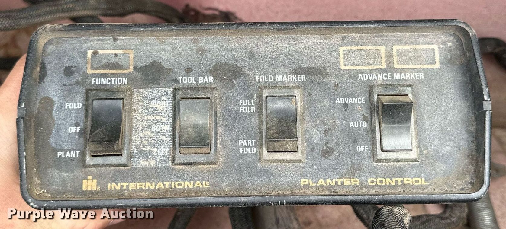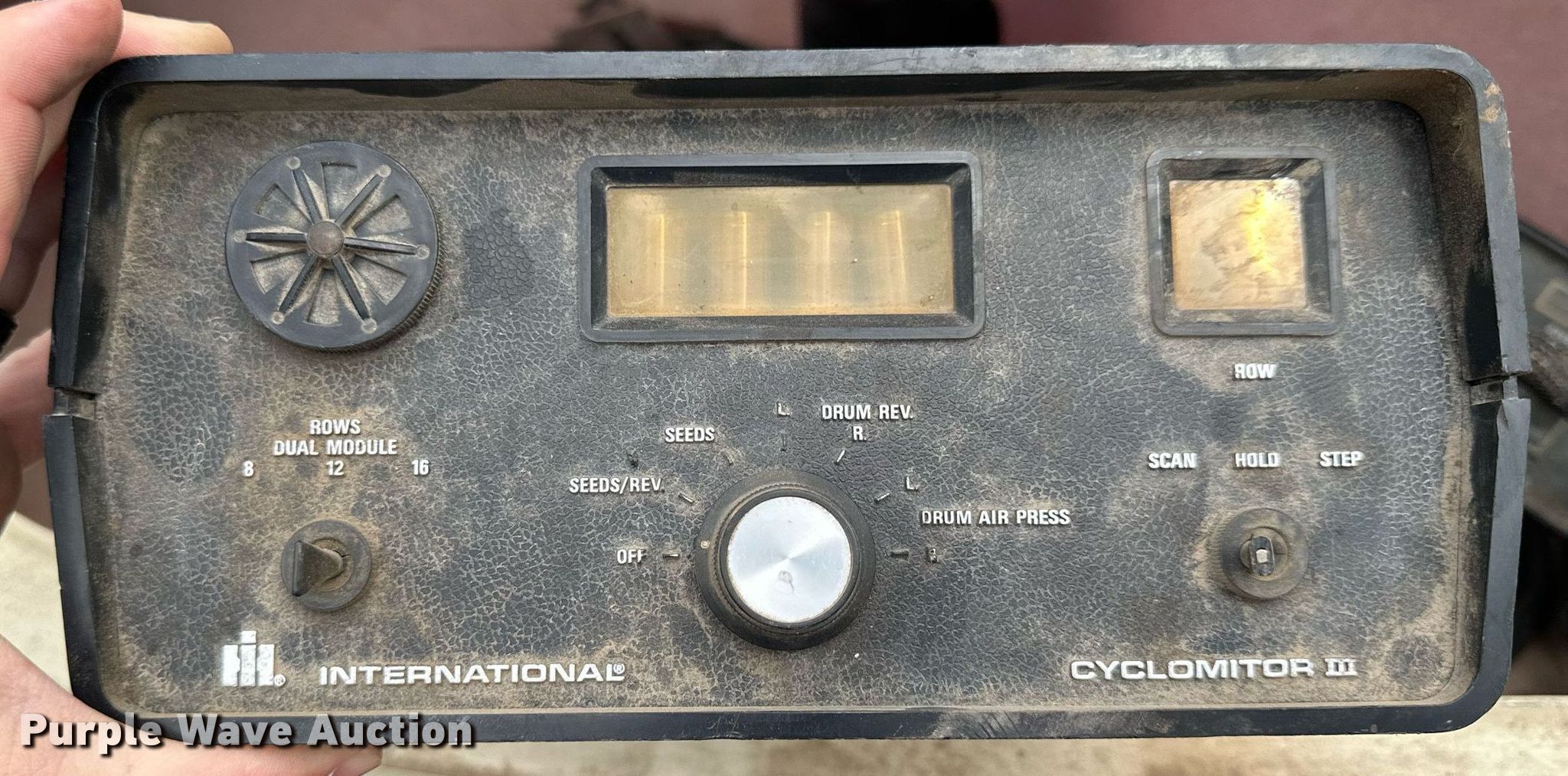 International 800 Cyclo Air planter. Row units: 12, Row spacing: 30", Serial: 970783U018847. Features Hydraulic PTO pump PTO: 1000, Frame Marker arm, Hydraulic fold Wing fold, Seed delivery Bulk fill system, Row units Vacuum metering, Meter drive: Hydraulic, Seed meters: Corn, Soybeans, Down pressure: Spring, Row cleaners, Disk openers: Double, Gauge wheels: Double, Closing system: Single Type: Rubber, Fertilizer/ insecticide Fertilizer Liquid capacity: 220 gallons, Electronics Monitor International Cyclometer III Serial: 0670, Rate controller Serial: 10390.. Tires Transport tire size: 9.5-14 Quantity: 4, Drive/ outside tire size: 9.5-14 Quantity: 4. Notes Hydraulic hose leak. Delphos, KS 67436