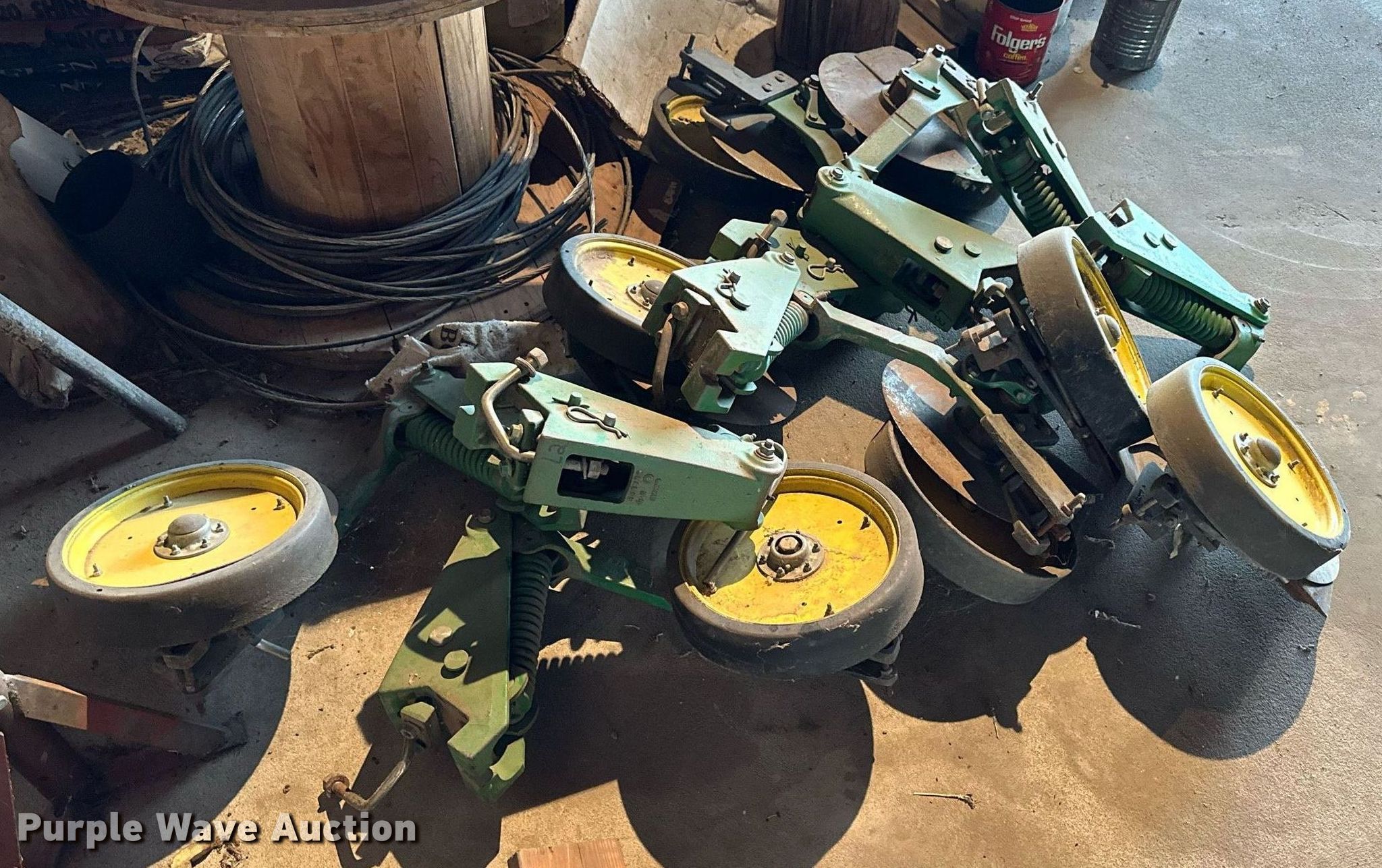 John Deere 7200 MaxEmerge 2 planter. Width: 20', Row units: 8, Row spacing: 30", Serial: A07200E201670. Features Frame Marker arm, Seed delivery Individual seed hoppers, Row units Meter drive: Ground, Down pressure: Spring, Row cleaners, Disk openers: Double, Closing system: Double Type: Rubber, Fertilizer/ insecticide Fertilizer Liquid capacity: 200 gallons.. Tires Transport tire size: 7.60-15 Quantity: 4. Notes Operators manual, Additional parts (8) coulters and more. 995 Front Street. Grainfield, KS 67737