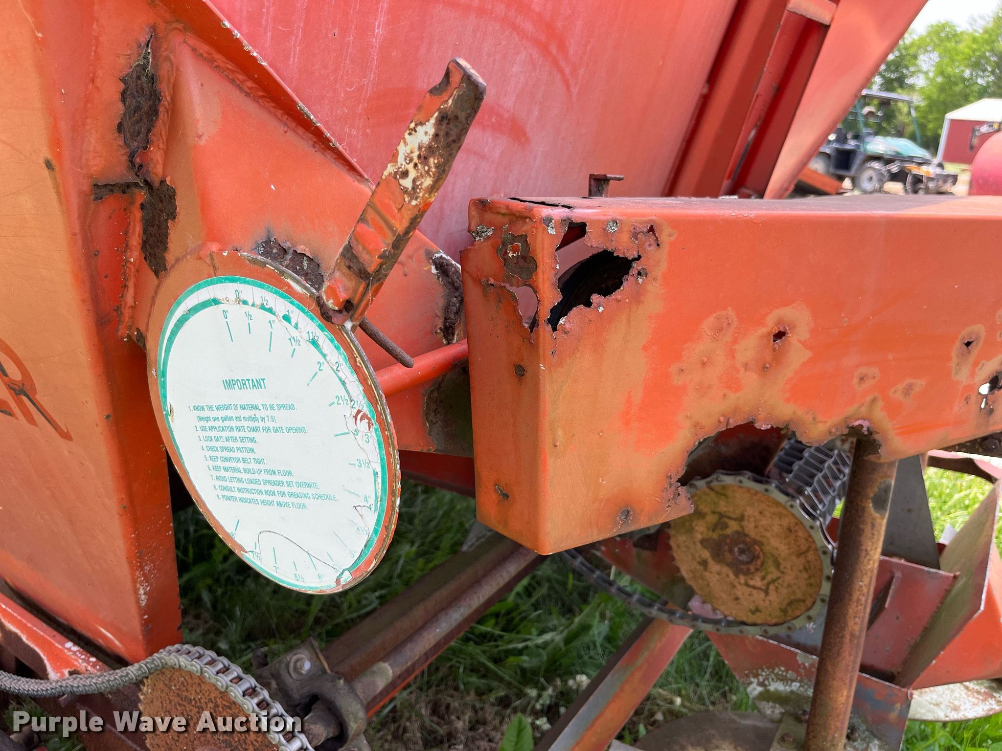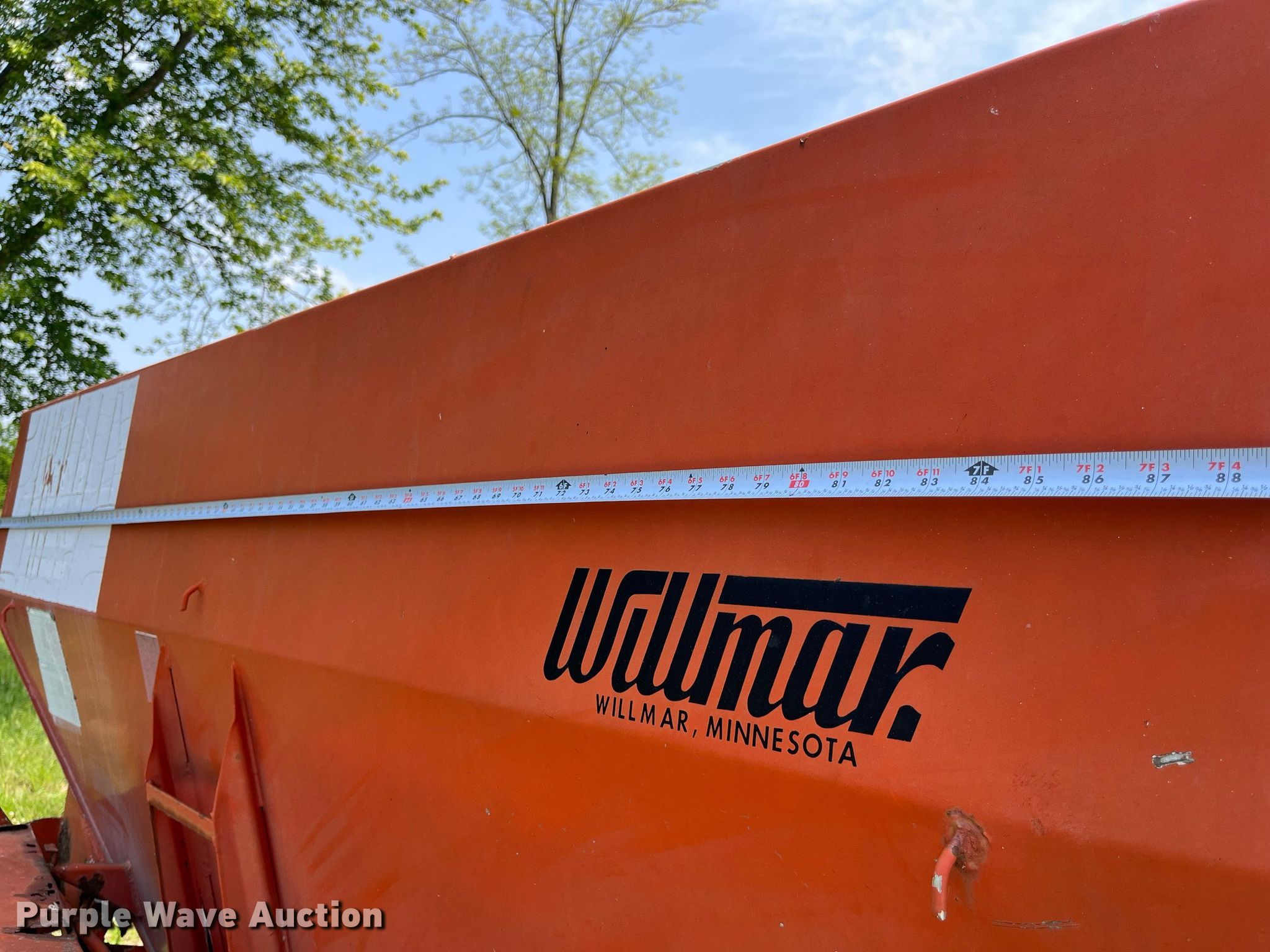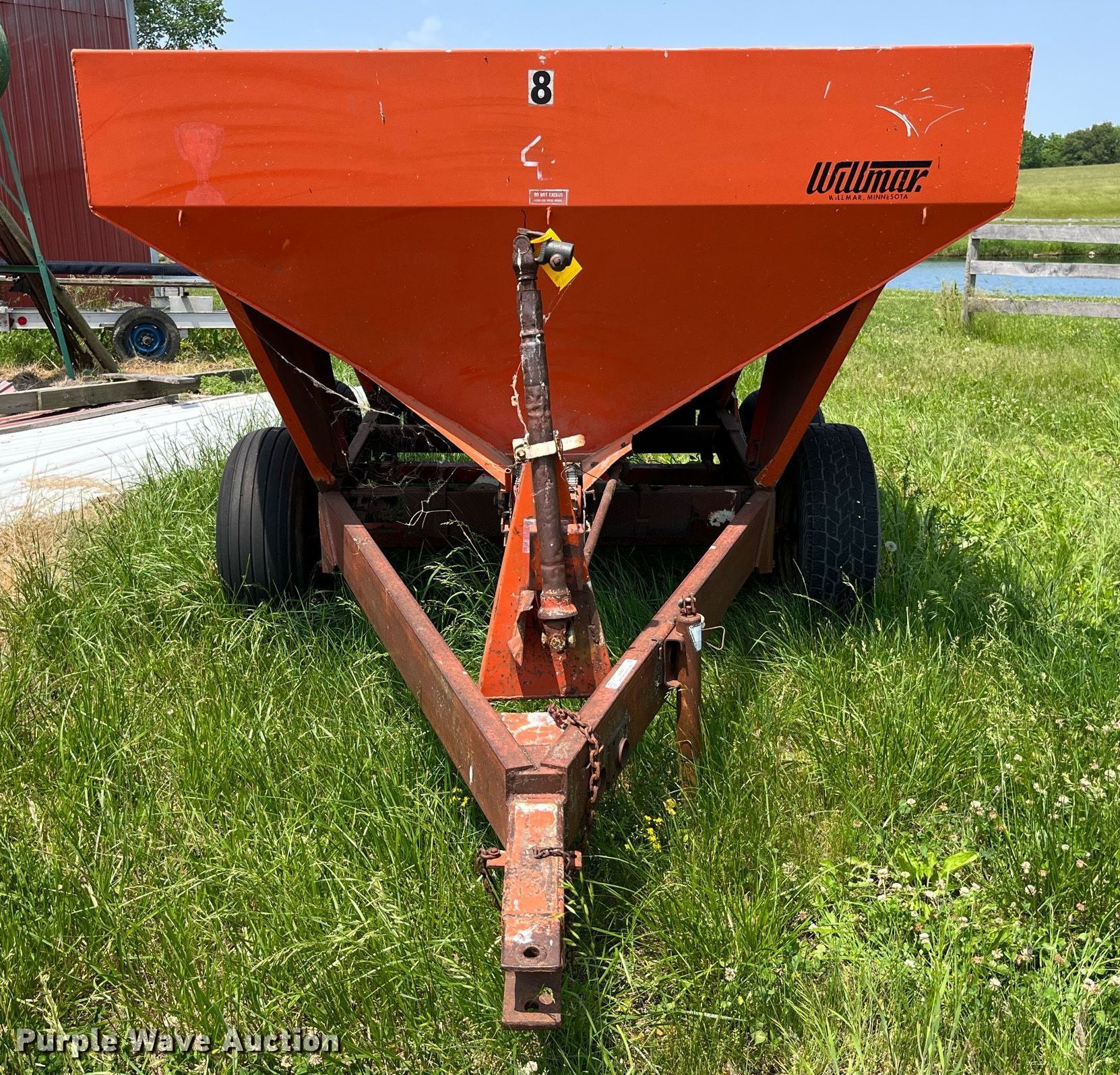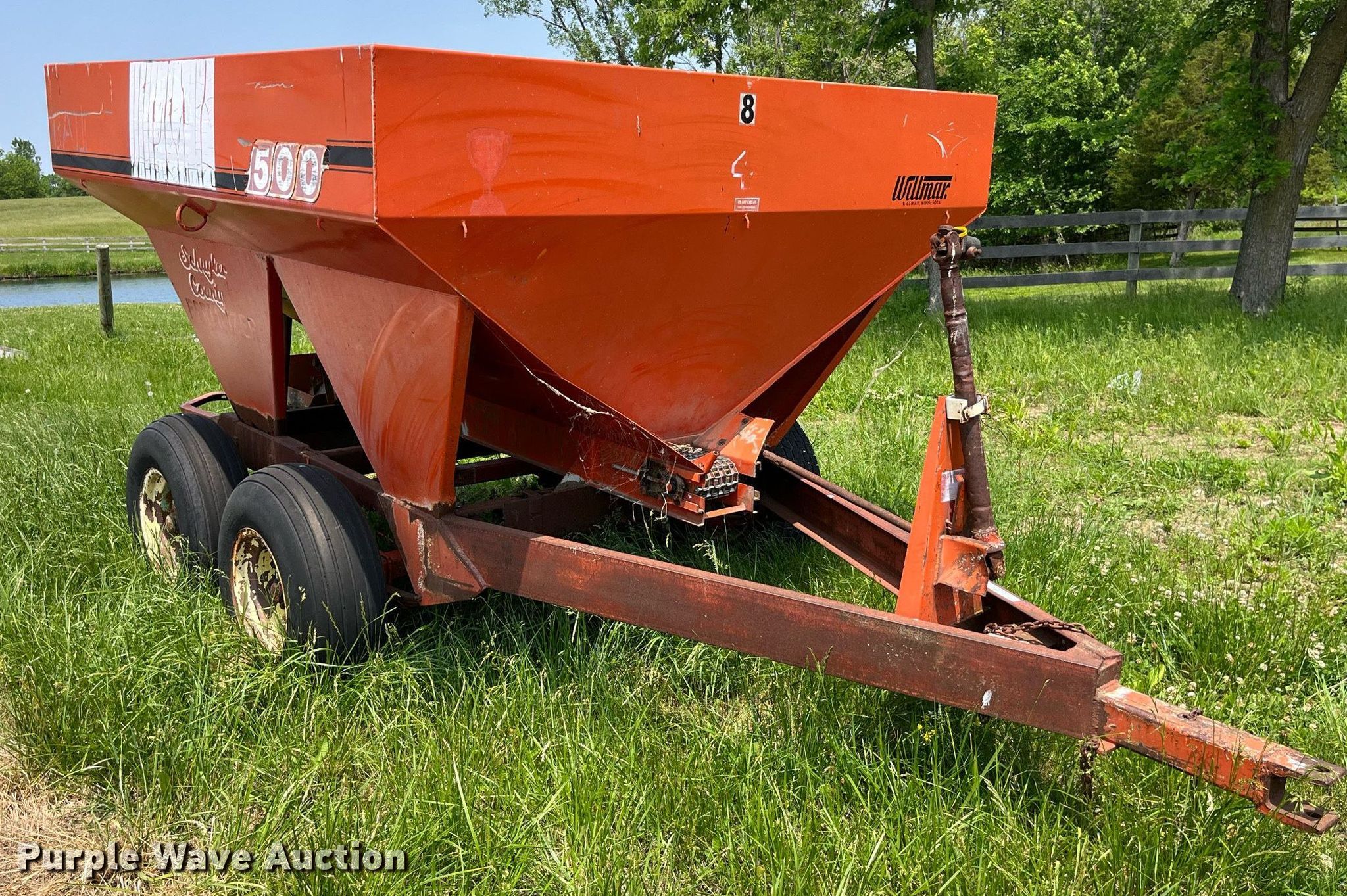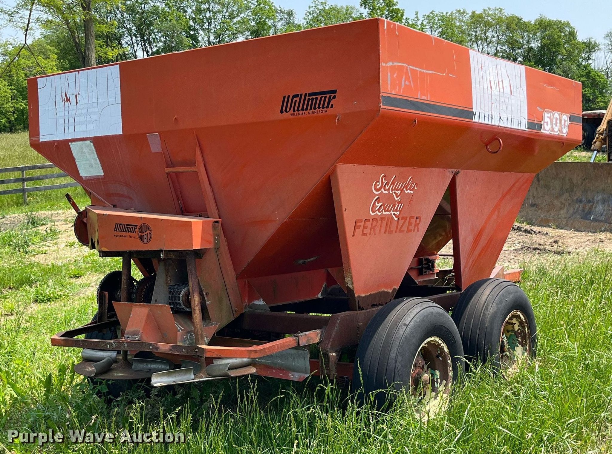 Purple Wave is selling a used Applicator Pull Type in Illinois. This item is a Willmar 500 spreader with the following: Hopper: 96"L x 92"W, PTO: 540, Dual spinners, Chain conveyor, Width: 7"