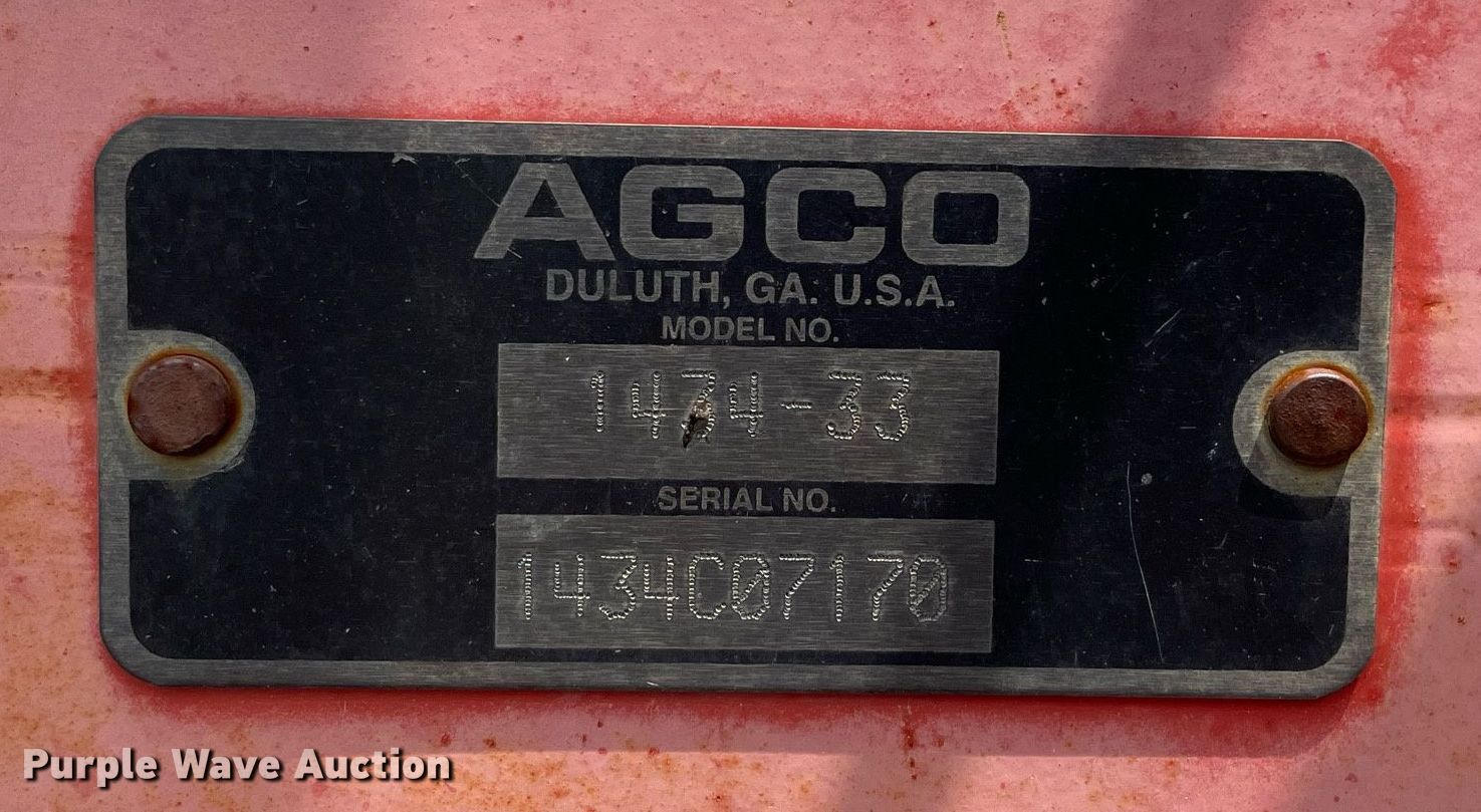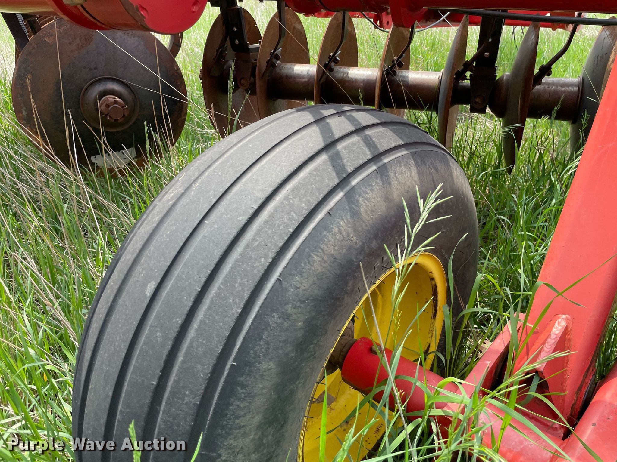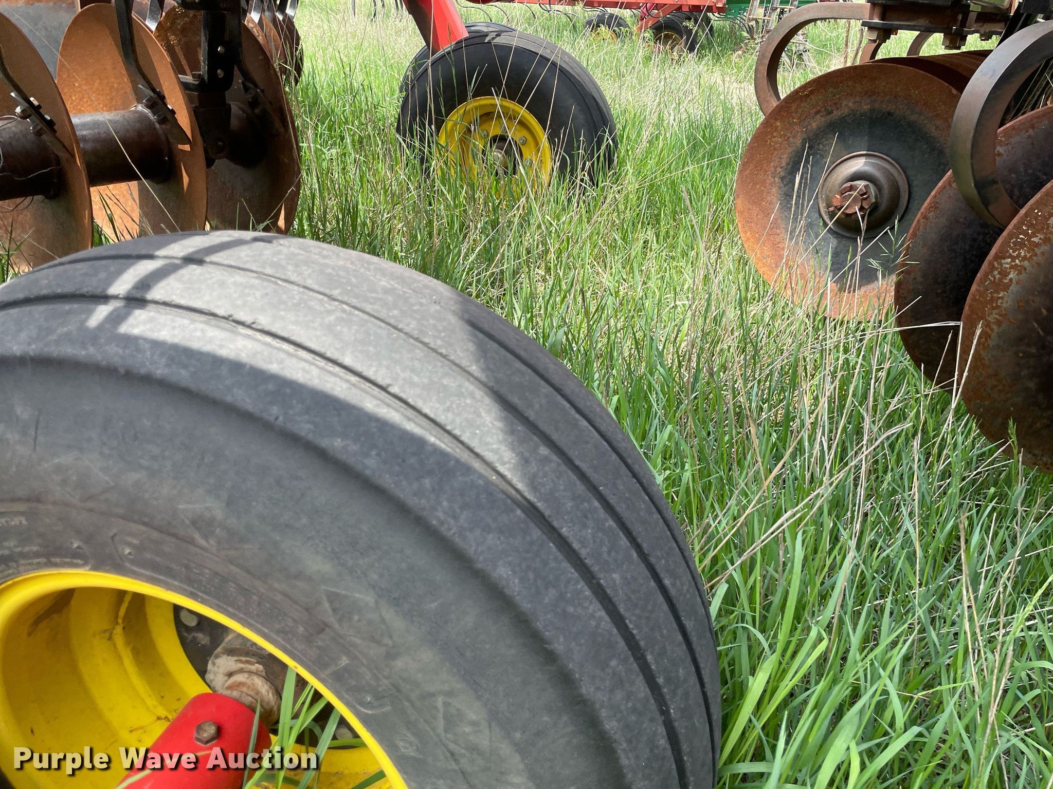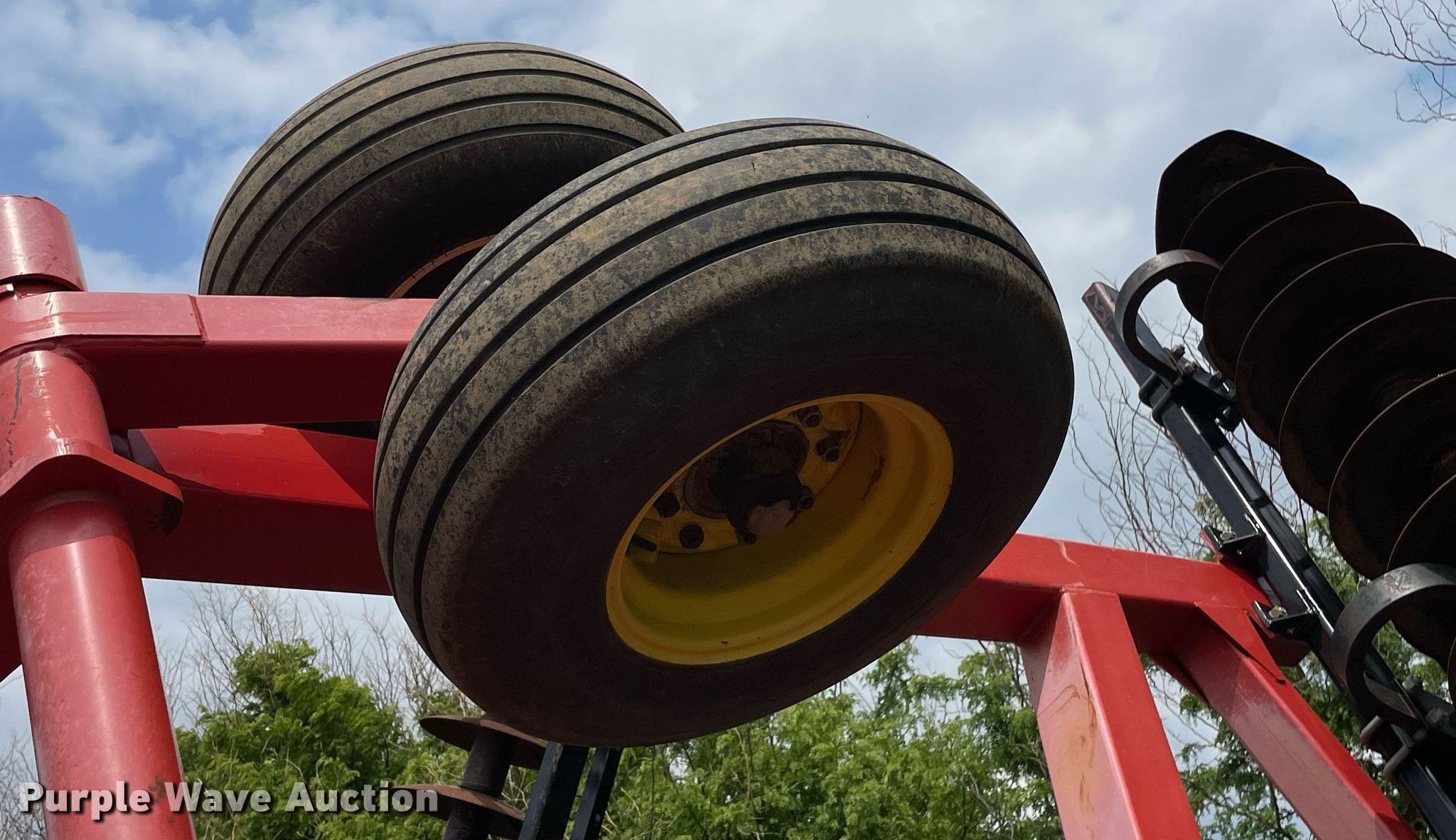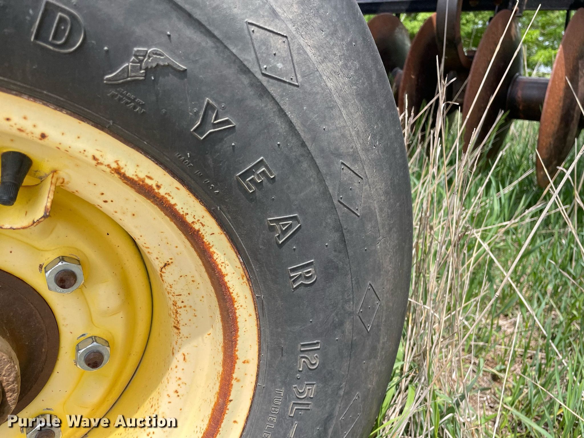 Sunflower 1434-33 tandem disk. Overall width: 33', Serial: 1434C07170. Features Front blades Diameter: 22", Spacing: 9", Rear blades Diameter: 22", Spacing: 9", Disk scrapers, Operation Hydraulic lift, Hydraulic fold, Leveler: Hydraulic. Tires Tire size: 12.5L-15. Estate of Ernest E Habiger. Wilson, KS 67490