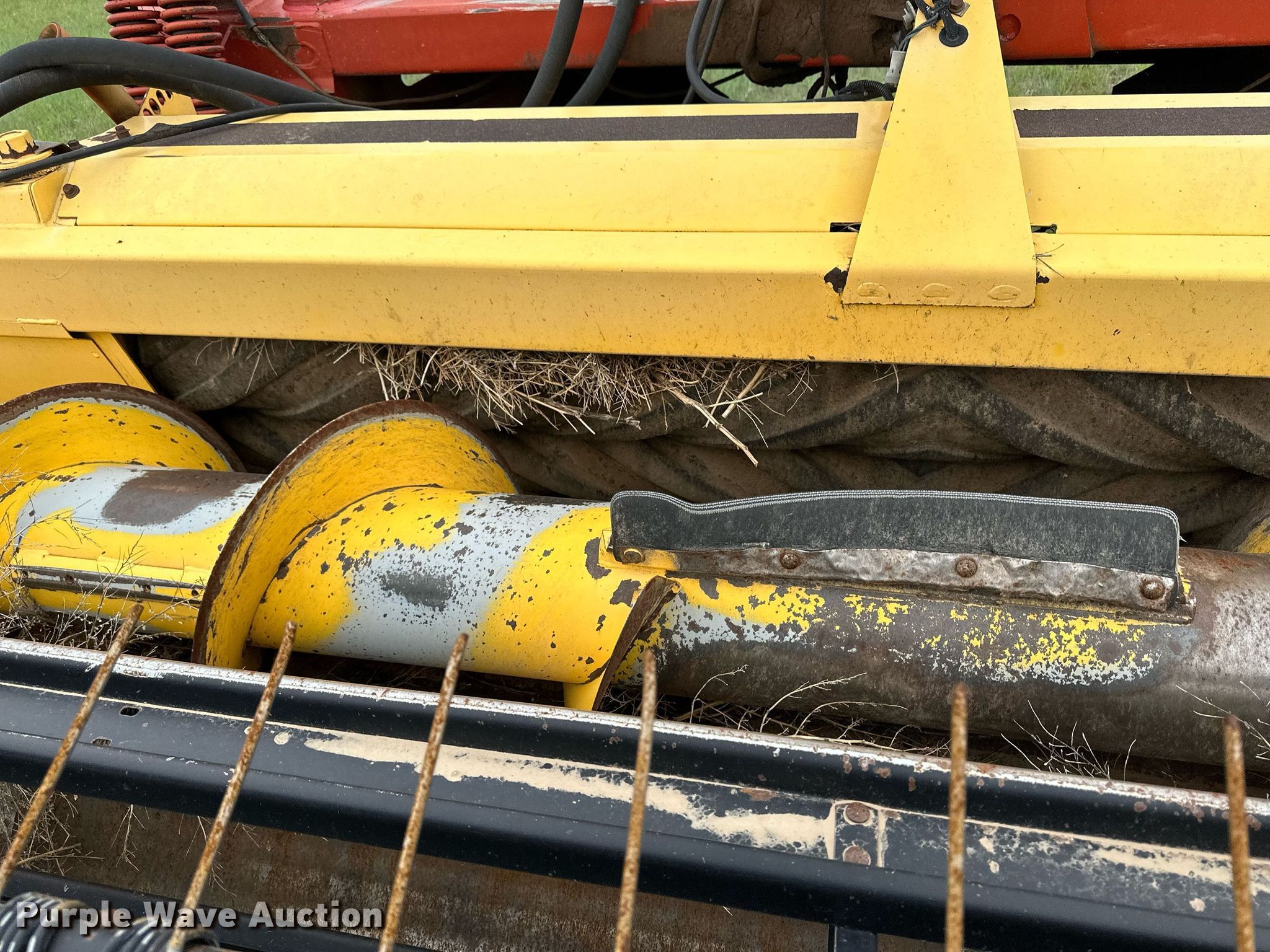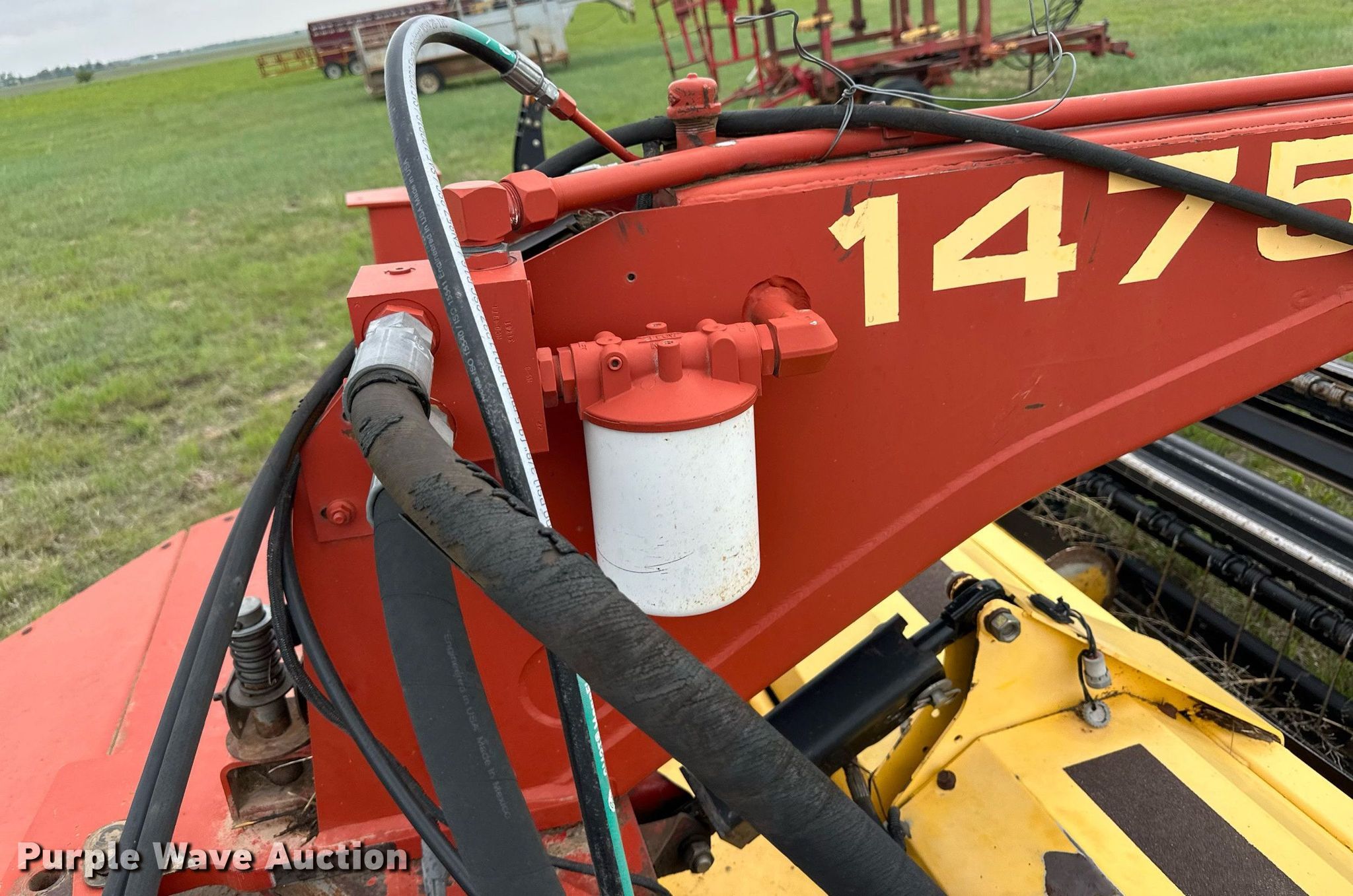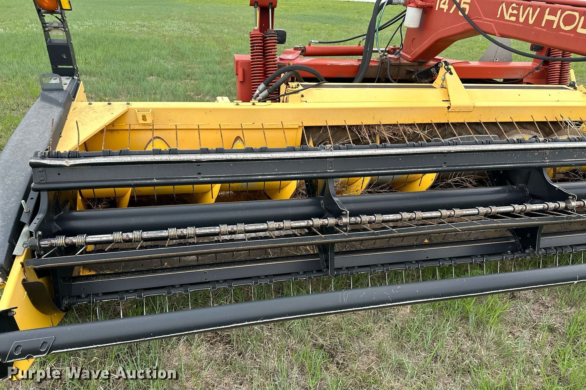 New Holland 1475 swather / windrower. Serial: 1120035. Features PTO: 1000, Hydraulic PTO pump, Center pivot, Hitch Draw bar, Head Sickle, Draper, Width: 18', Hydraulic head tilt, Conditioners: Rubber/ rubber. Tires Size: 31x13.50-15. Hanston, KS 67849