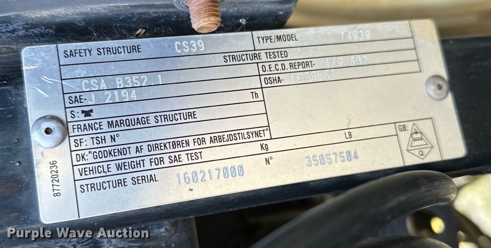 New Holland T4030 tractor. Hours: 2,590 on meter, Miles or hours may vary, unit still in use, Serial: ZBJA01760. Engine Cylinders: 4, Fuel type: Diesel. Transmission Synchro, 16F - 16R, Differential lock. Operators station AC, Heat. Features PTO: 540, Three point, Seven pin outlet, Hydraulic remote sets Front: 1, Rear: 2, Loader Controls: Joystick. Tires Front: 9.5-15-2, Rear: 16.9R30. 923 State Highway 282. Mountainburg, AR 72946
