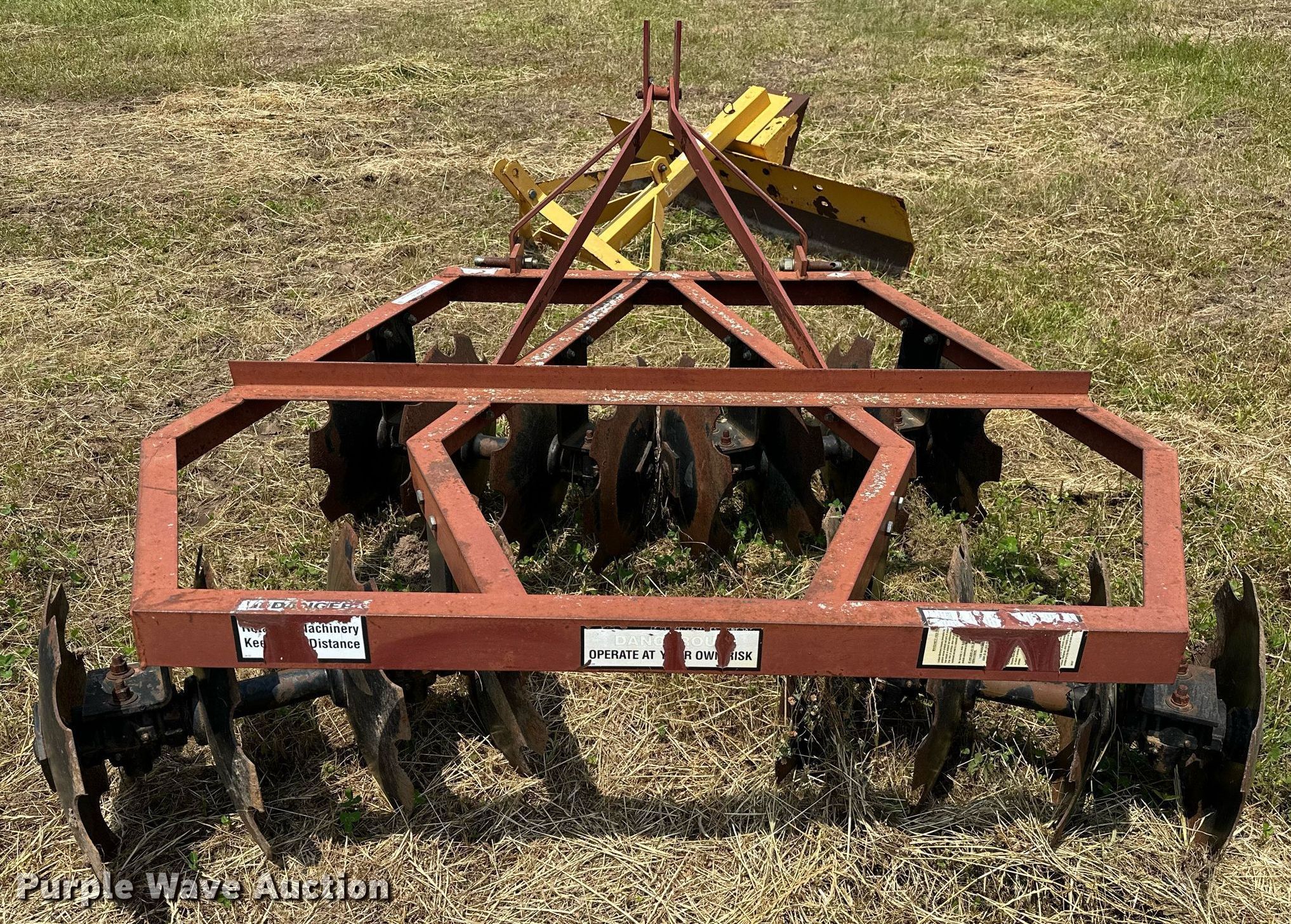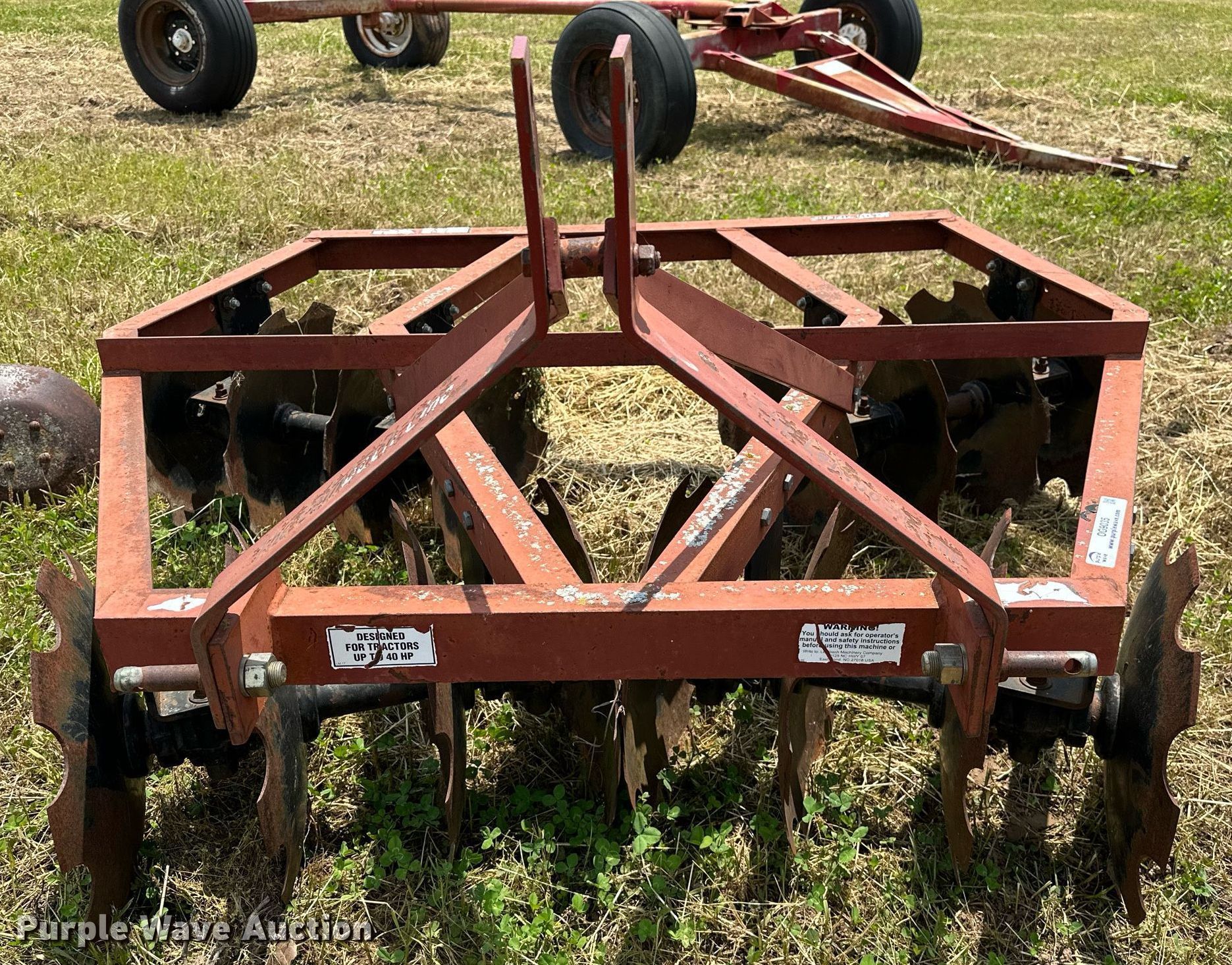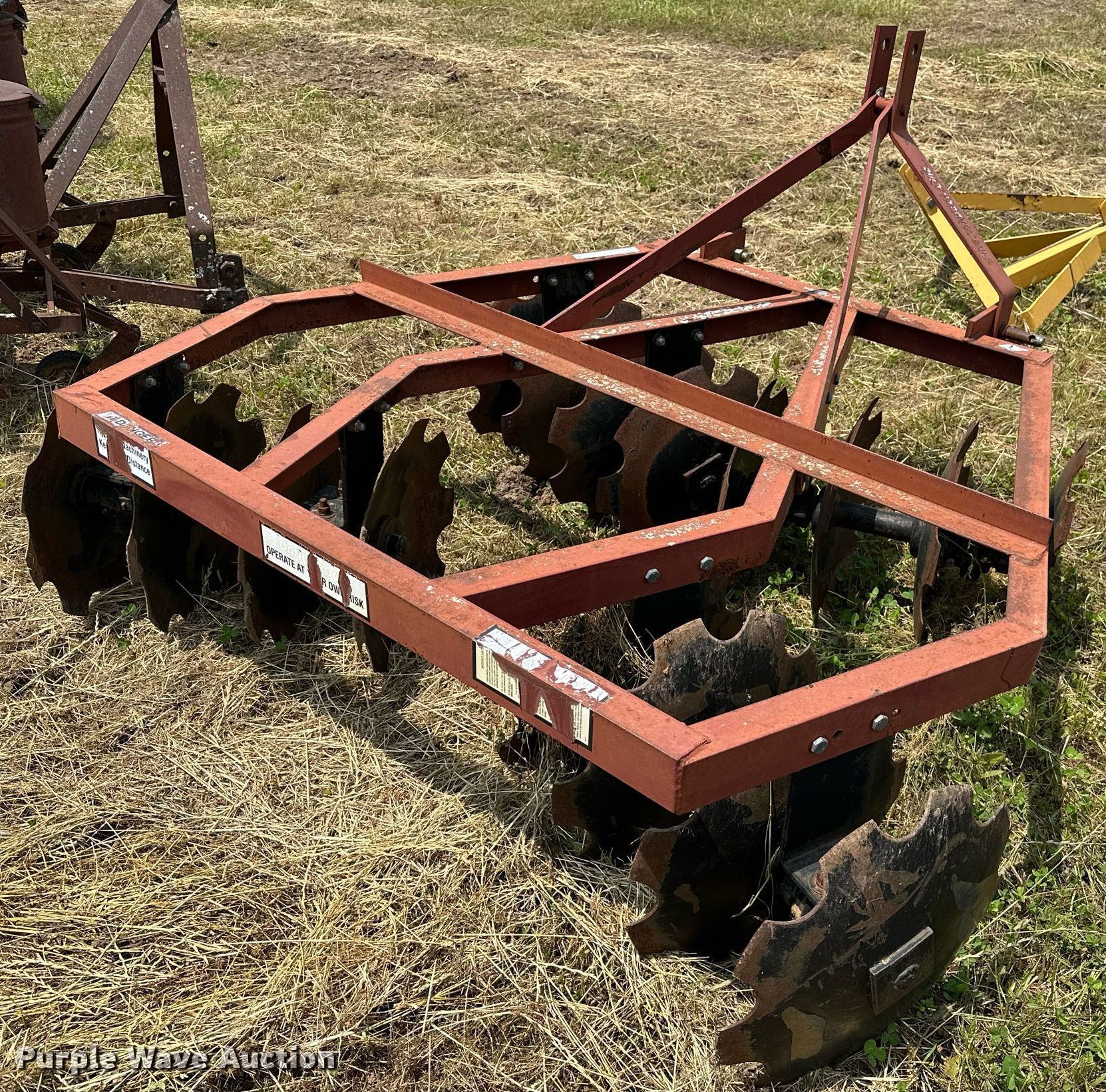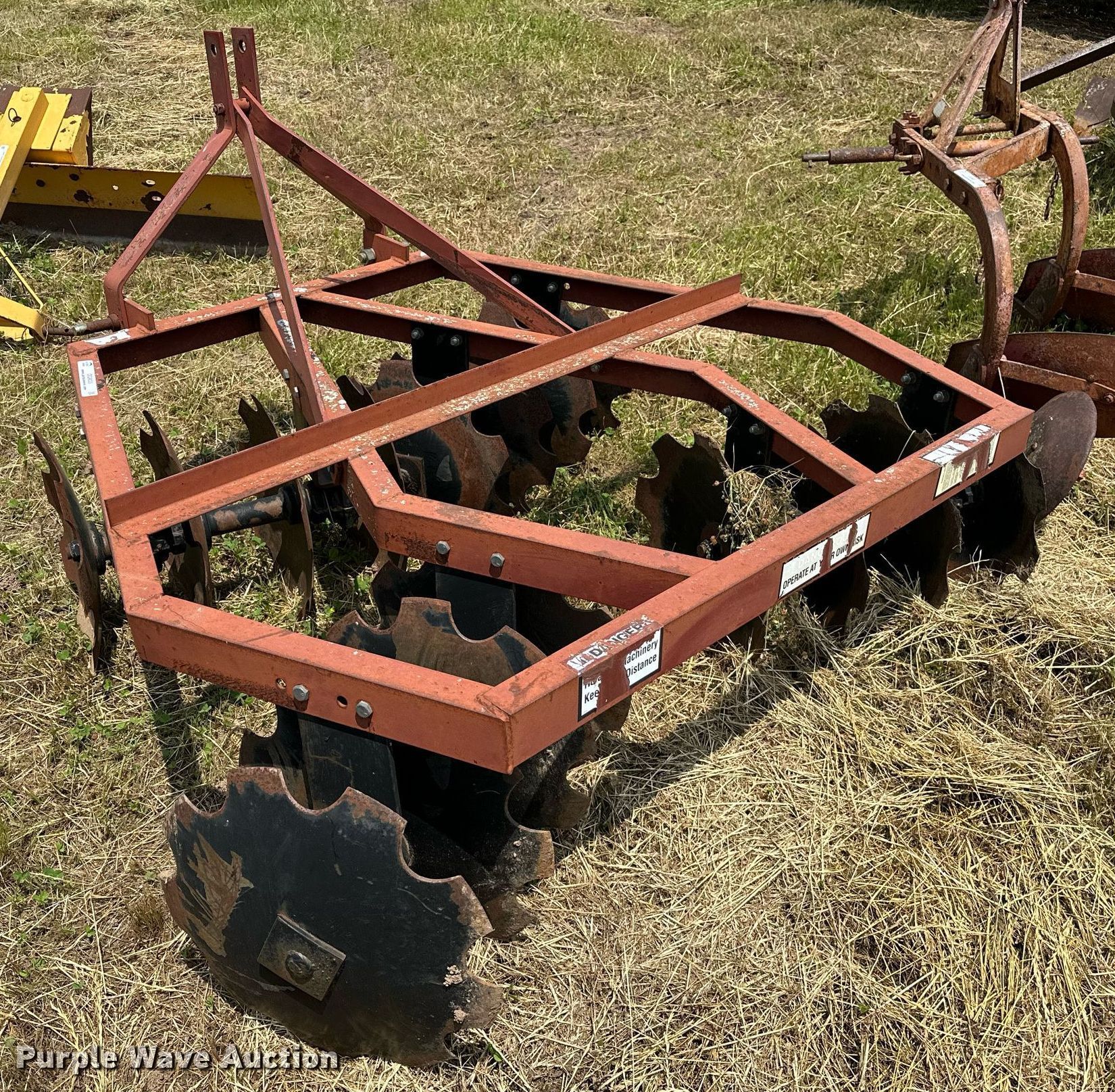 Tandem disk. Overall width: 6'. Features Front blades Diameter: 18", Spacing: 8", Rear blades Diameter: 18", Spacing: 8", Attachments Hitch: Three point. 100097 Oklahoma 56. Okemah, OK 74859