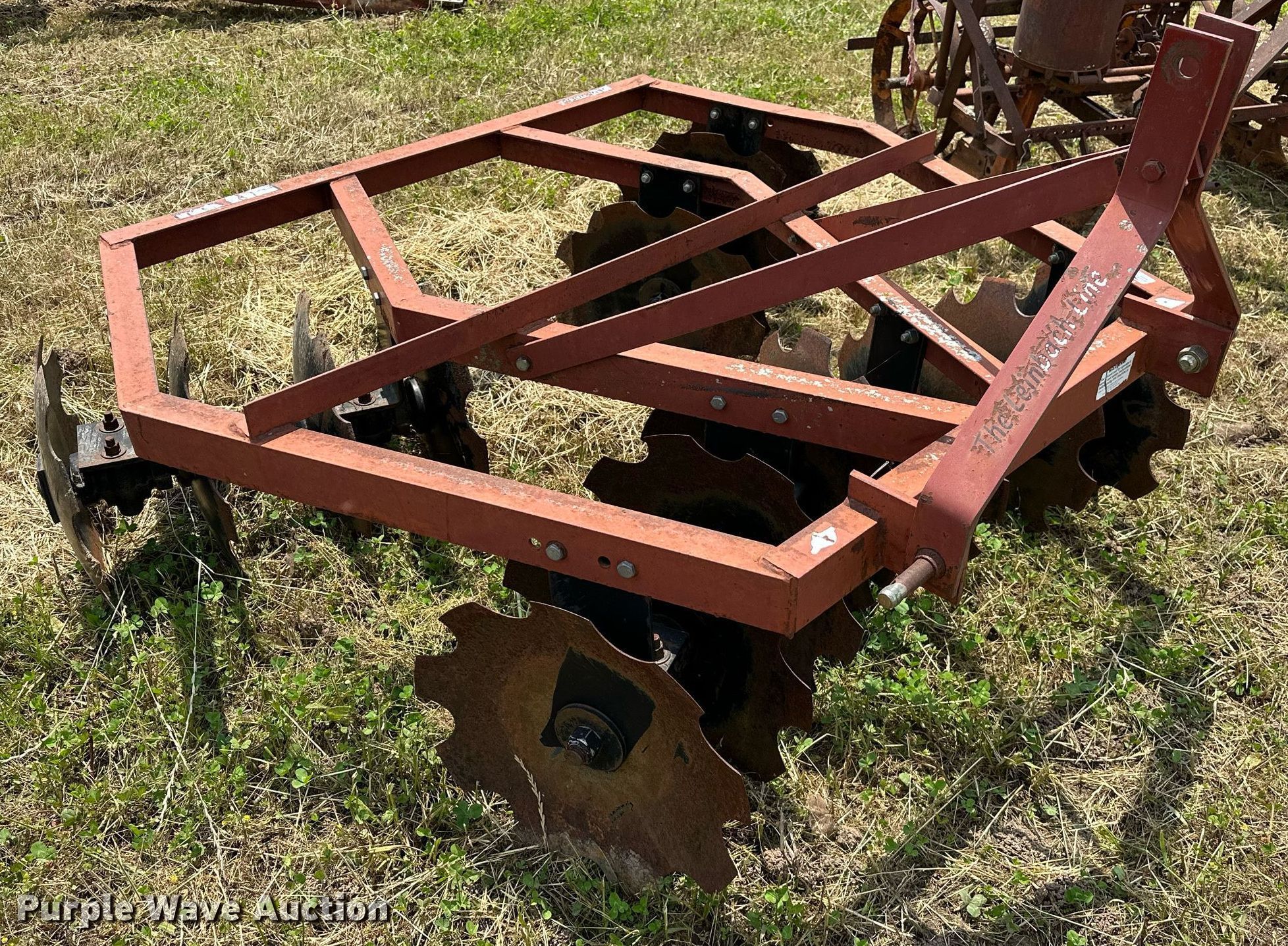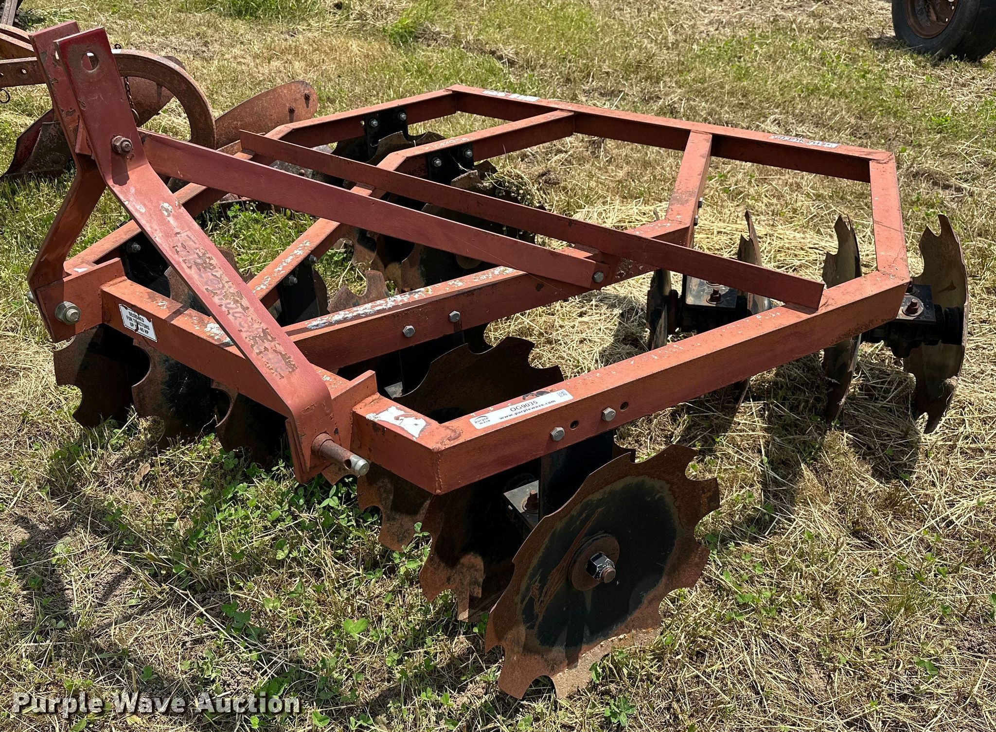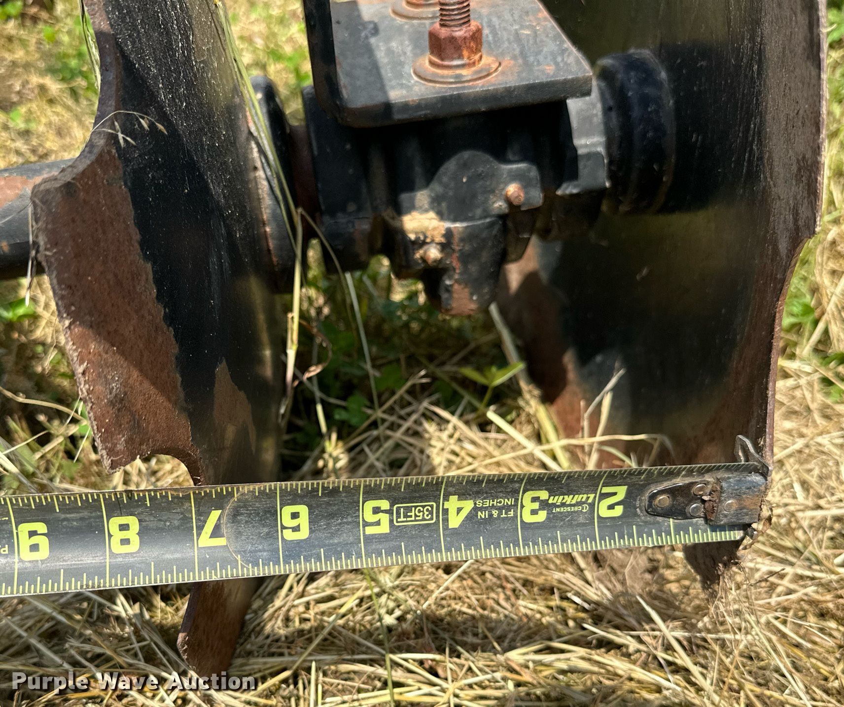 Tandem disk. Overall width: 6'. Features Front blades Diameter: 18", Spacing: 8", Rear blades Diameter: 18", Spacing: 8", Attachments Hitch: Three point. 100097 Oklahoma 56. Okemah, OK 74859