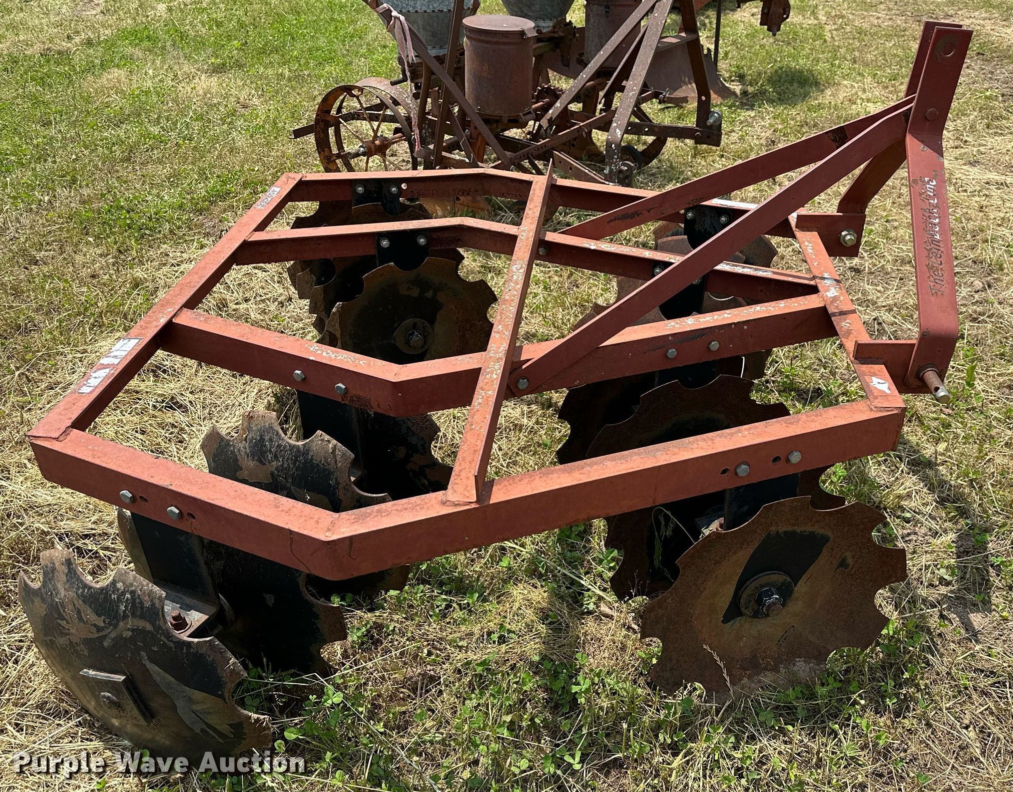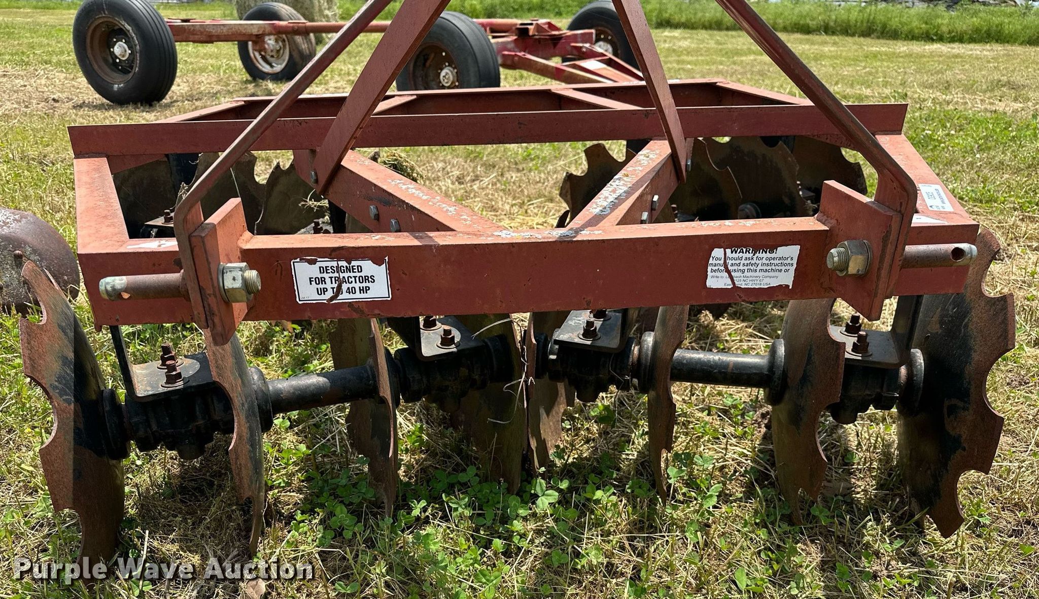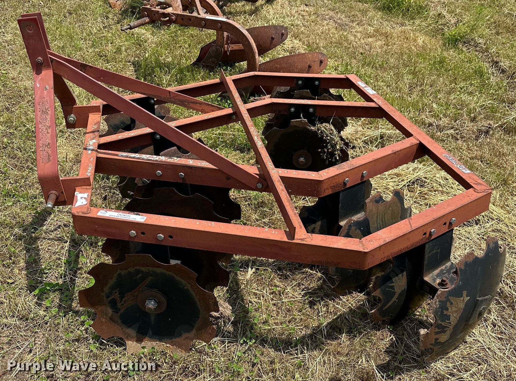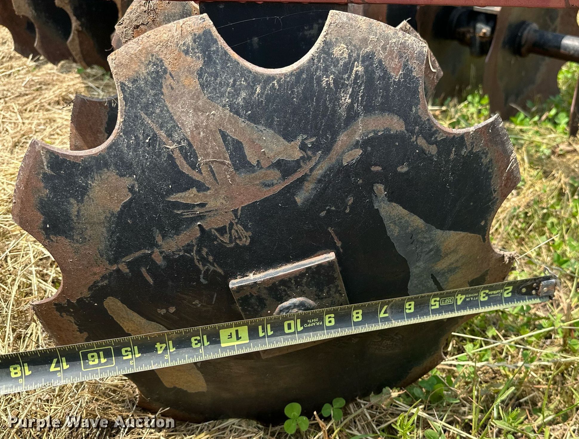 Tandem disk. Overall width: 6'. Features Front blades Diameter: 18", Spacing: 8", Rear blades Diameter: 18", Spacing: 8", Attachments Hitch: Three point. 100097 Oklahoma 56. Okemah, OK 74859