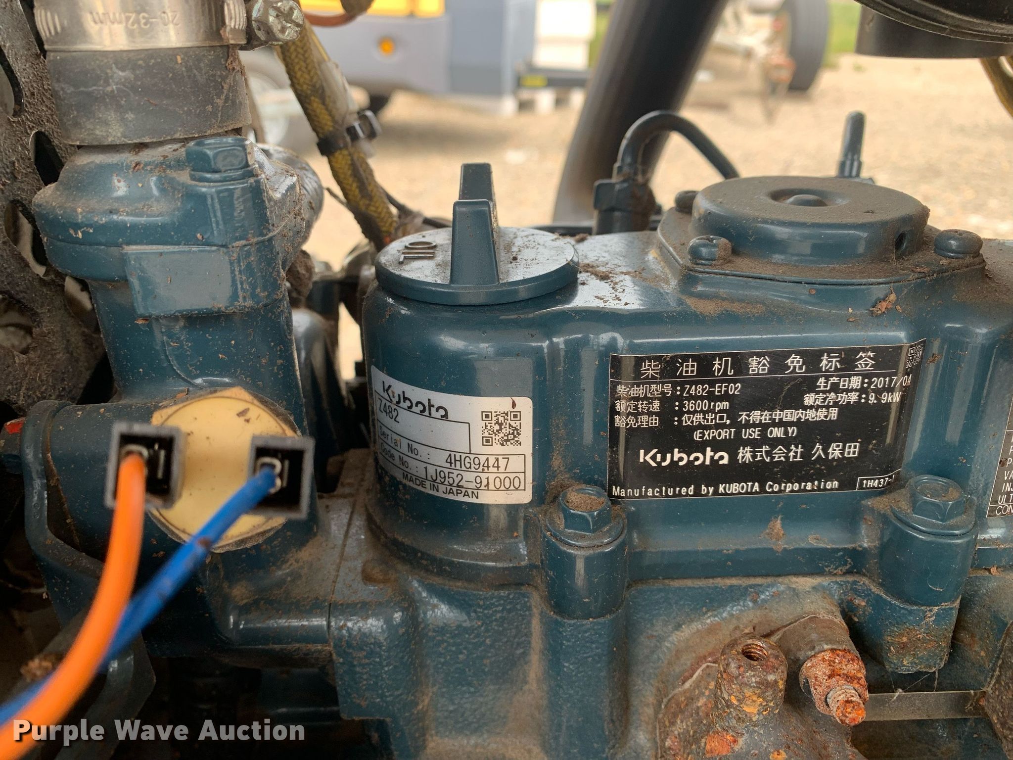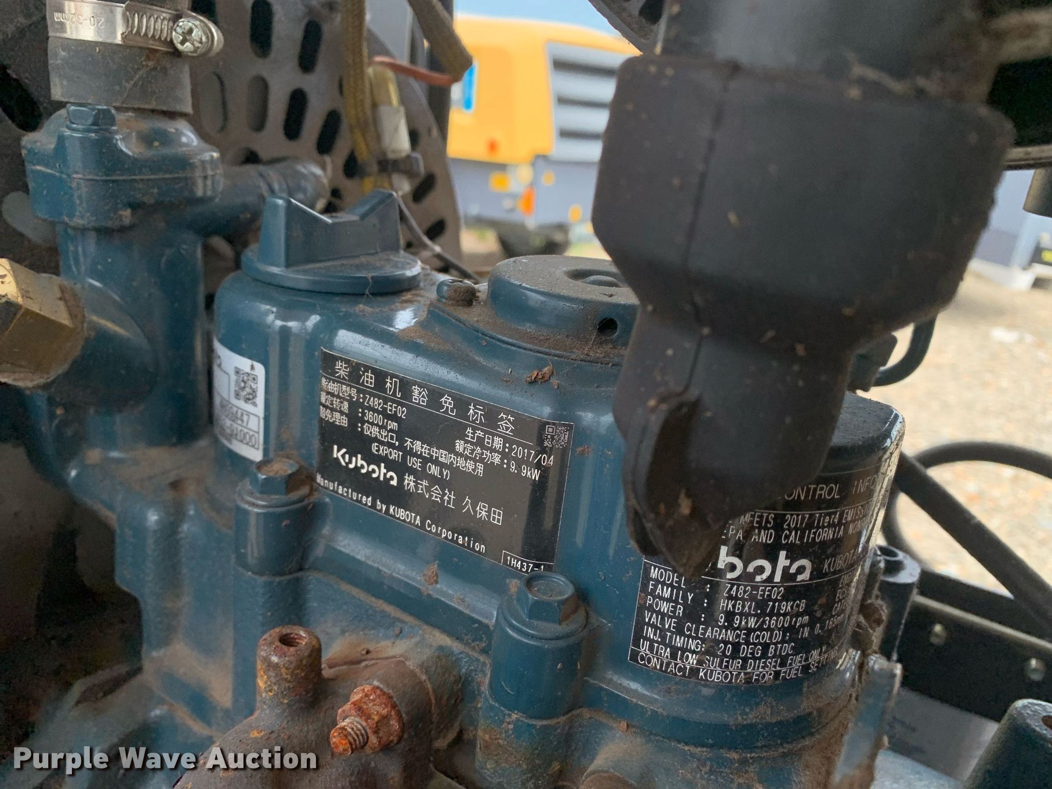2017 Atlas Copco V4 light plant. Hours: 655 on meter, VIN: YA3029882HW910420, Serial: WUX910420. Engine Kubota Z482-EF02, Serial: 4HG9447, Displacement: 0.479L, Cylinders: 2, Fuel type: Diesel, kW: 9.9. Features Bulbs: 4, Watts: 1,000, Tower height: 25', Hoist: Manual, Stabilizers. Trailer 2017 Atlas Copco, 8.5' L x 48" W, Ball hitch size: 2", Suspension: Spring, Axles: Single, GVWR: 700 lbs, GAWR: 900 lbs. This is worksite support equipment and will not come with a title. Transfer of ownership documentation will be a bill of sale. PPF - Open Inspection June 19 and 26. 700 FM 1335. Cooper, TX 75432