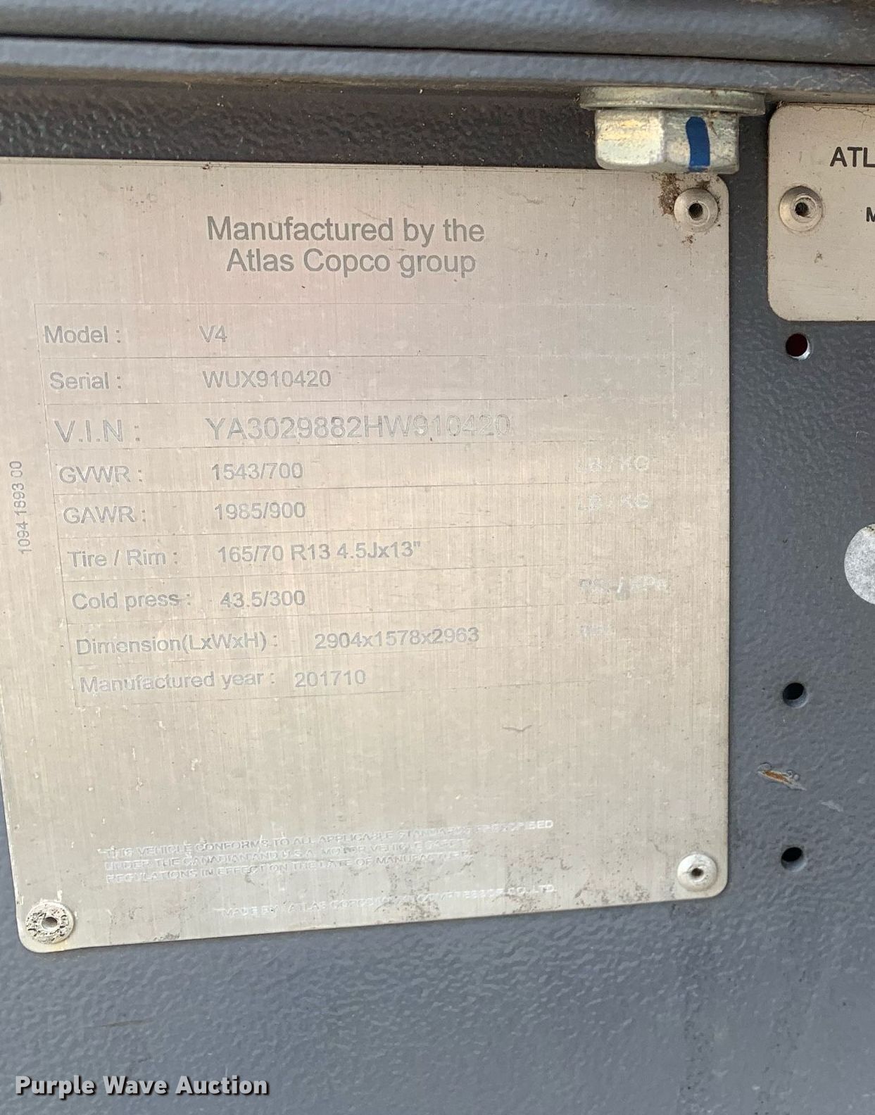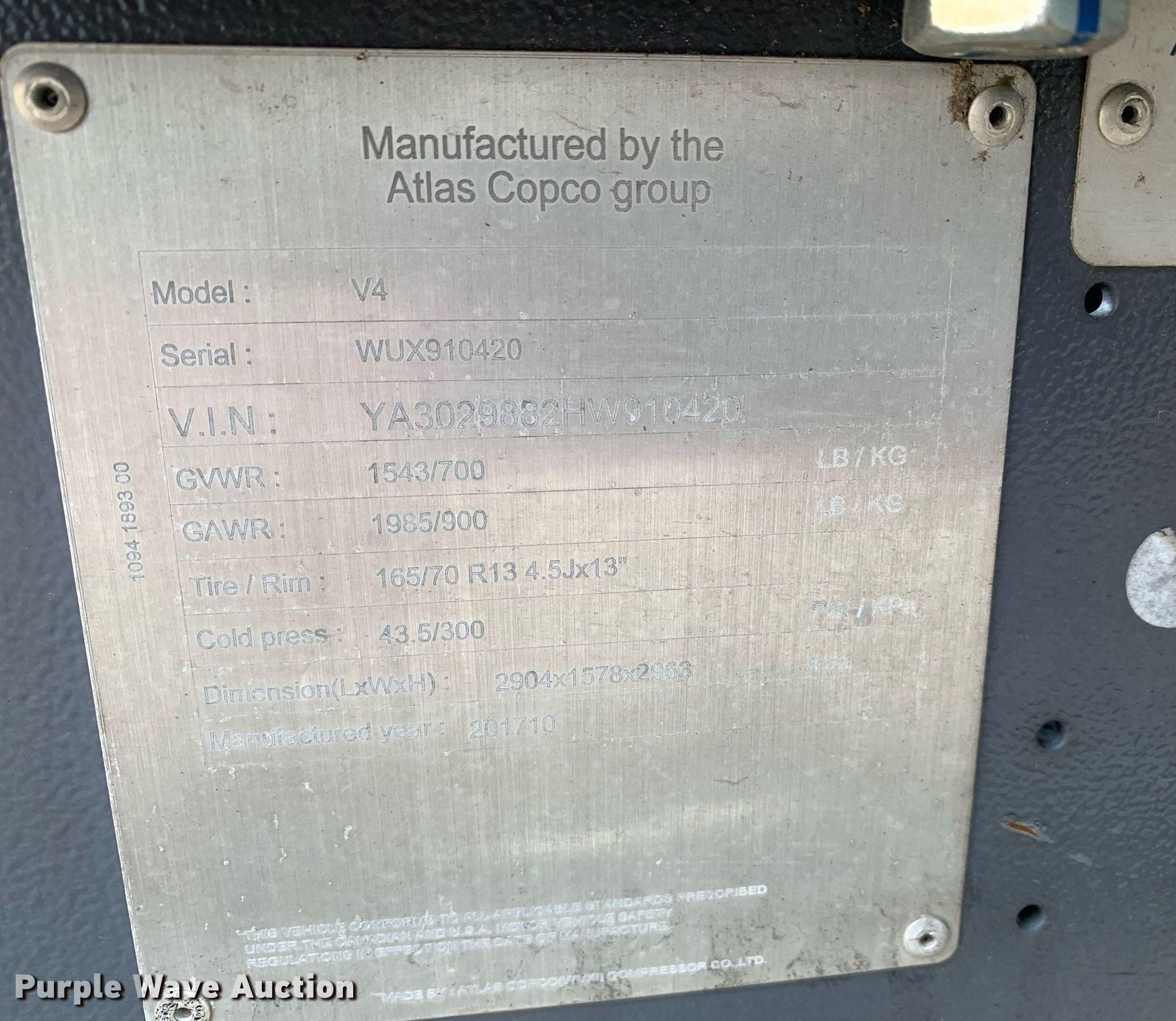 Purple Wave is selling a used Light Plant in Texas. This item is a 2017 Atlas Copco V4 light plant with the following: Hours: 655 on meter, VIN: YA3029882HW910420, Serial: WUX910420