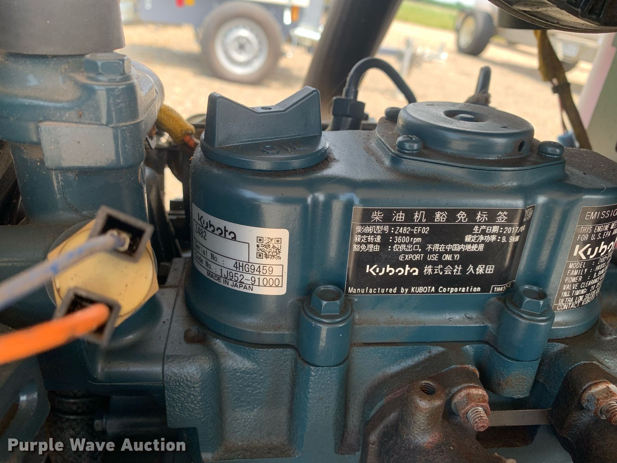 2017 Atlas Copco V4 light plant. Hours: 619 on meter, VIN: YA3029886HW910422, Serial: WUX910422. Engine Kubota Z482-EF02, Serial: 4HG9459, Displacement: 0.479L, Cylinders: 2, Fuel type: Diesel, kW: 9.9. Features Bulbs: 4, Watts: 1,000, Tower height: 25', Hoist: Manual, Stabilizers. Trailer 2017 Atlas Copco, 9' L x 48" W, Ball hitch size: 2", Suspension: Spring, Axles: Single, Tire size: 165/70R13, GVWR: 700 lbs, GAWR: 900 lbs. Notes Dead battery, Possible light issues. This is worksite support equipment and will not come with a title. Transfer of ownership documentation will be a bill of sale. PPF - Open Inspection June 19 and 26. 700 FM 1335. Cooper, TX 75432
