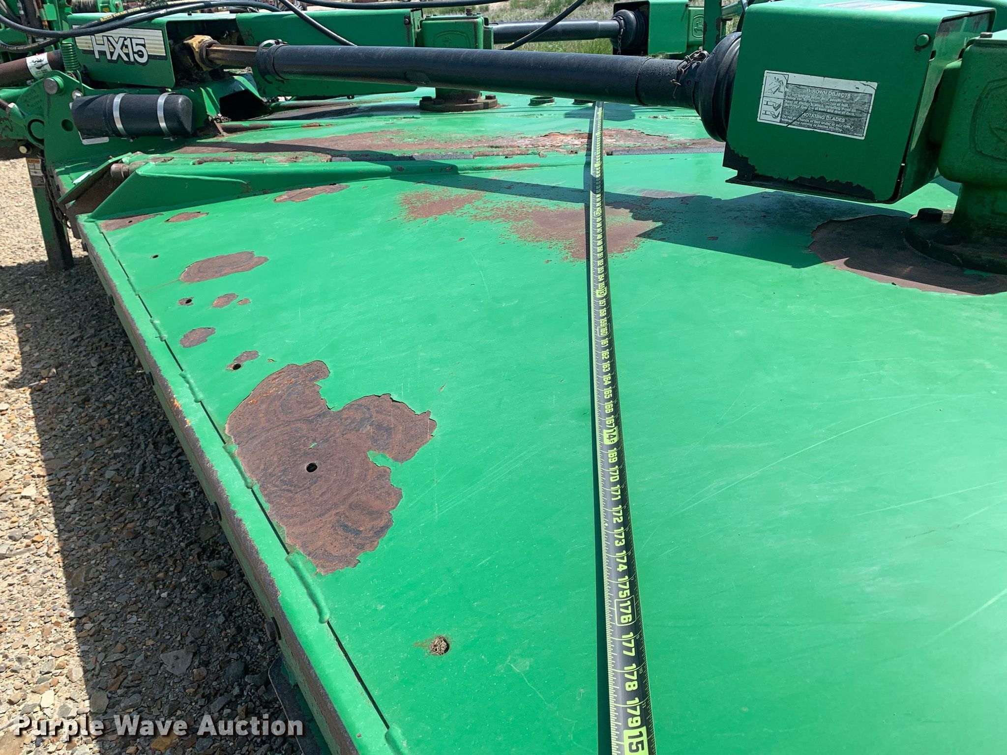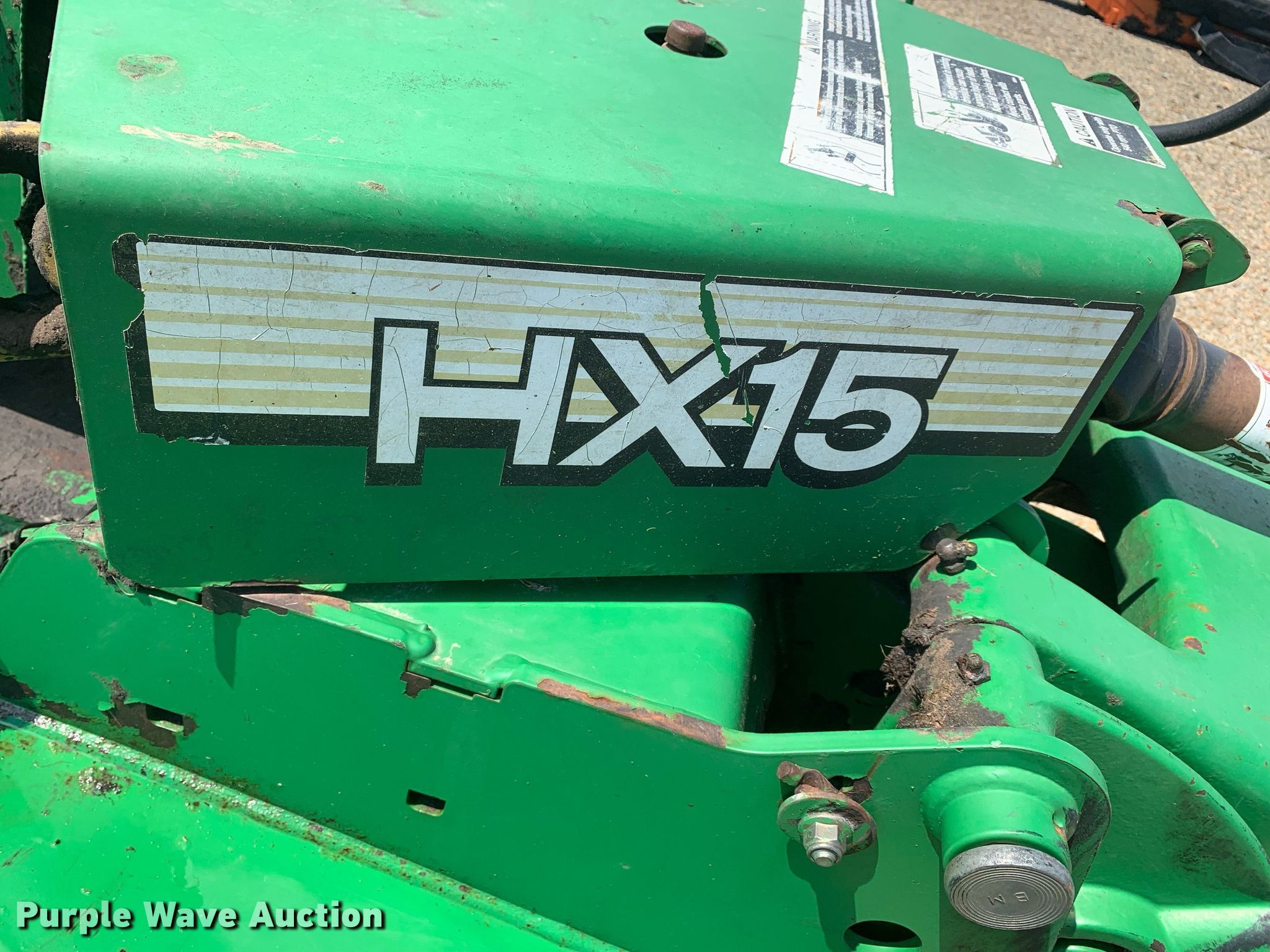 John Deere HX15 batwing rotary mower. Features. Width: 15' 2", Hydraulic lift, Hydraulic fold, PTO: 540. Tires Size: 21x7-12. PPF - Open Inspection June 19 and 26. 700 FM 1335. Cooper, TX 75432