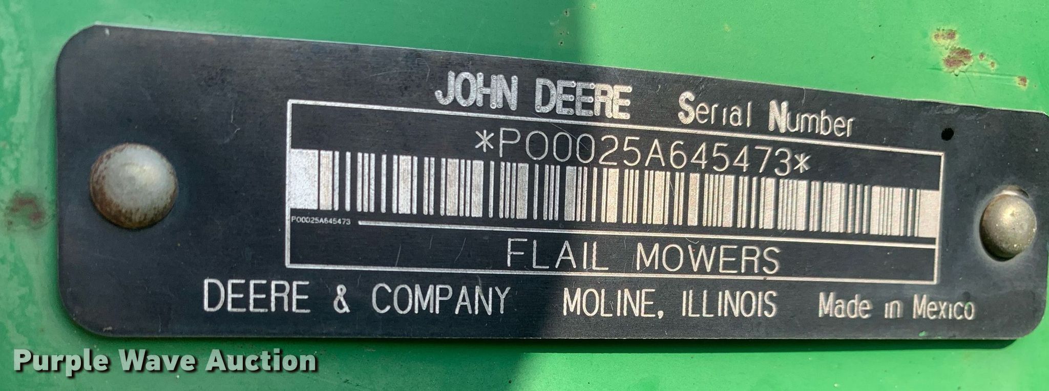 Purple Wave is selling a used Mower, Cutter, Shredder in Texas. This item is a John Deere 25A flail mower with the following: Serial: PO0025A645473