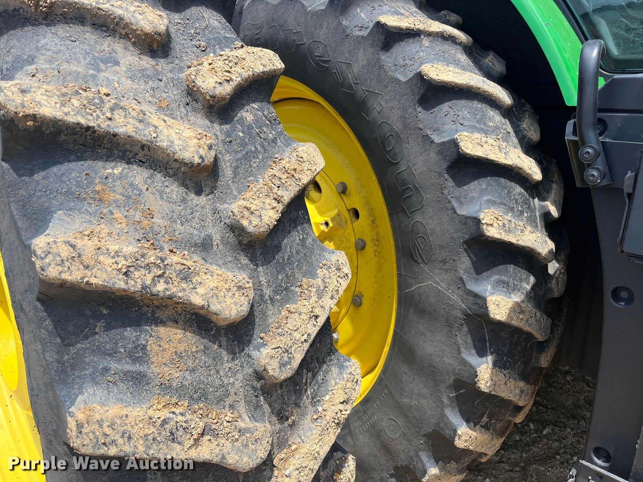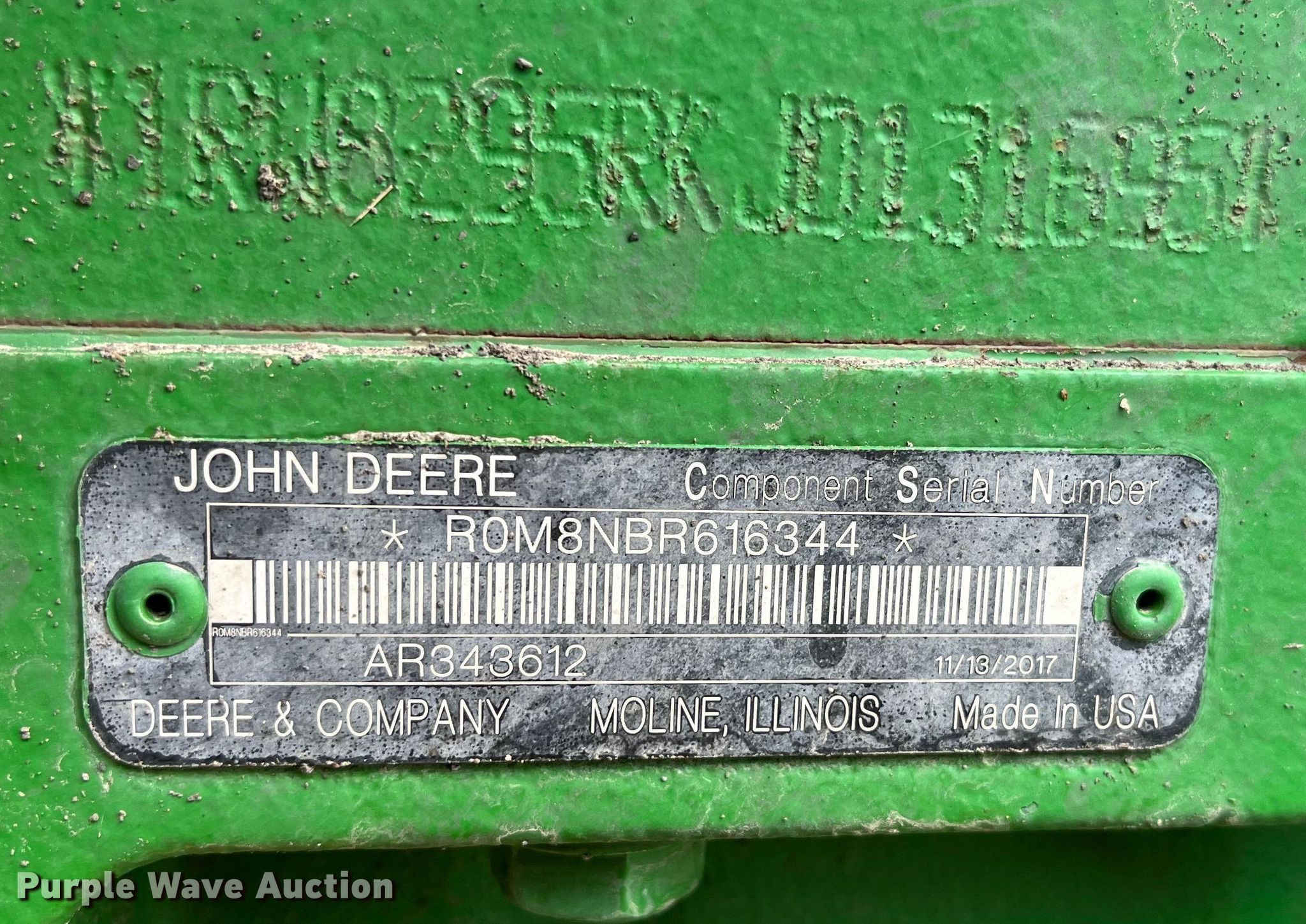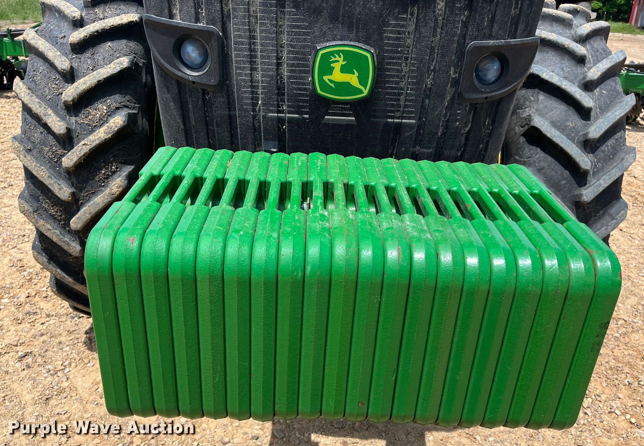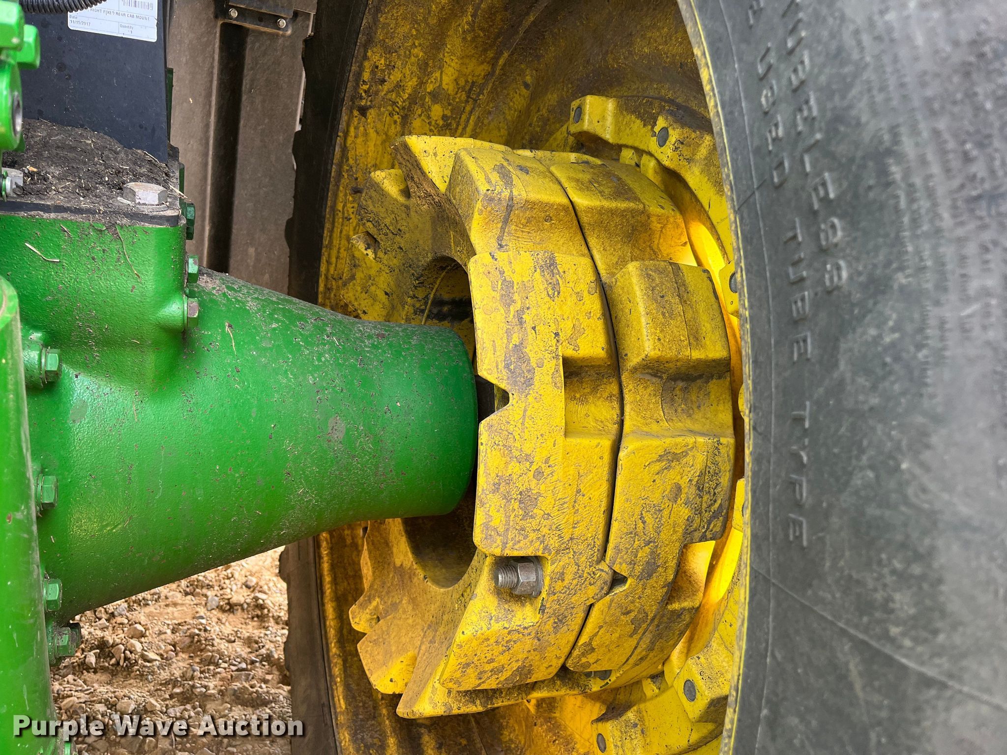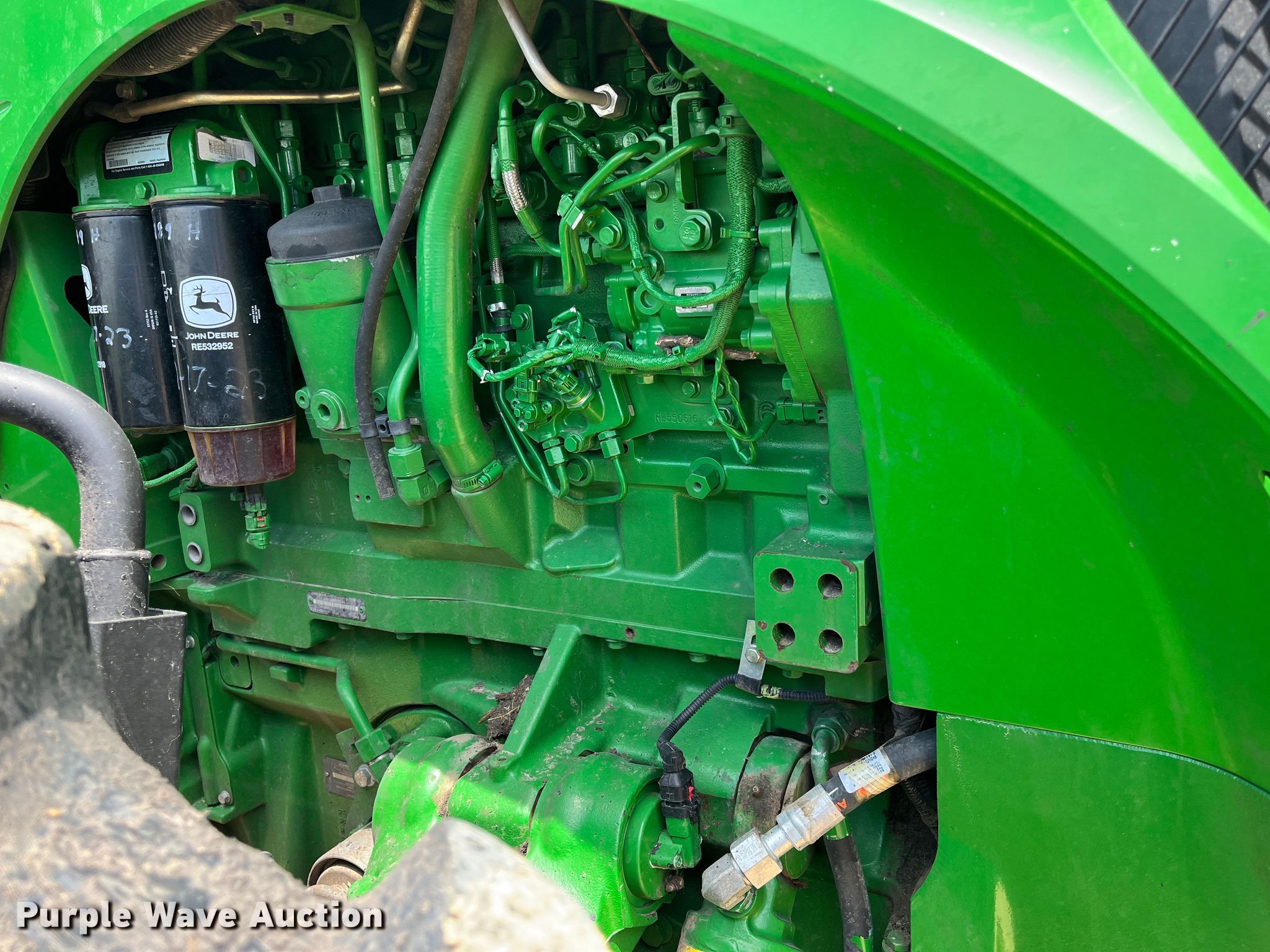 2018 John Deere 8295R MFWD tractor. Hours: 3,428 on meter, Miles or hours may vary, unit still in use, Serial: 1RW8295RKJD131695. Engine John Deere, Cylinders: 6, Fuel type: Diesel. Transmission IVT, Differential lock. Operators station AC, Heat, GPS receiver John Deere, Display John Deere, Auto steer. Features PTO: 1 3/4" 1000, Three point Top link, Quick attach, Seven pin outlet, ISOBUS outlet, Hydraulic remote sets Rear: 5, Power beyond (hydraulics), Suitcase weights: 20, ILS. Tires Front: 420/85R34, Rear: 480/80R50, Wheel weights: 6. Notes Planter not included. Item will be utilized during the removal process. Item will be available for load-out beginning July 13. PPF - Open Inspection June 19 and 26. 700 FM 1335. Cooper, TX 75432