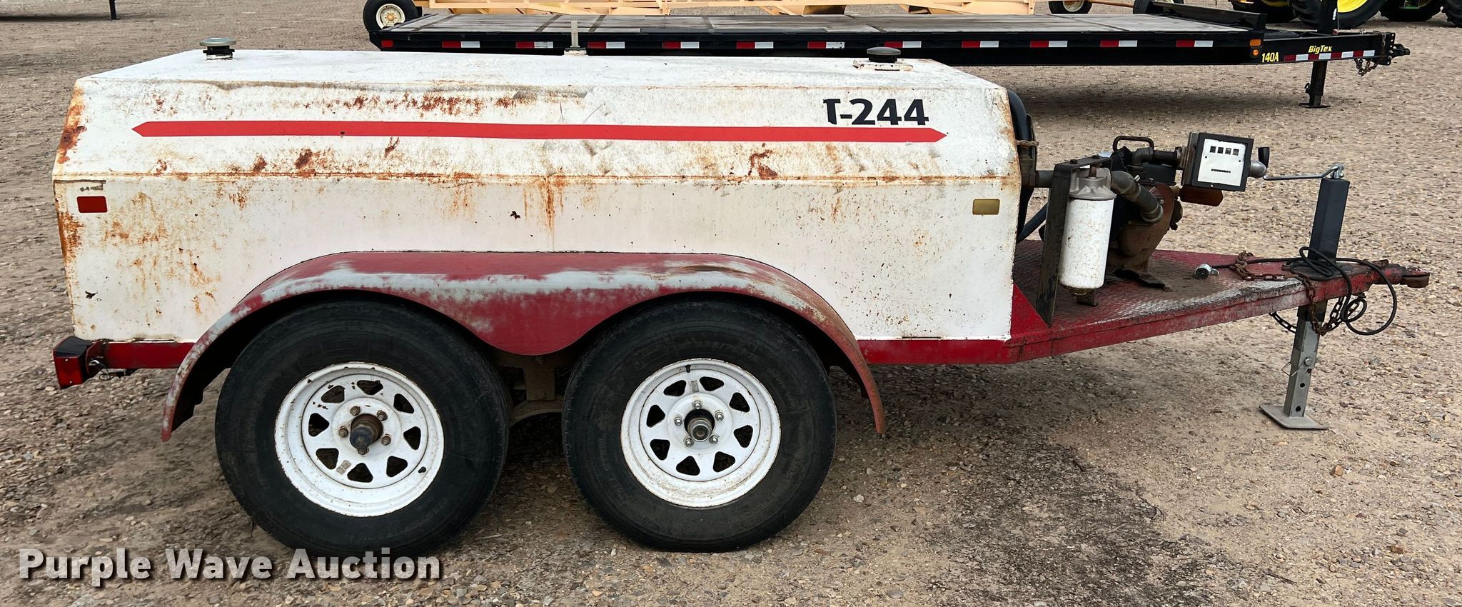 Fuel tank trailer. Model: PLB-600, Serial: 29244, Unit #: T-244. Dimensions Overall: 13' L x 83" W, Deck: 8' L x 53" W. Features Deck type: Steel, Tank capacity: 600 gallons. Chassis Ball hitch: 2", Landing gear: Single, Suspension: Spring, Brakes: Electric, Axles: Tandem. Tires Steel wheels, Size: 225/75R15. This is worksite support equipment and will not come with a title. Transfer of ownership documentation will be a bill of sale. PPF - Open Inspection June 19 and 26. 700 FM 1335. Cooper, TX 75432