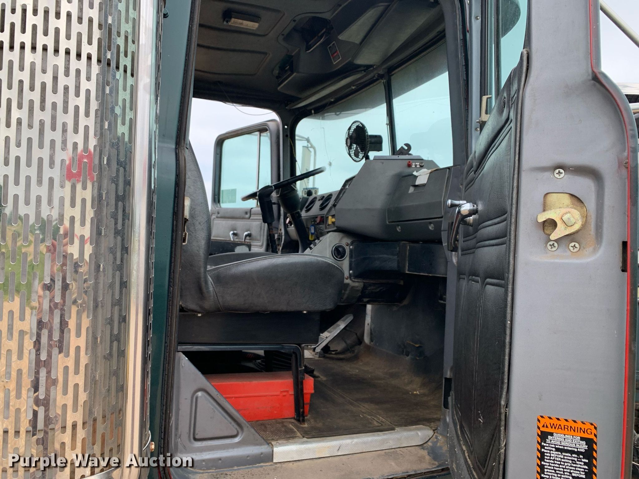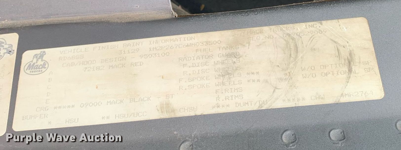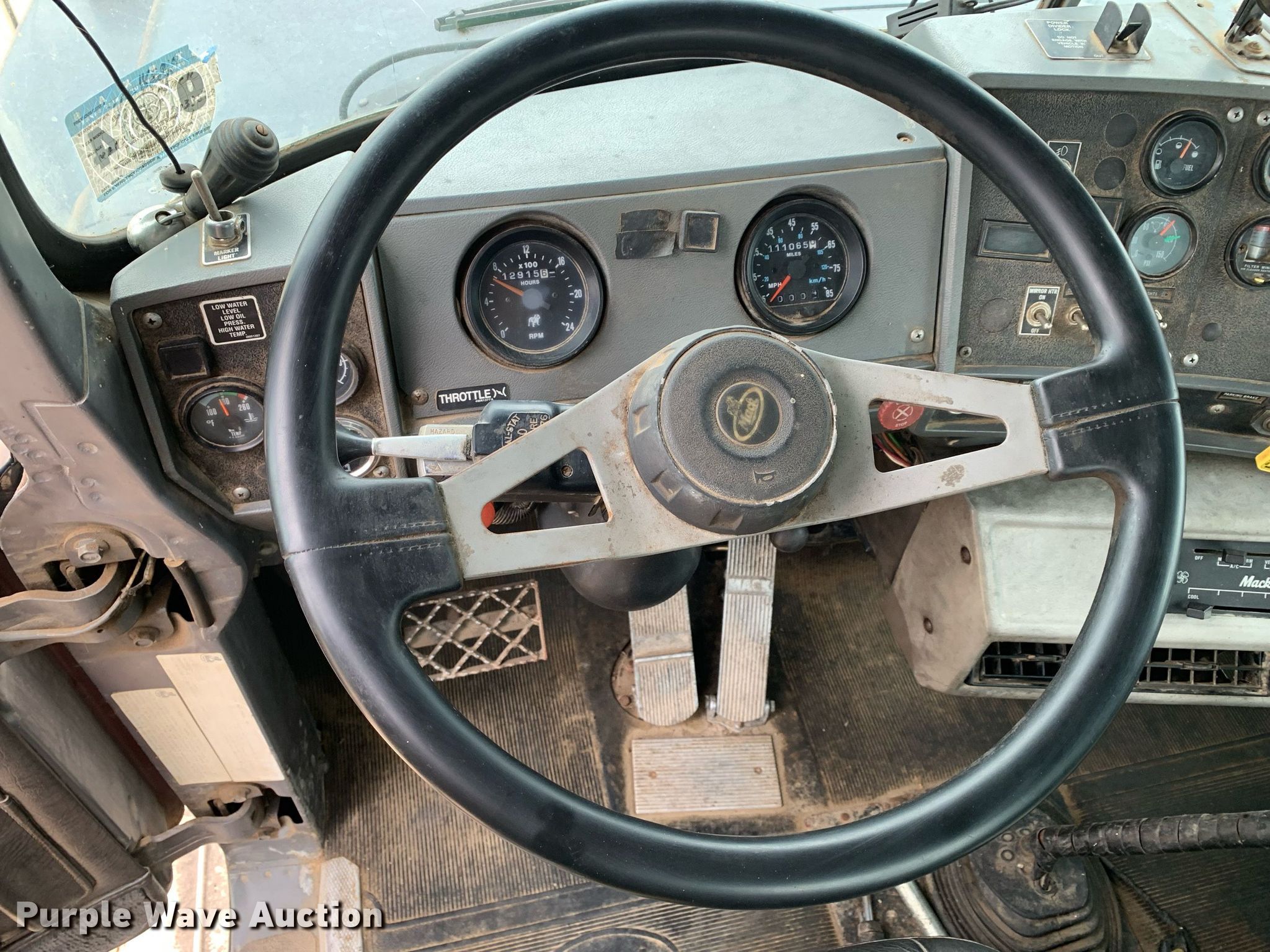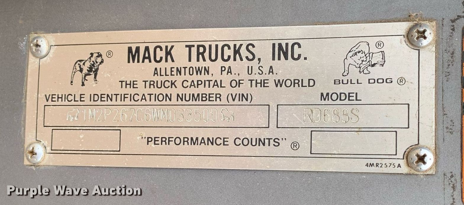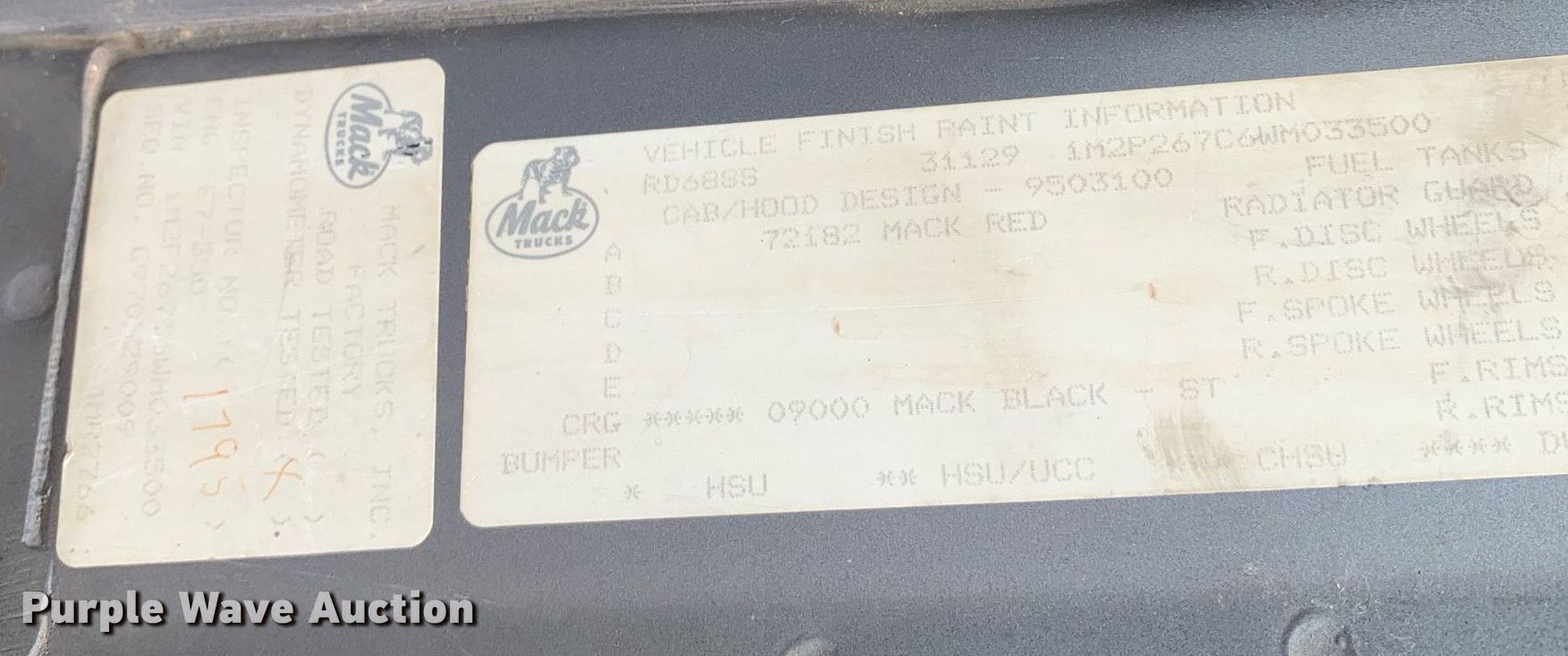 1998 Mack RD688S cotton module transport truck. Miles: 111,065 on odometer, Hours: 12,916 on meter, VIN: 1M2P267C6WM033500. Engine Mack, Displacement: 12.0L, Cylinders: 6, Fuel type: Diesel. Transmission Eaton Fuller, Manual, Speed: 9. Chassis Axles: Tandem, Suspension: Camelback, Brakes: Air, PTO, Wet kit, GVWR: 50,350 lbs FAWR: 12,350 lbs, IAWR: 19,000 lbs, RAWR: 19,000 lbs. Interior AC, Heat. Features Cotton module transport bed Floor: Chain conveyor Hydraulic driven.. Tires Size: 11R22.5. Notes Windshield chipped or cracked, Unknown operating condition of bed. Texas title. Title distribution may be delayed up to 14 days from verification of funds. PPF - Open Inspection June 19 and 26. 700 FM 1335. Cooper, TX 75432
