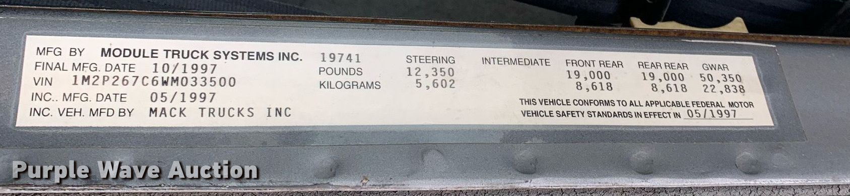 Purple Wave is selling a used Truck Chassis in Texas. This item is a 1998 Mack RD688S cotton module transport truck with the following: Miles: 111,065 on odometer, Hours: 12,916 on meter, VIN: 1M2P267C6WM033500