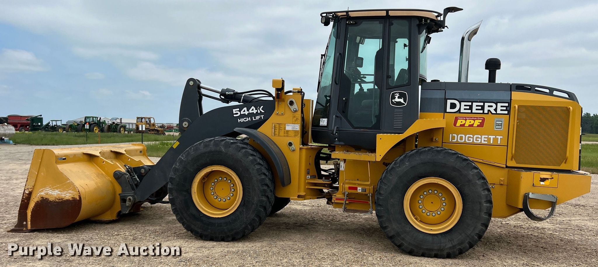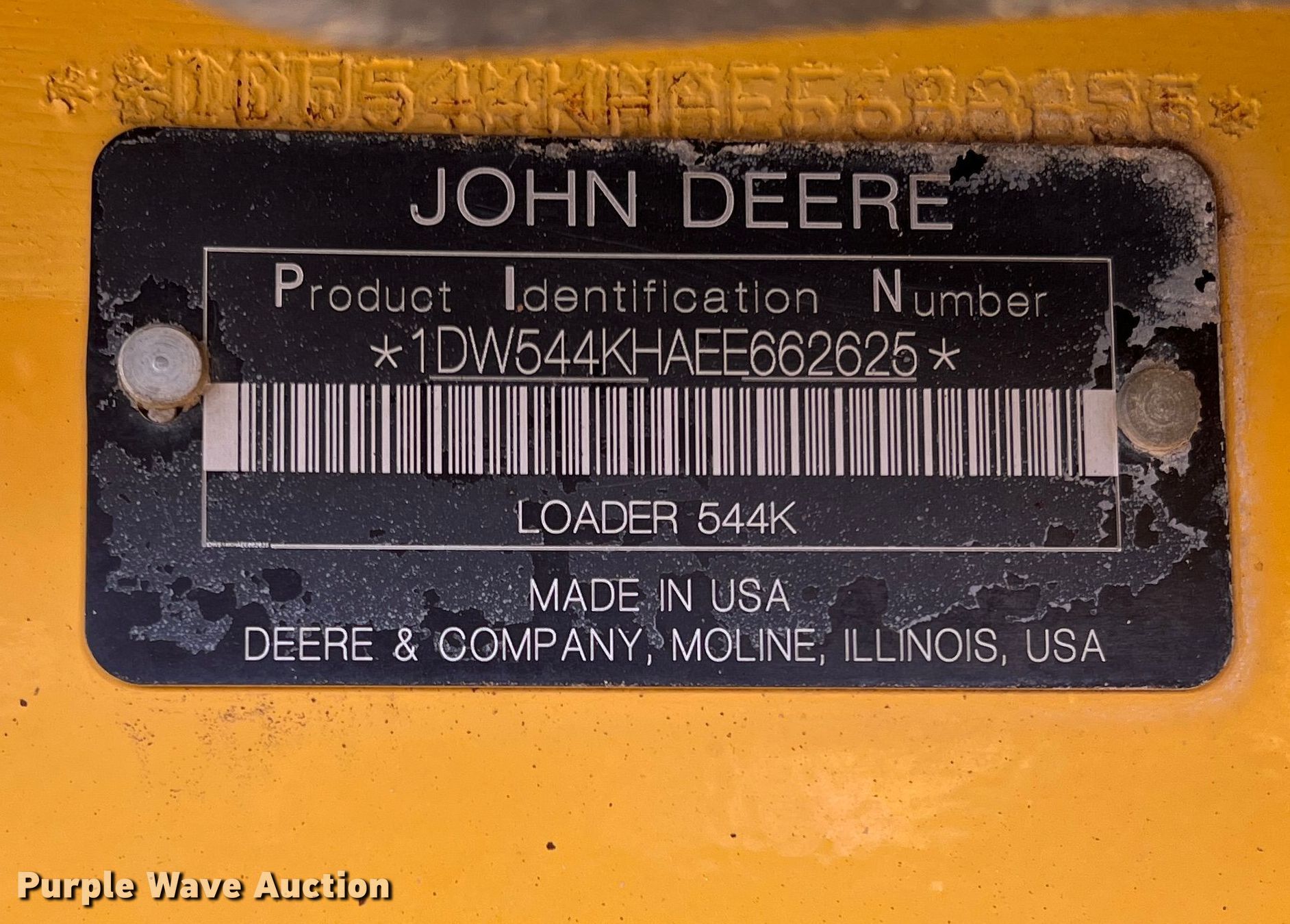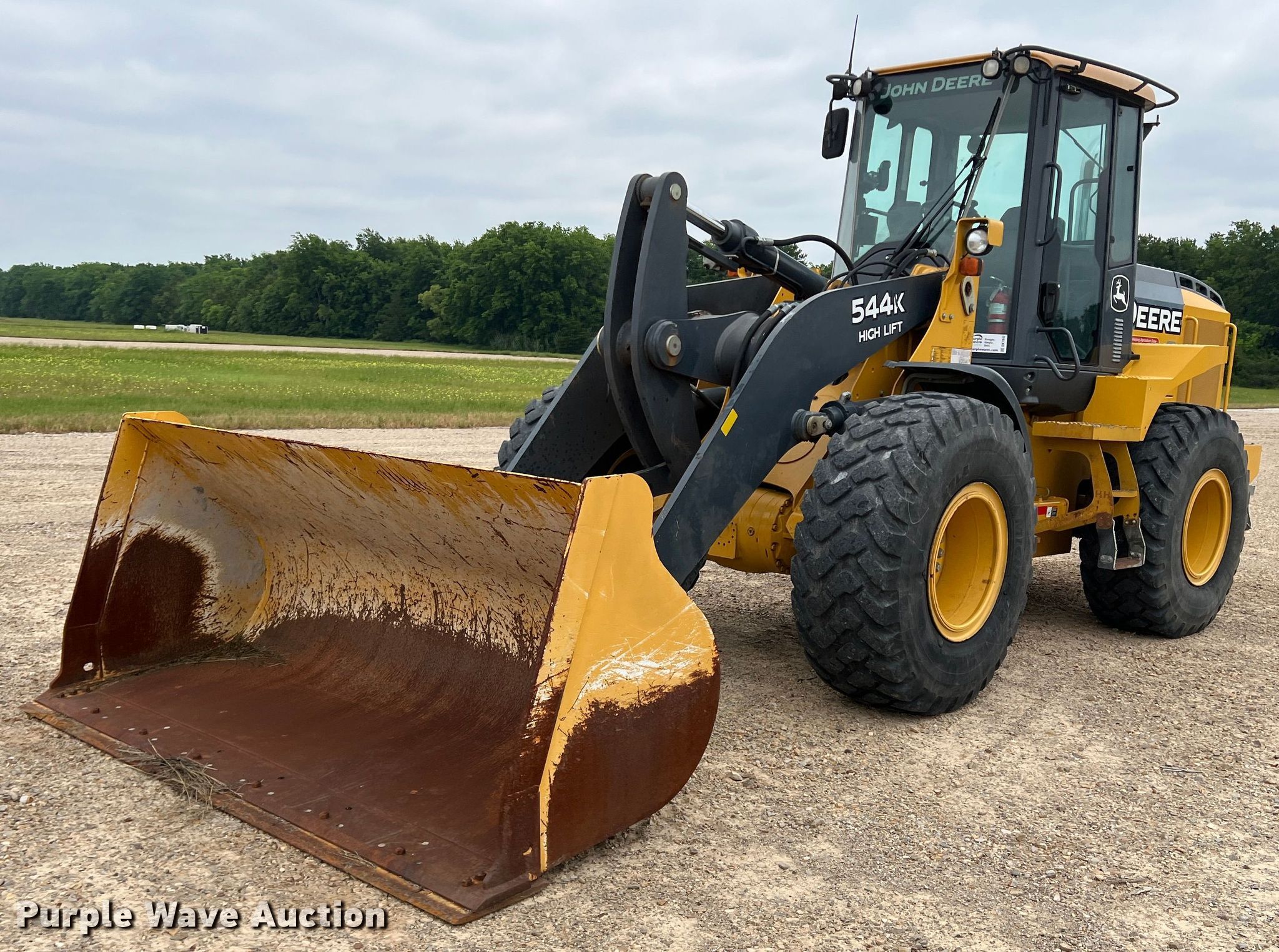 Purple Wave is selling a used Wheel Loader in Texas. This item is a 2014 John Deere 544K high lift wheel loader with the following: Hours: 5,958 on meter, Serial: 1DW544KHAEE662625