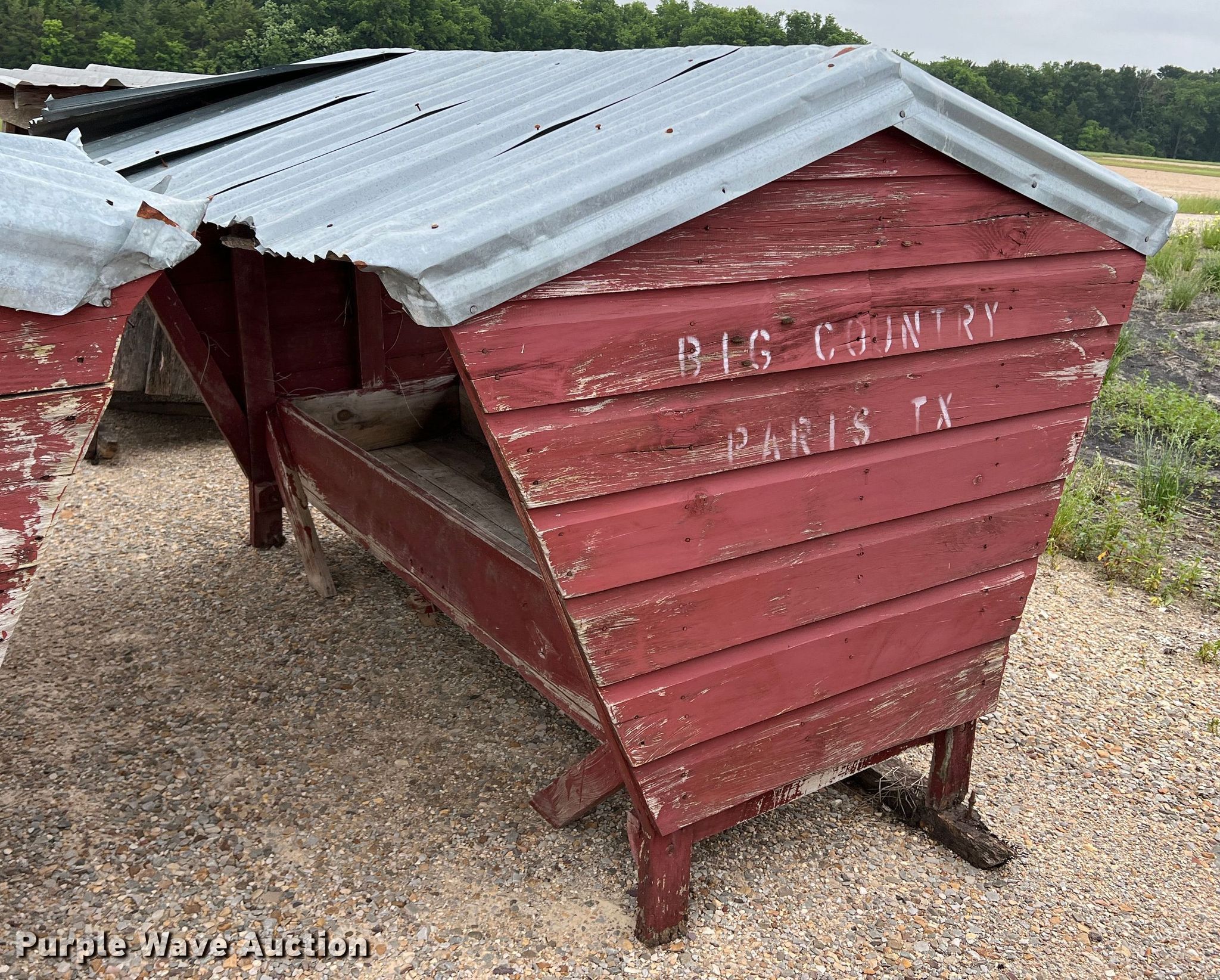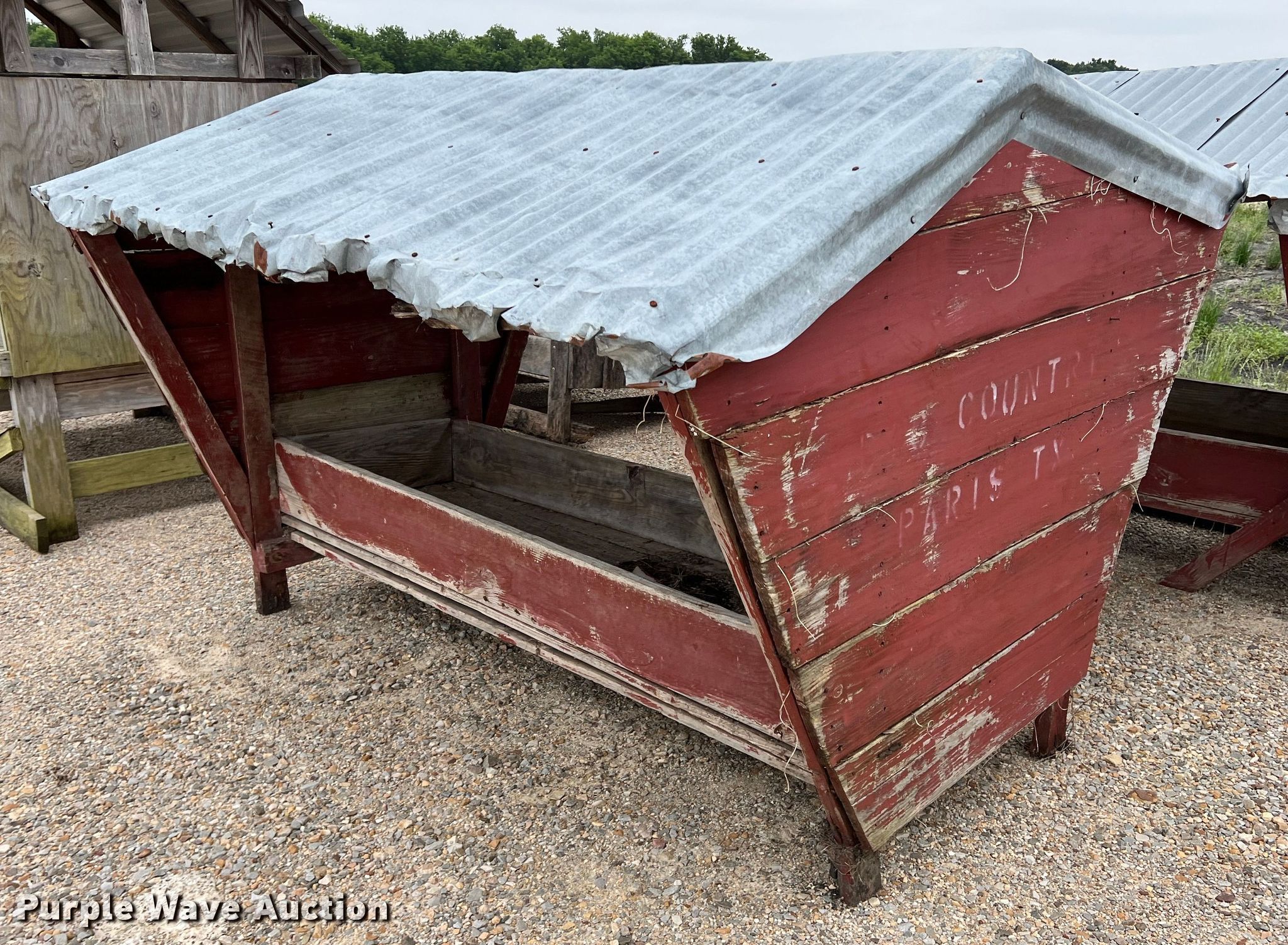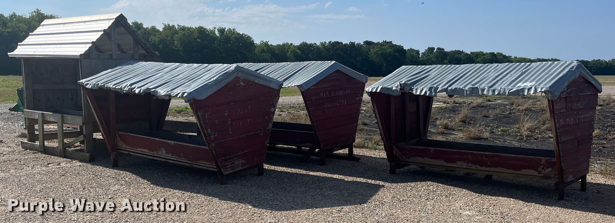 (5) livestock feeders. (3) 8'L x 6'W x 34"H, 7'L x 4'W x 10'H, 10'L x 6'W x 5'H. Notes Storm damage. PPF - Open Inspection June 19 and 26. 700 FM 1335. Cooper, TX 75432
