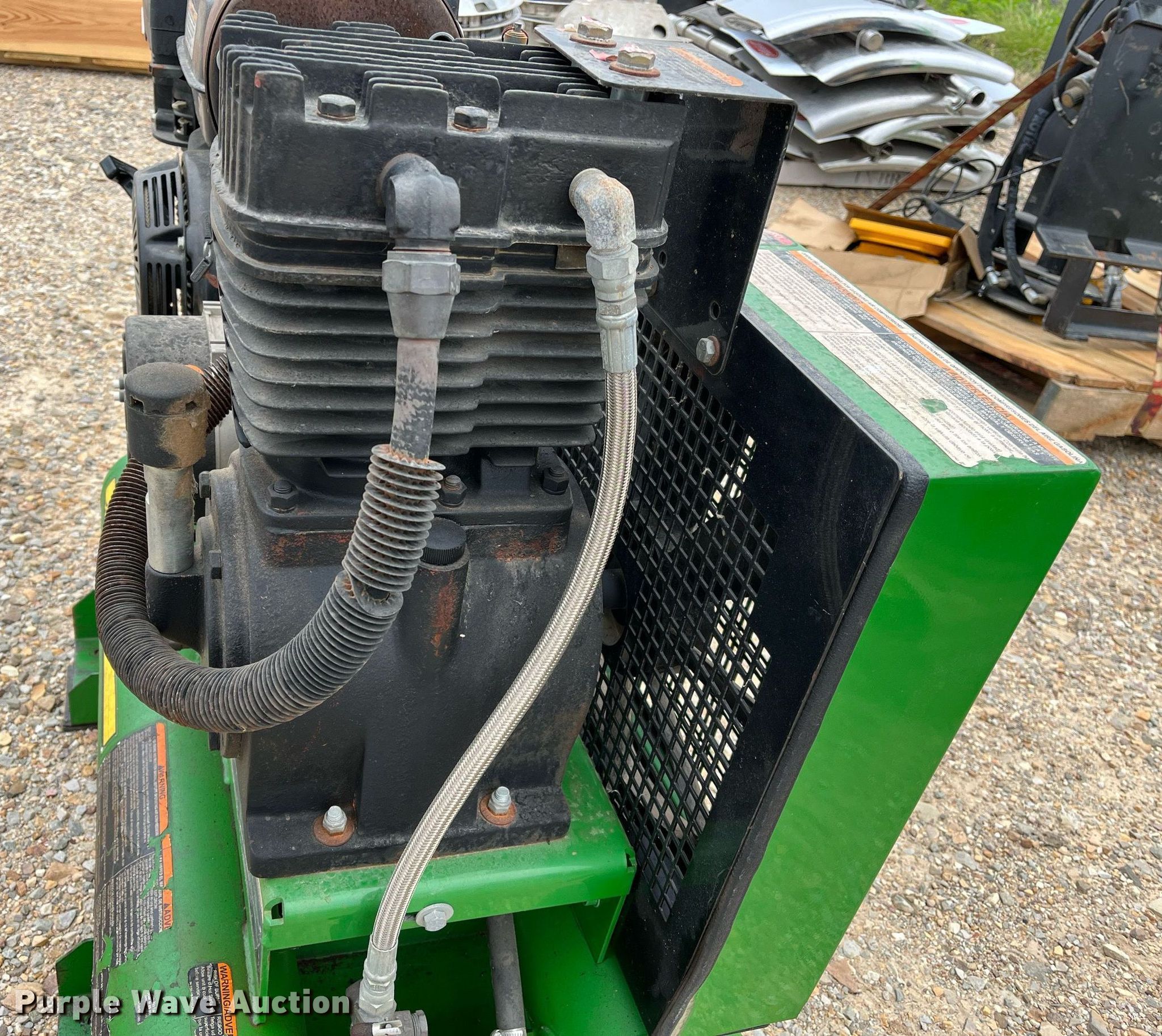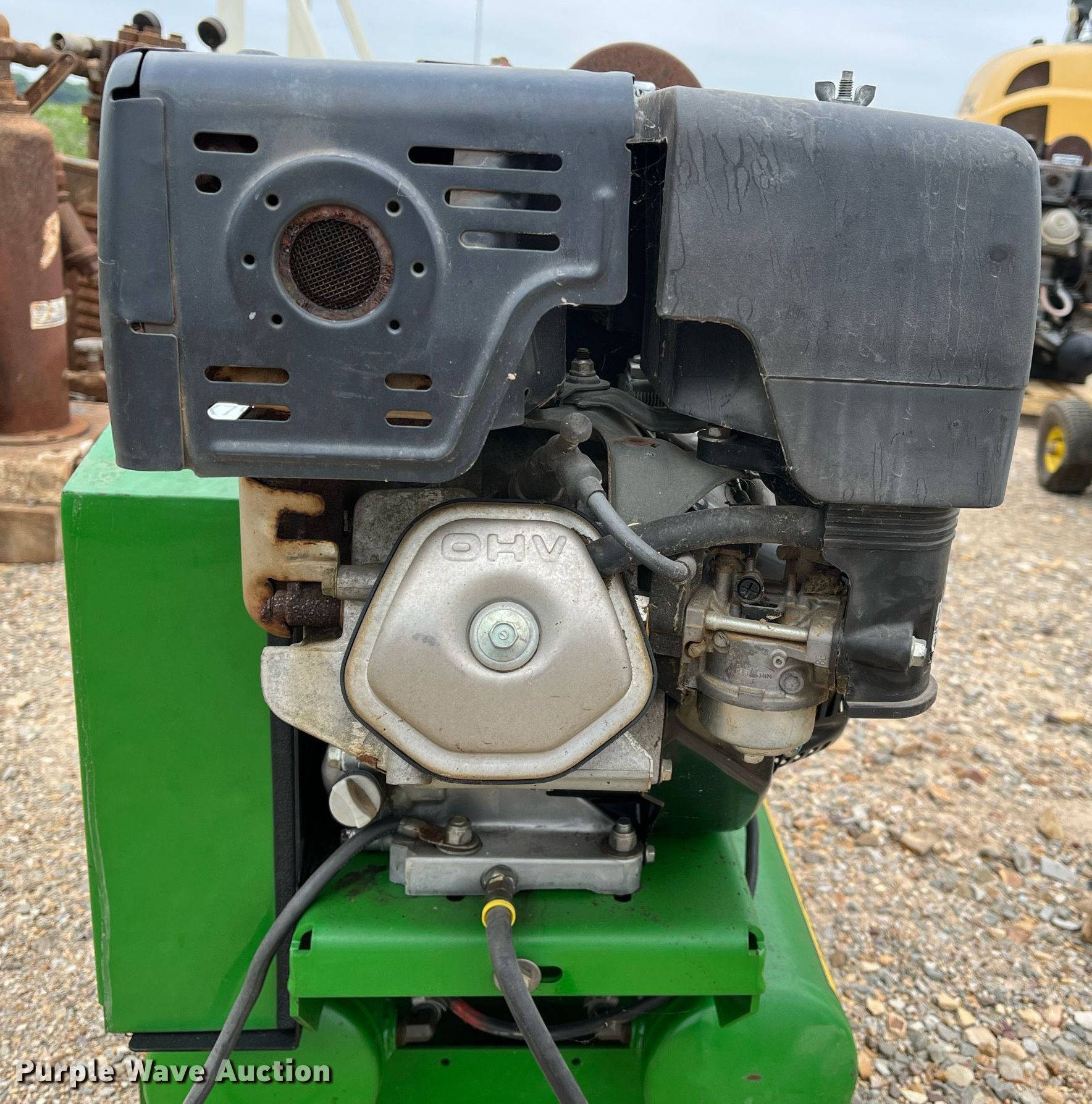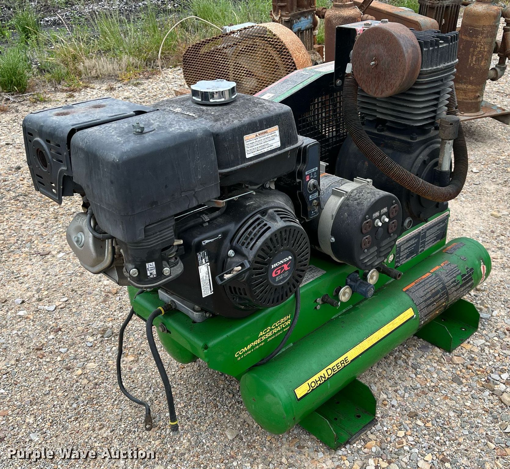 John Deere AC2-CG35H compresserator. Serial: 20109247. Engine Honda GX390, Cylinders: 1, Fuel type: Gas. Features Generator Watts: 2,200, kVA: 3,500, Phase: Single, Backup start, Electric start, Air compressor CFM: 15.4, PSI: 175. PPF - Open Inspection June 19 and 26. 700 FM 1335. Cooper, TX 75432