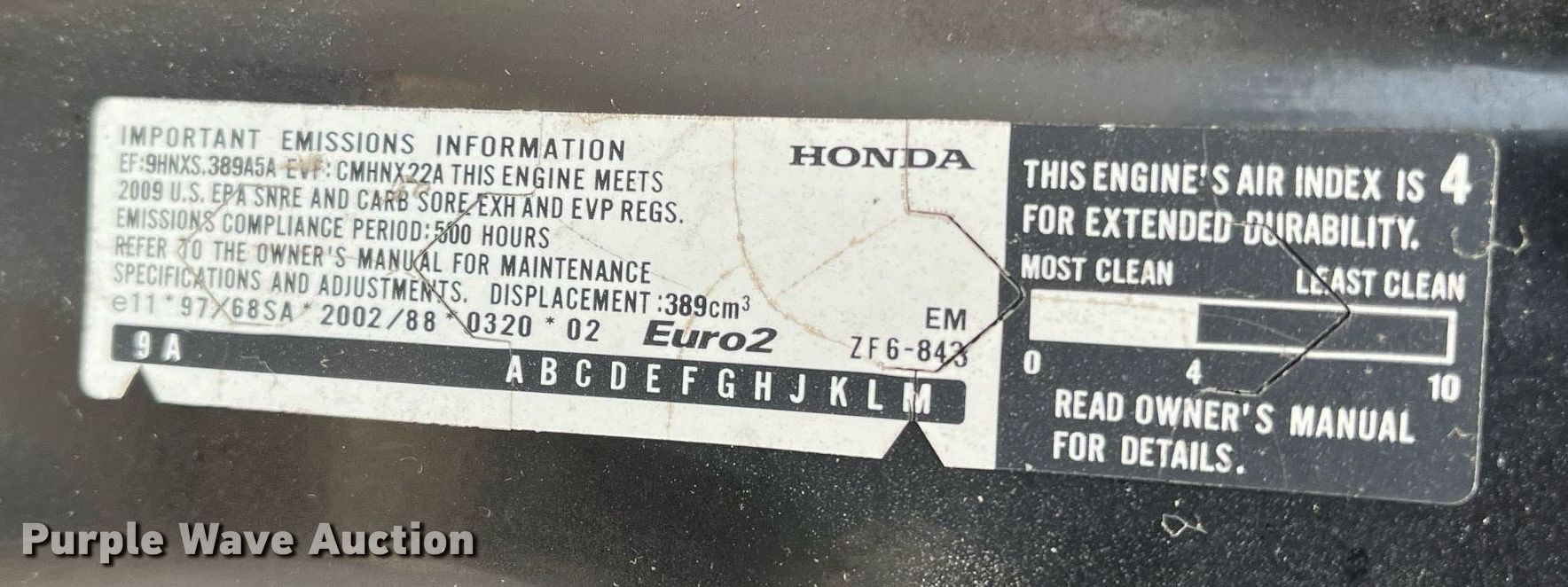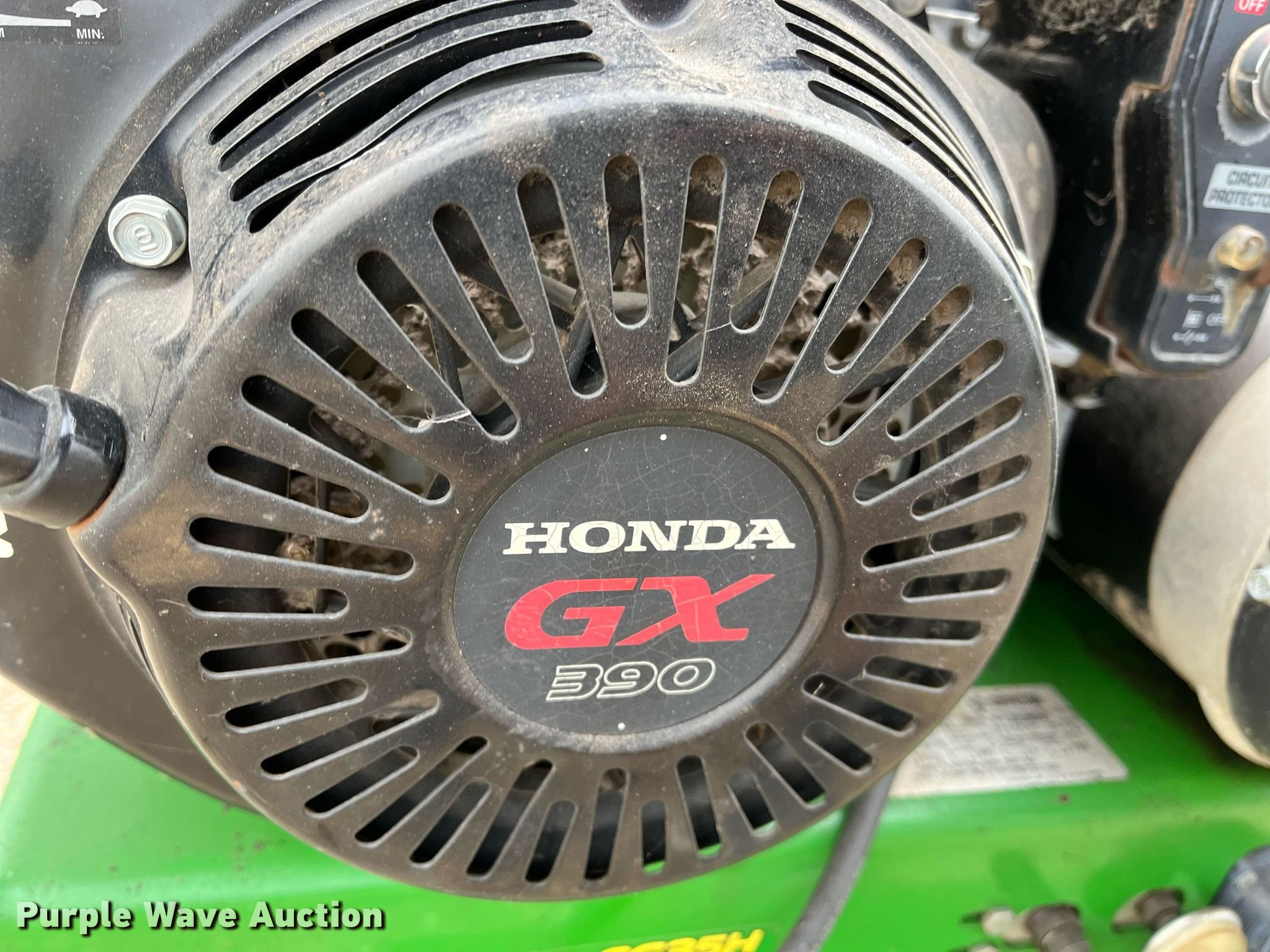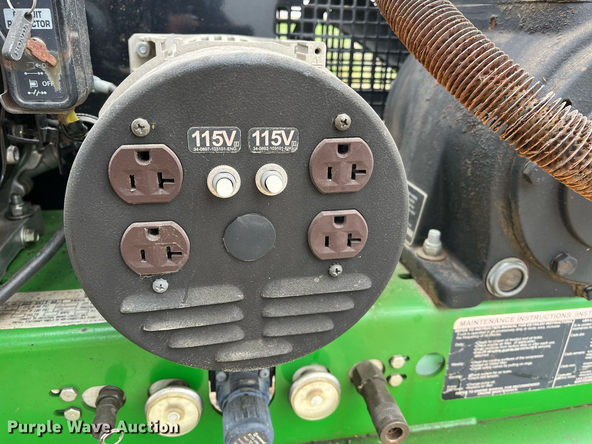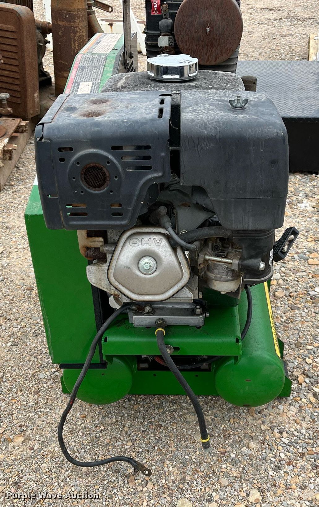 John Deere AC2-CG35H compresserator. Serial: 20109247. Engine Honda GX390, Cylinders: 1, Fuel type: Gas. Features Generator Watts: 2,200, kVA: 3,500, Phase: Single, Backup start, Electric start, Air compressor CFM: 15.4, PSI: 175. PPF - Open Inspection June 19 and 26. 700 FM 1335. Cooper, TX 75432