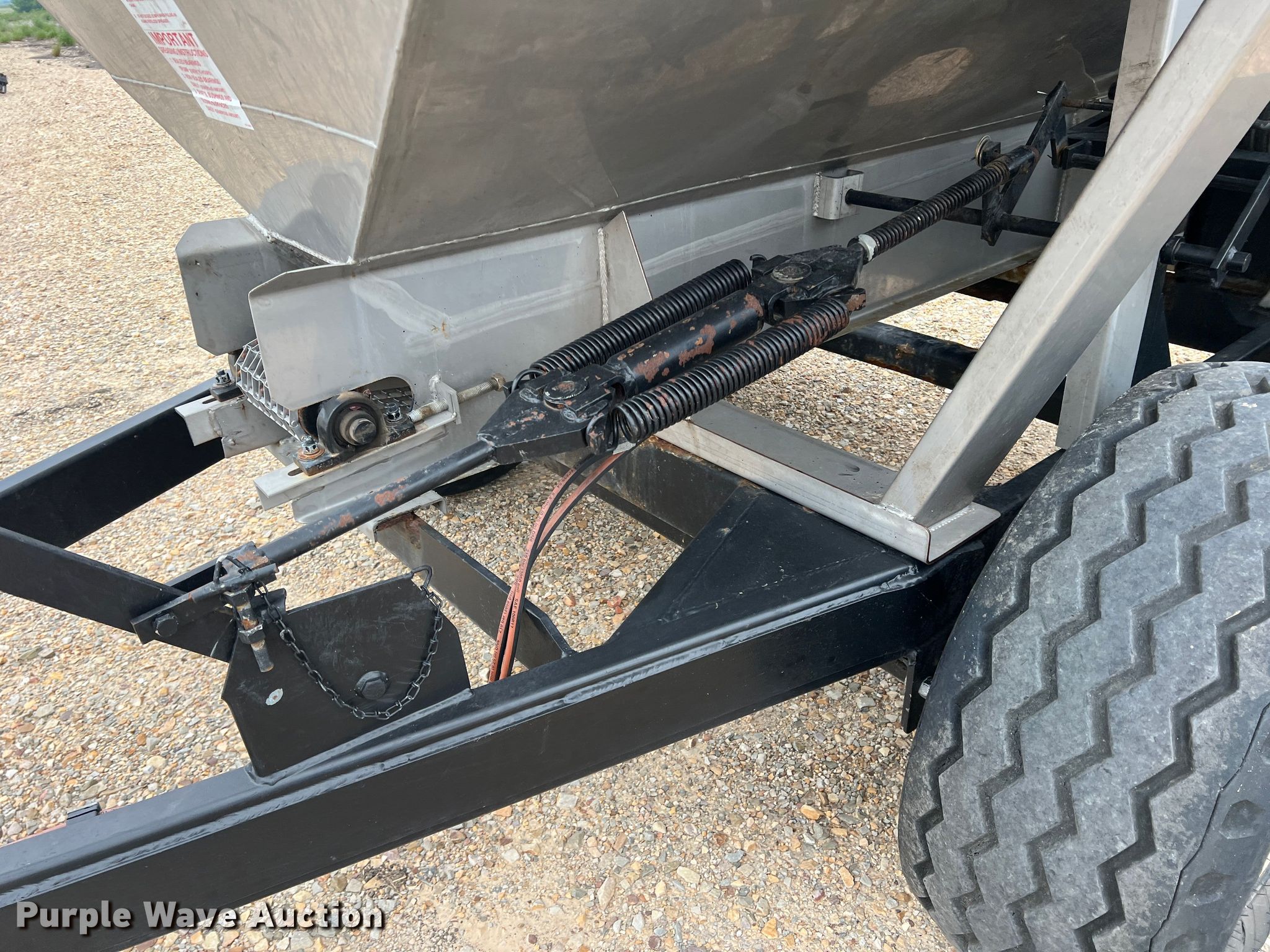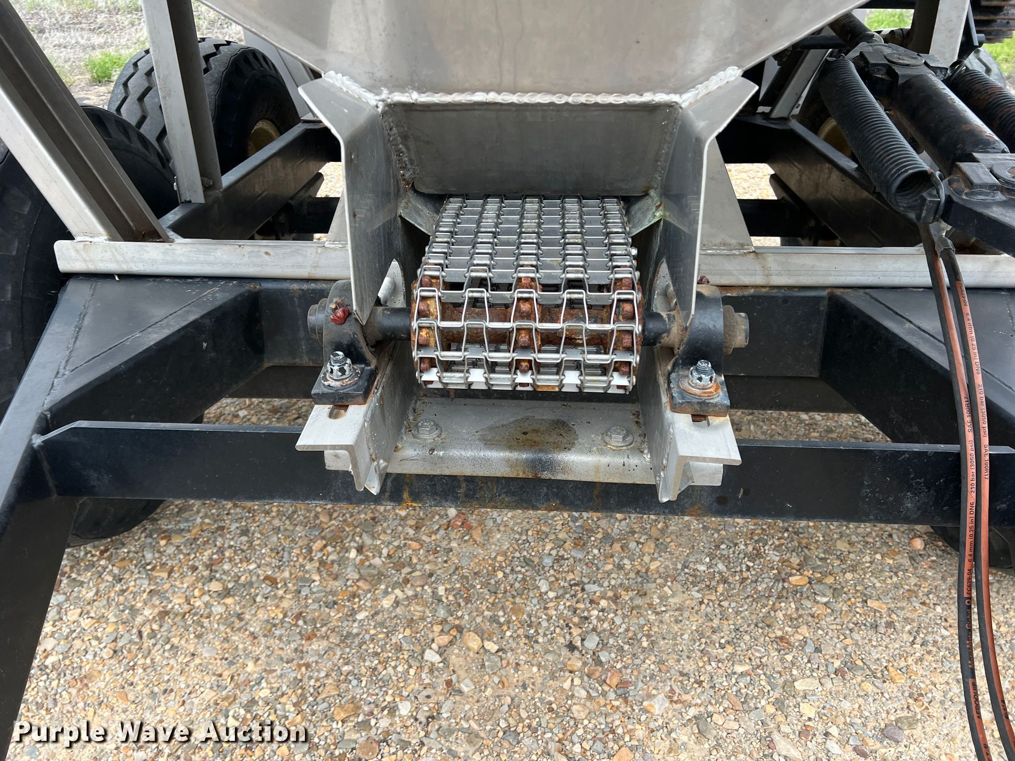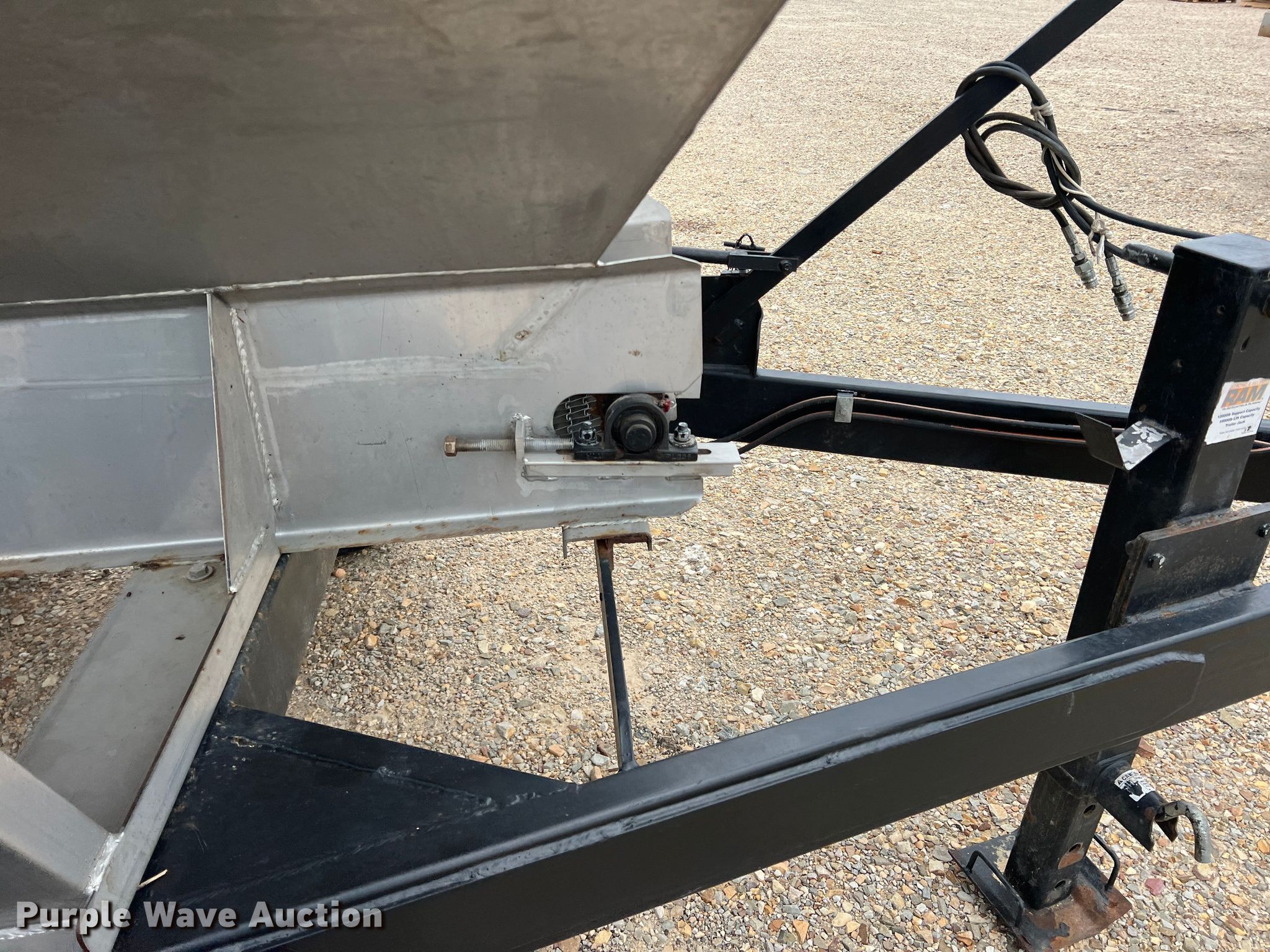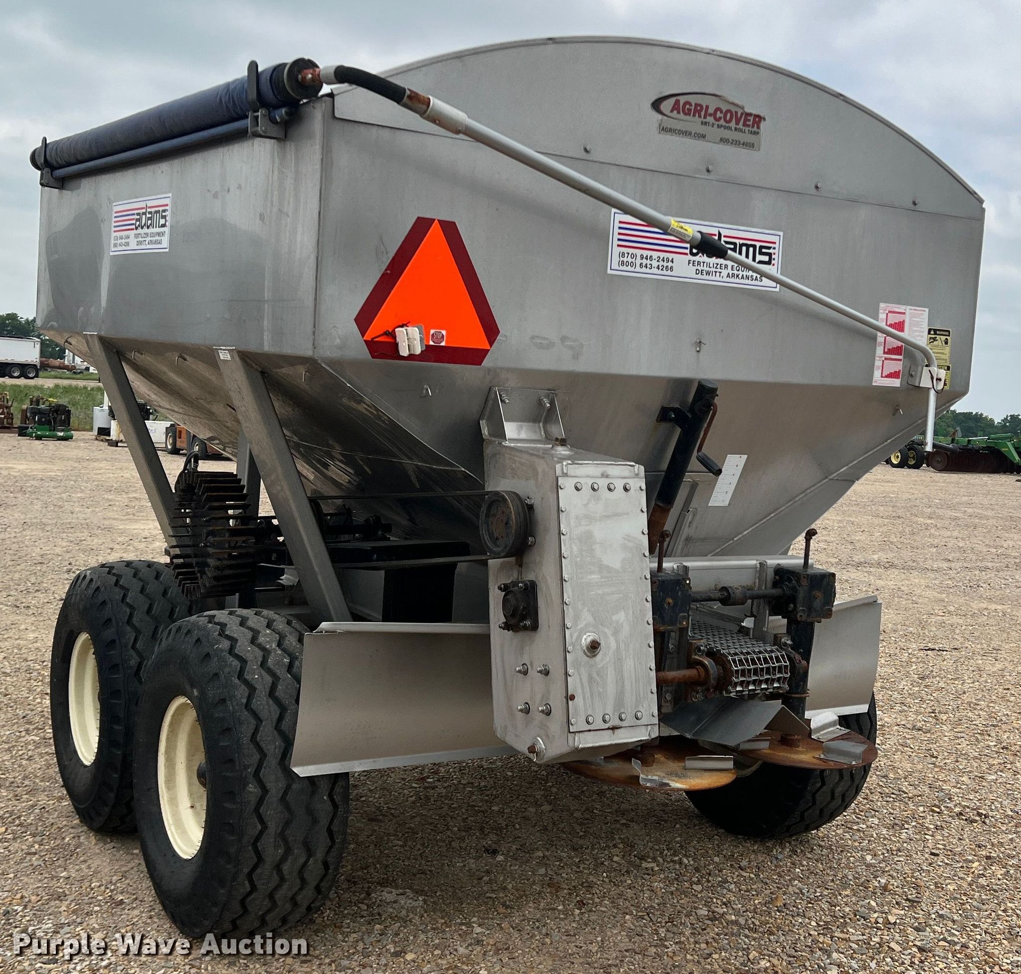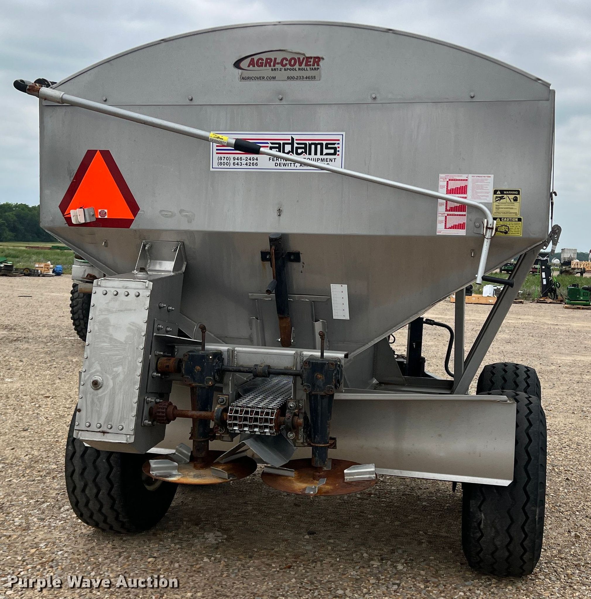Adams spreader. Serial: 18645. Features Tons capacity: 6, Stainless steel, Dual spinners Diameter: 20", Roll tarp, Chain conveyor Width: 8". Tires Size: 14.5/75-16. PPF - Open Inspection June 19 and 26. 700 FM 1335. Cooper, TX 75432