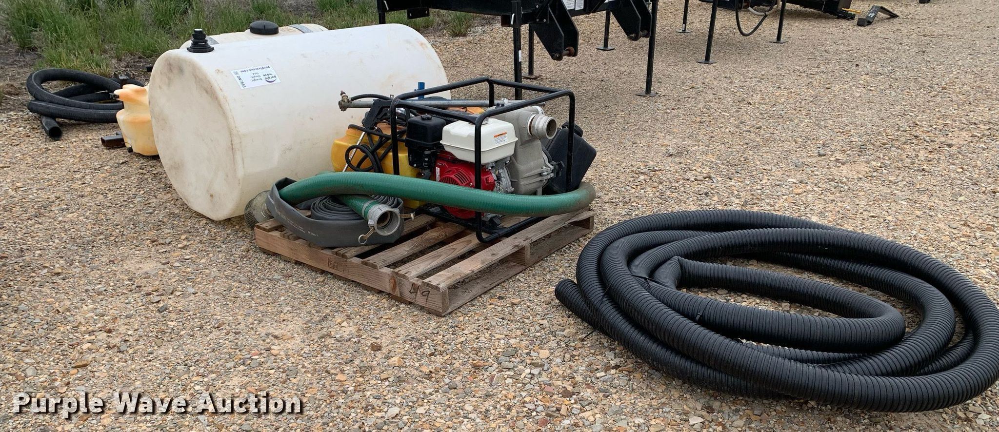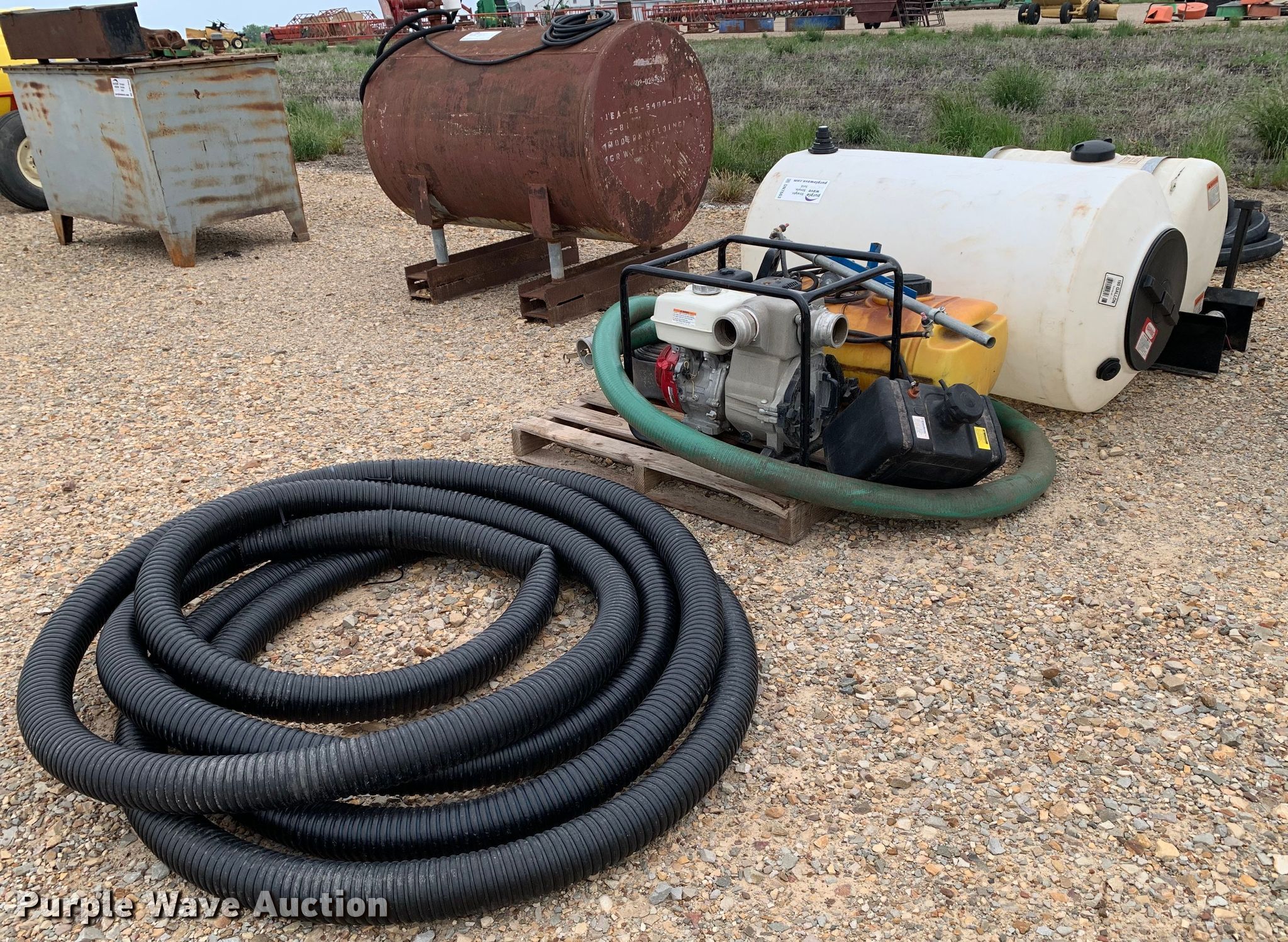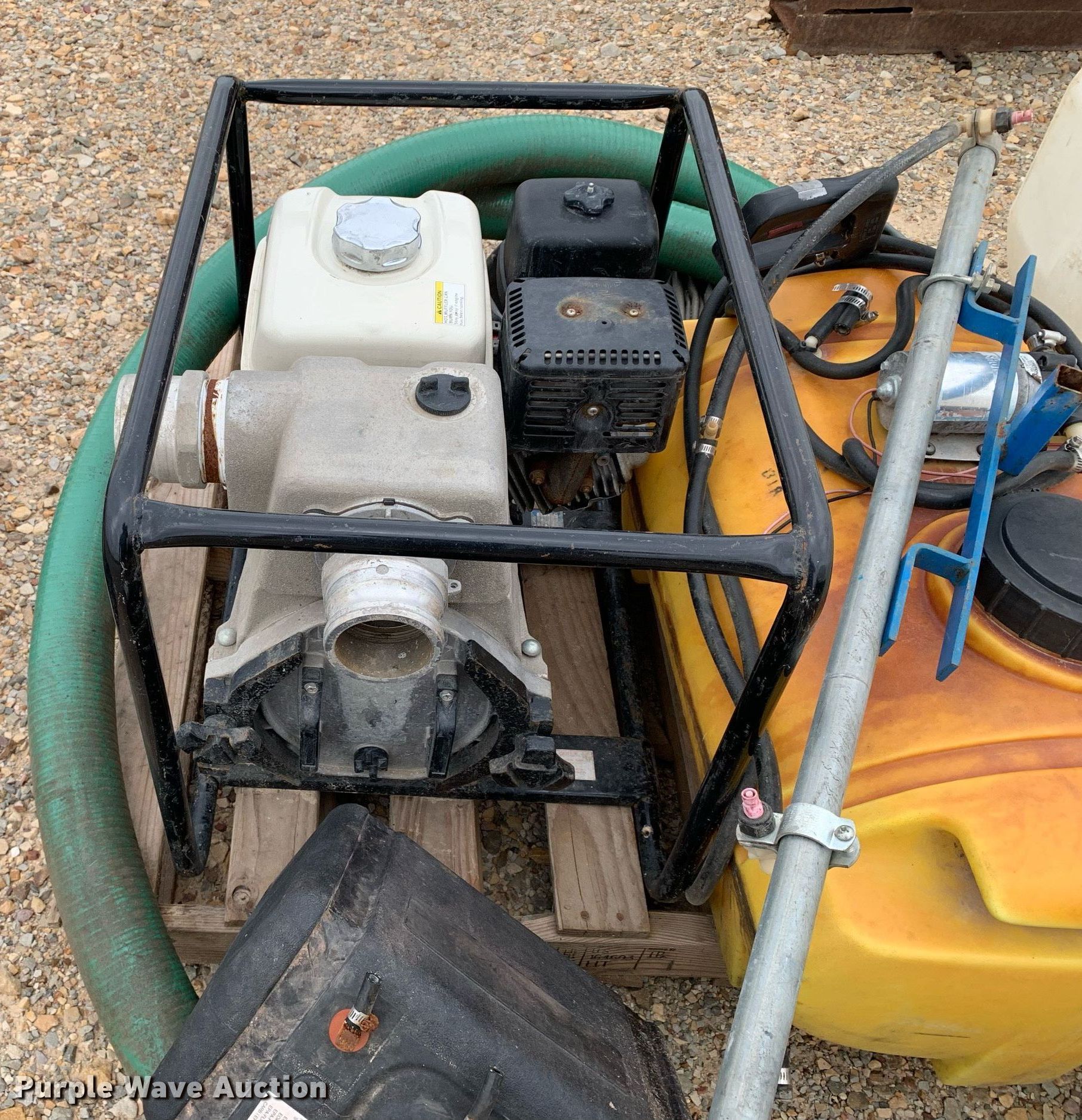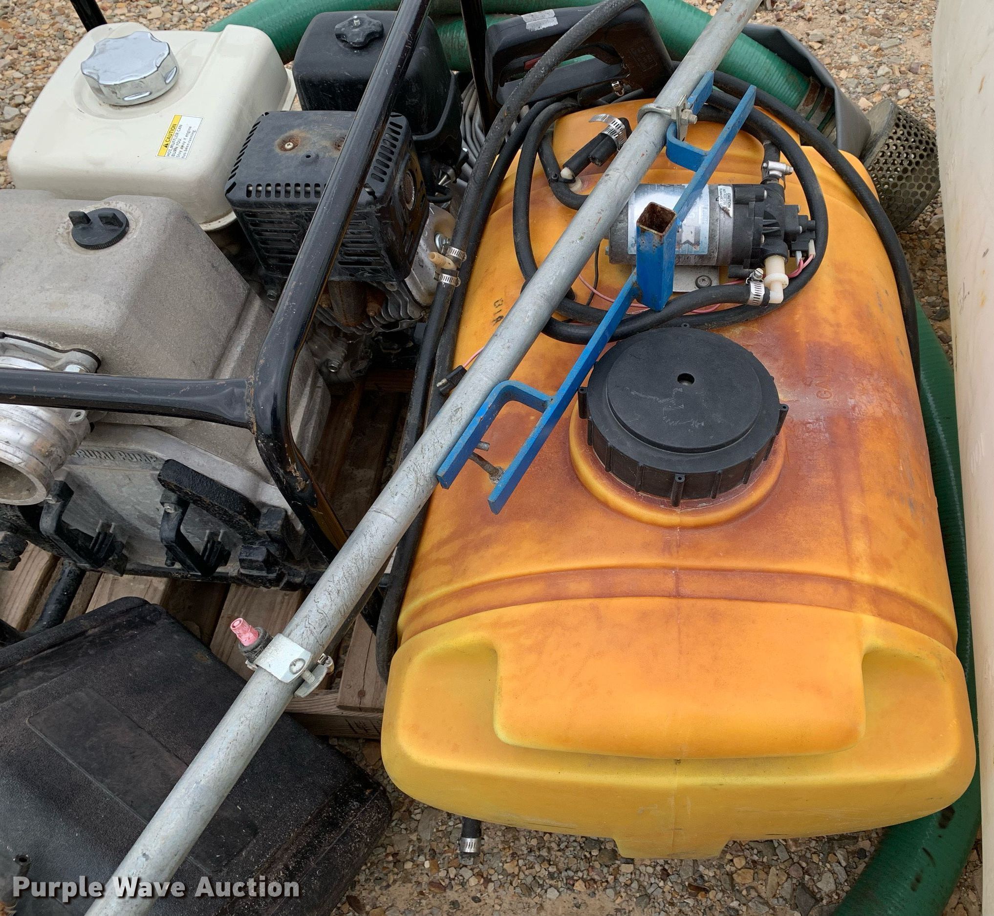 Purple Wave is selling a used Tools in Texas. This item is a Tools with the following: Honda pump, Honda GX240 single cylinder gas engine, 3" inlet/discharge, ATV sprayer, 165 gallon poly tank, 55 gallon poly tank, 12V pump, Hoses