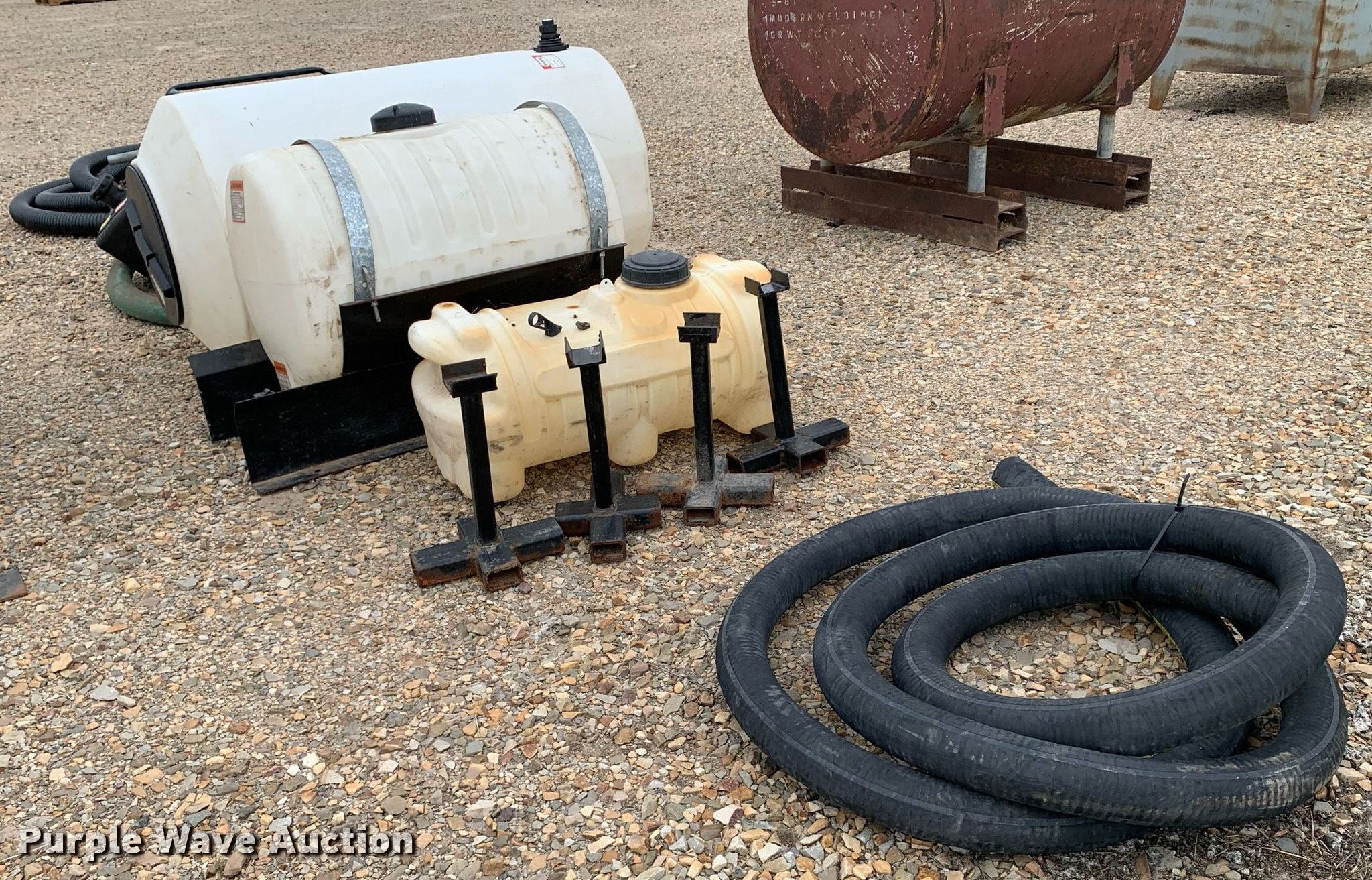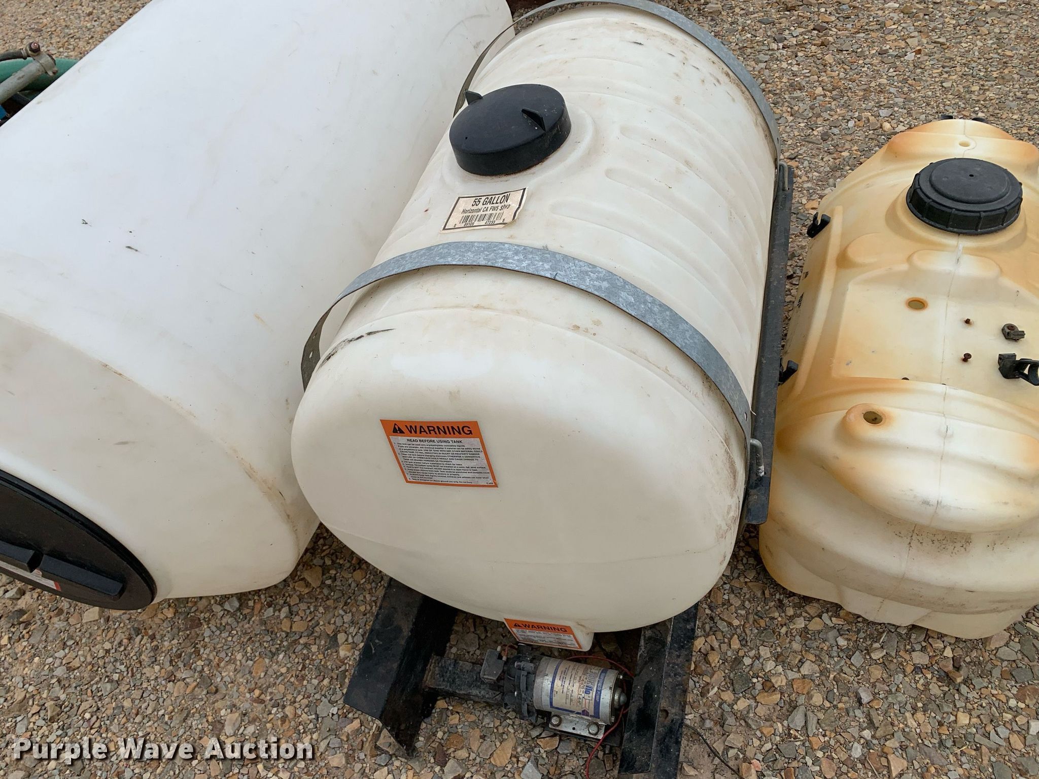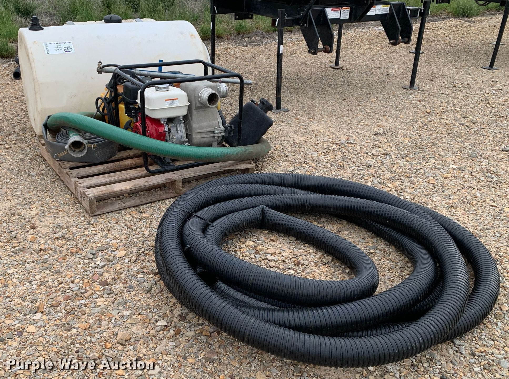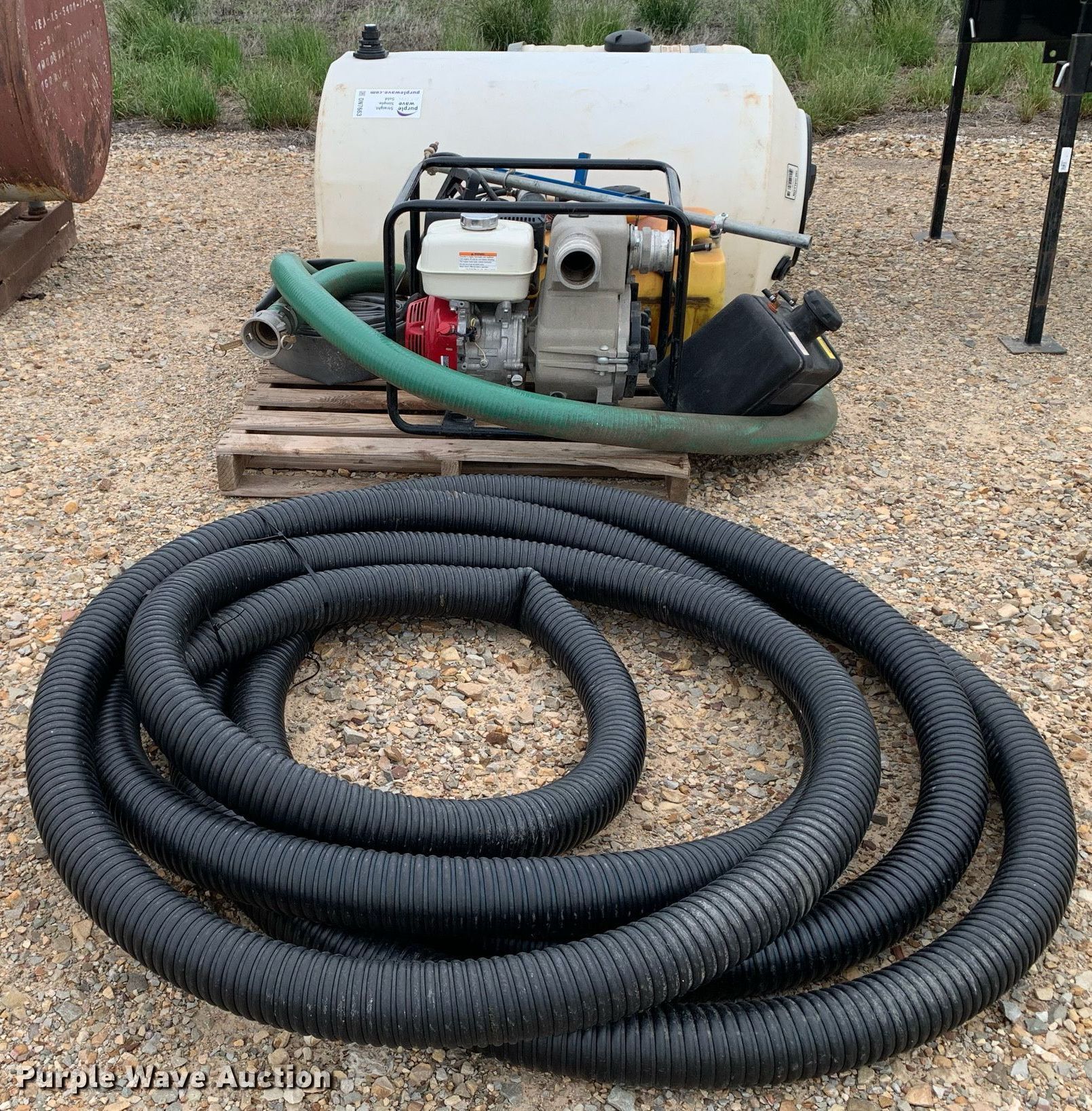 Purple Wave is selling a used Tools in Texas. This item is a Tools with the following: Honda pump, Honda GX240 single cylinder gas engine, 3" inlet/discharge, ATV sprayer, 165 gallon poly tank, 55 gallon poly tank, 12V pump, Hoses