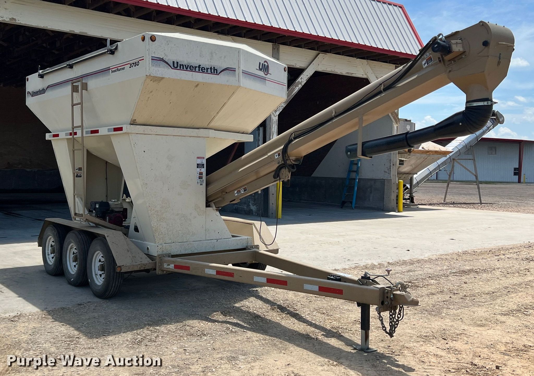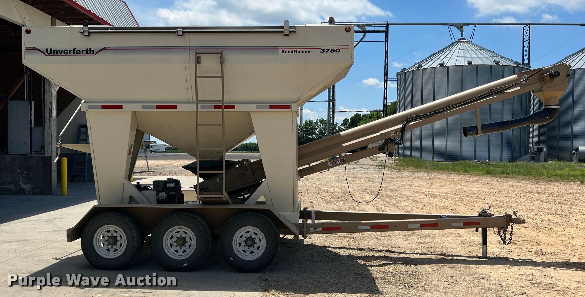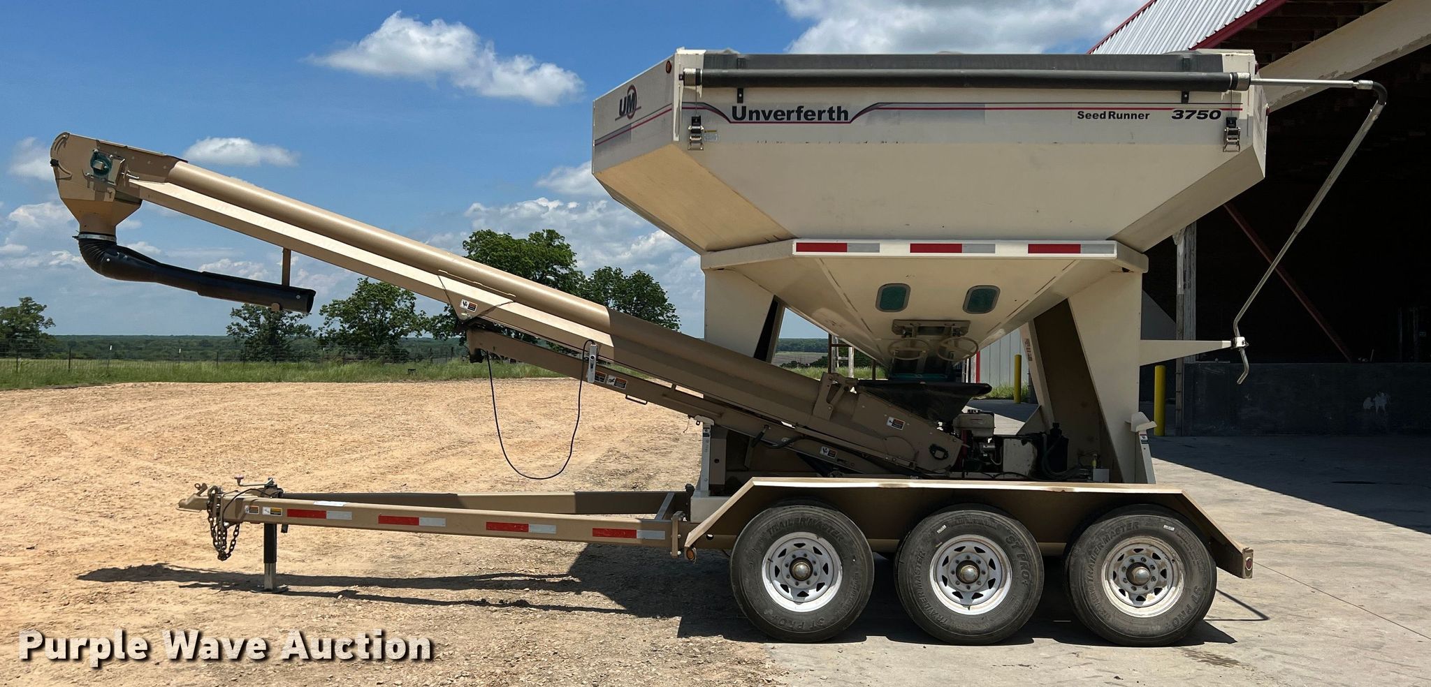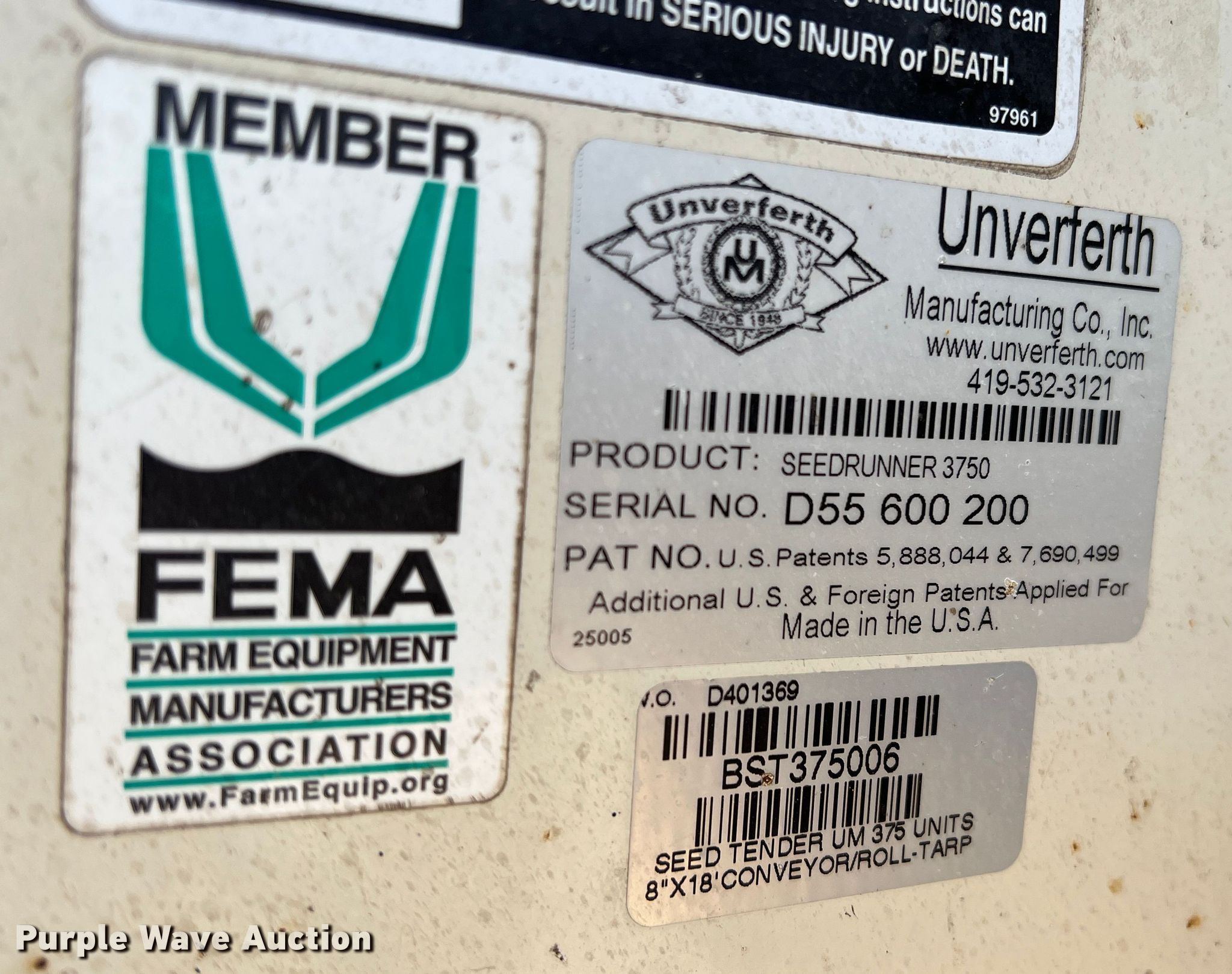 2011 Unverferth SeedRunner 3750 seed tender. Serial: D55 600 200. Features Conveyor width: 8" Length: 18', Shut-off gate: Manual, Sight glass, Compartments: 2, Roll tarp, Ball hitch size: 2 5/16". Tires Size: 235/85R16. Notes Seed not included. PPF - Open Inspection June 19 and 26. 700 FM 1335. Cooper, TX 75432