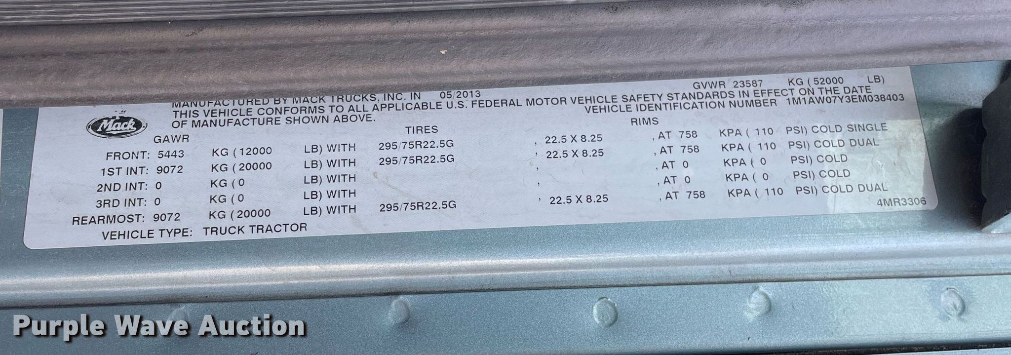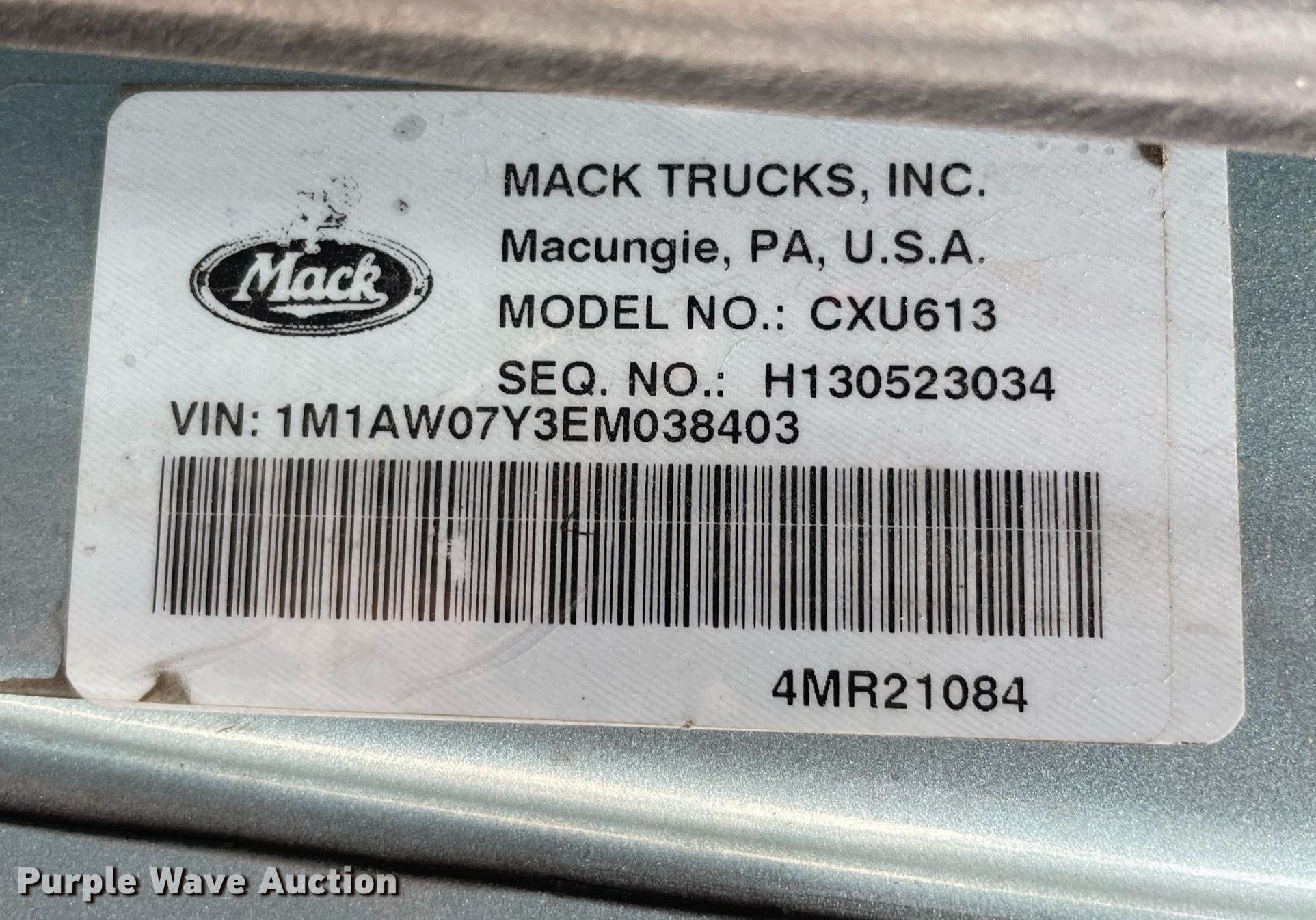 Purple Wave is selling a used Truck Tractor in Ohio. This item is a 2014 Mack CXU613 semi truck with the following: Miles: 530,144 on odometer, Hours: 2,134 on meter, VIN: 1M1AW07Y3EM038403, Unit #: 501
