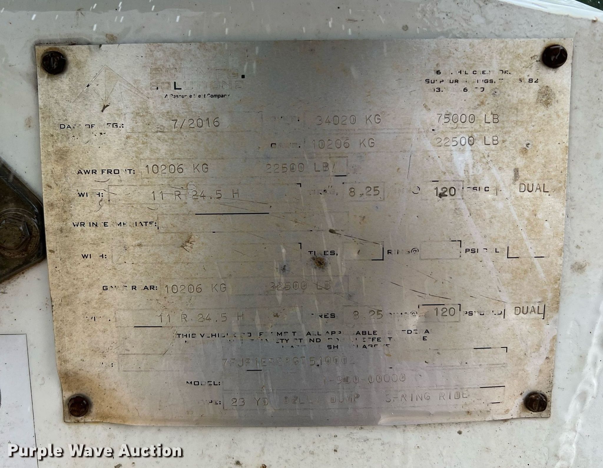 2016 PCI bottom dump trailer. VIN: 7FJP1ER29GT510002. Dimensions Overall: 41' 6" L x 8' W, Sideboard height: 8". Features Body type: Steel, Clamshell gate: Air operated, Trailer controls, Rear push block, Roll tarp. Chassis Landing gear: Dual, Suspension: Spring, Brakes: Air, Axles: Tandem, GVWR: 75,000 lbs, GAWR: 22,500 lbs. Tires Steel wheels, Size: 11R24.5. Texas title. Title has a lien that will be released following the close of the auction. Title distribution may be delayed up to 30 days from verification of funds. C-HOP Construction LLC. 901 3RD Street. Valley Mills, TX 76689