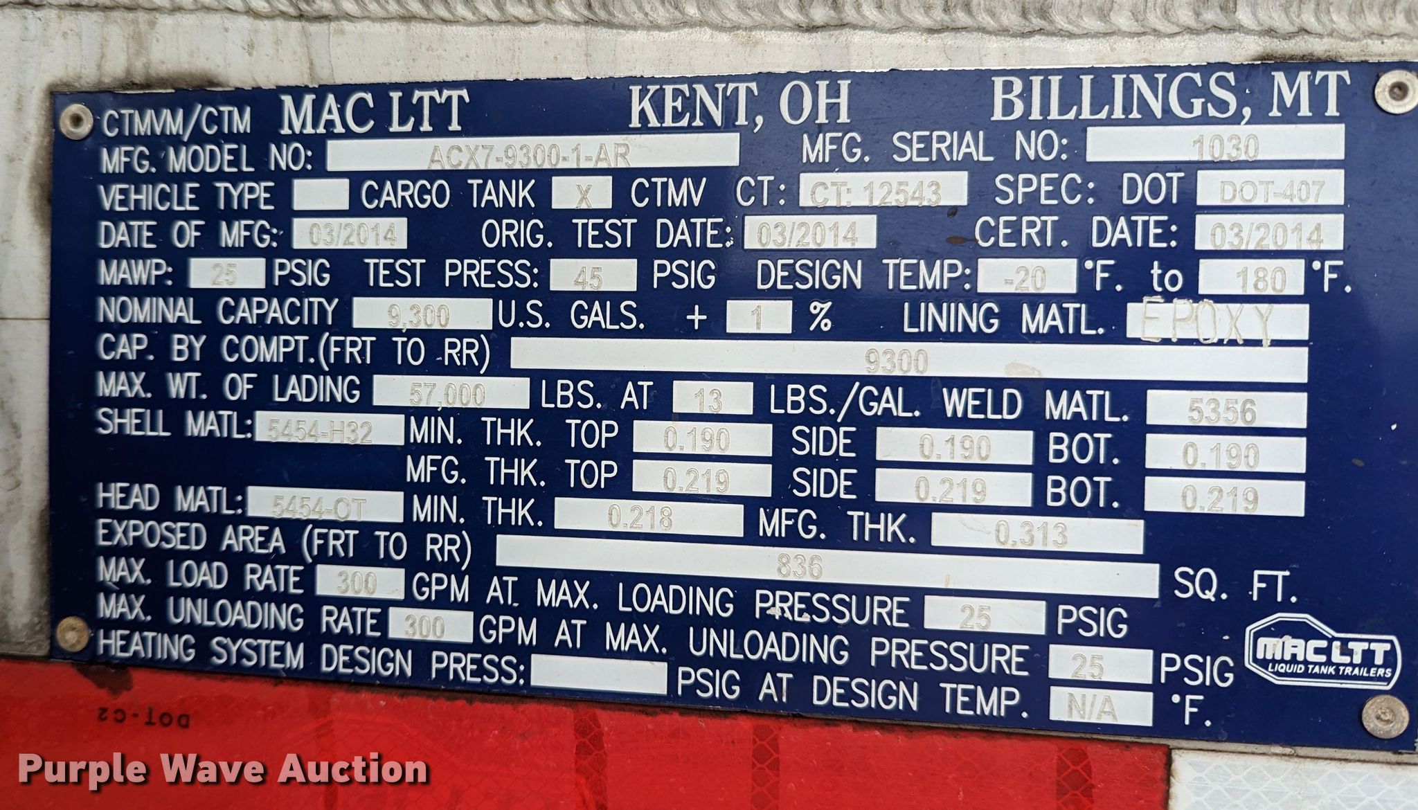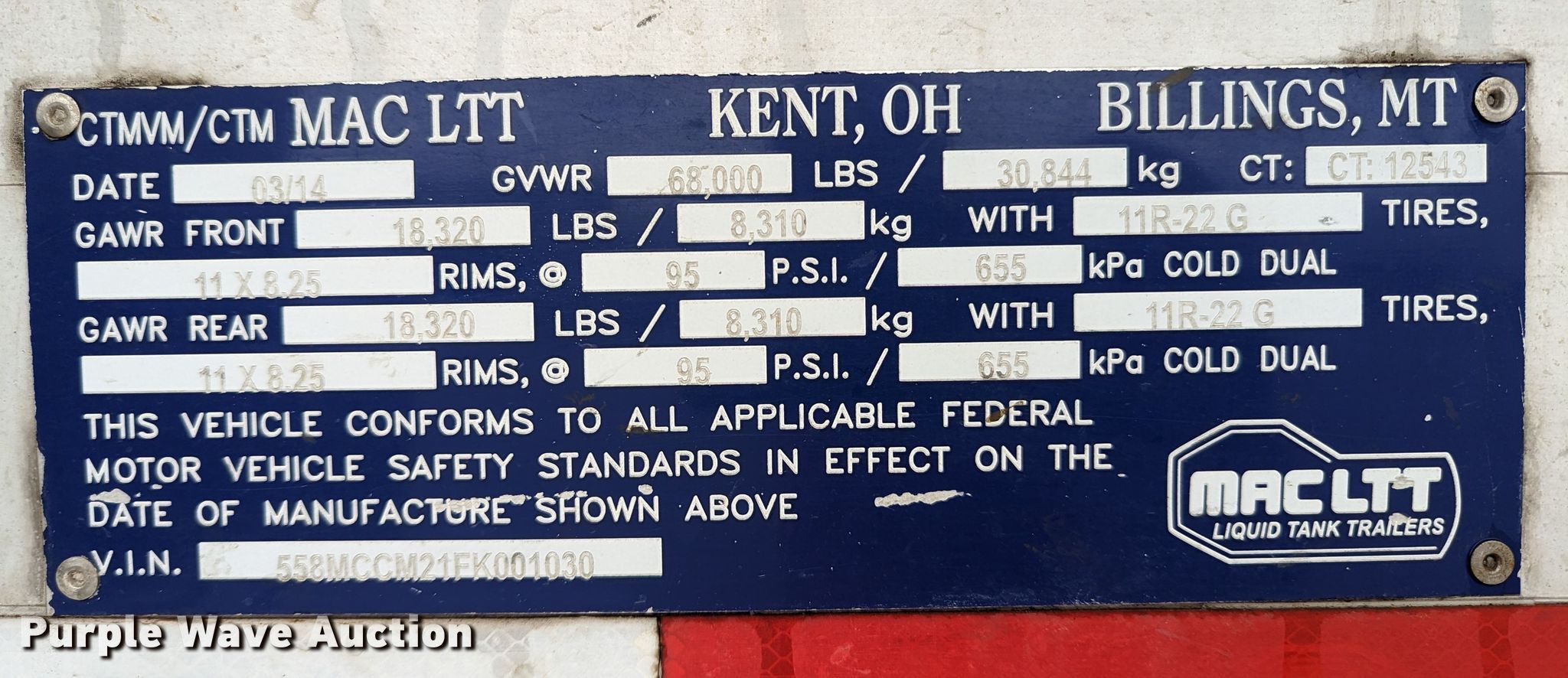 Purple Wave is selling a used Tank Trailer in Oklahoma. This item is a 2015 MAC tank trailer with the following: VIN: 558MCCM21FK001030, Unit #: 4093