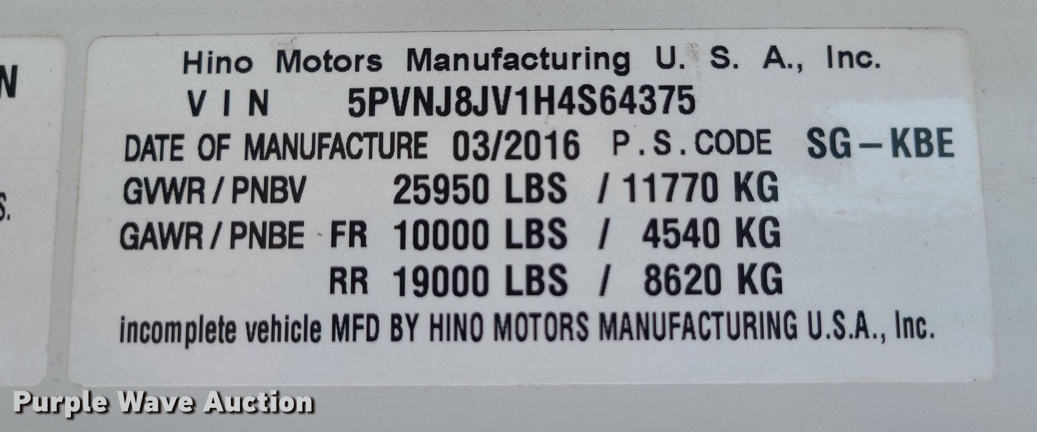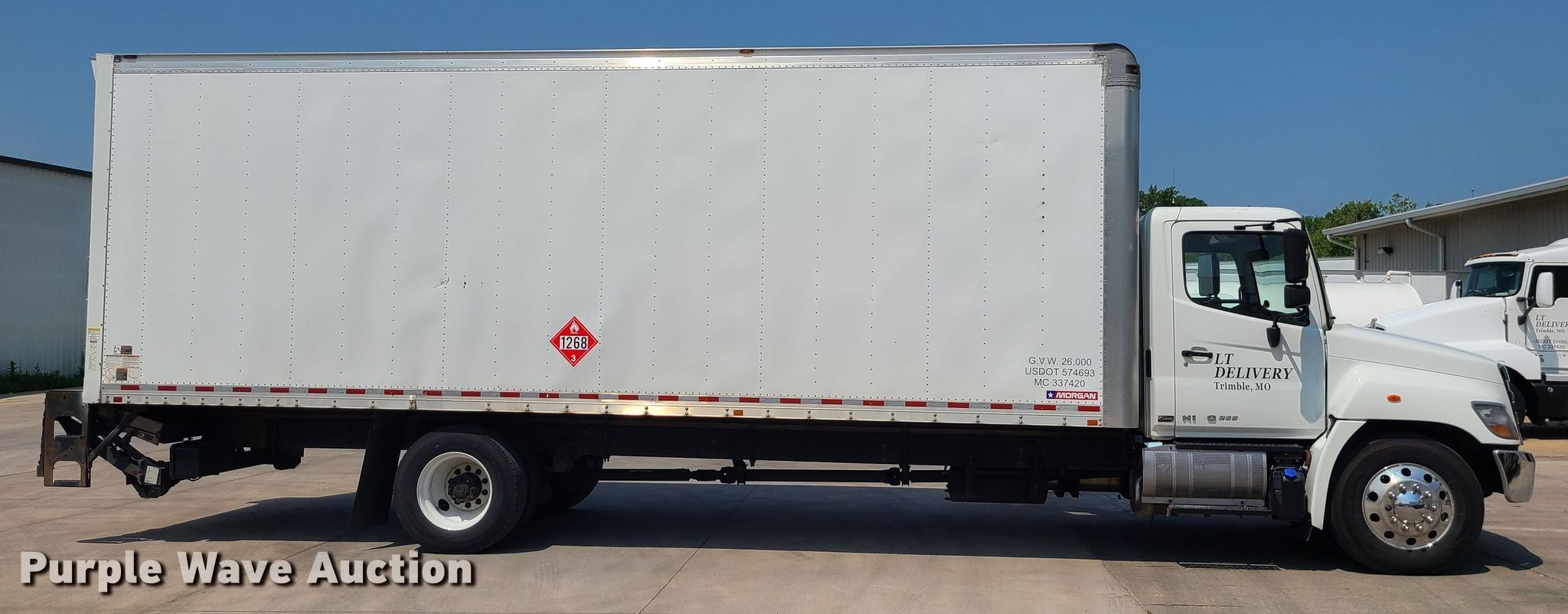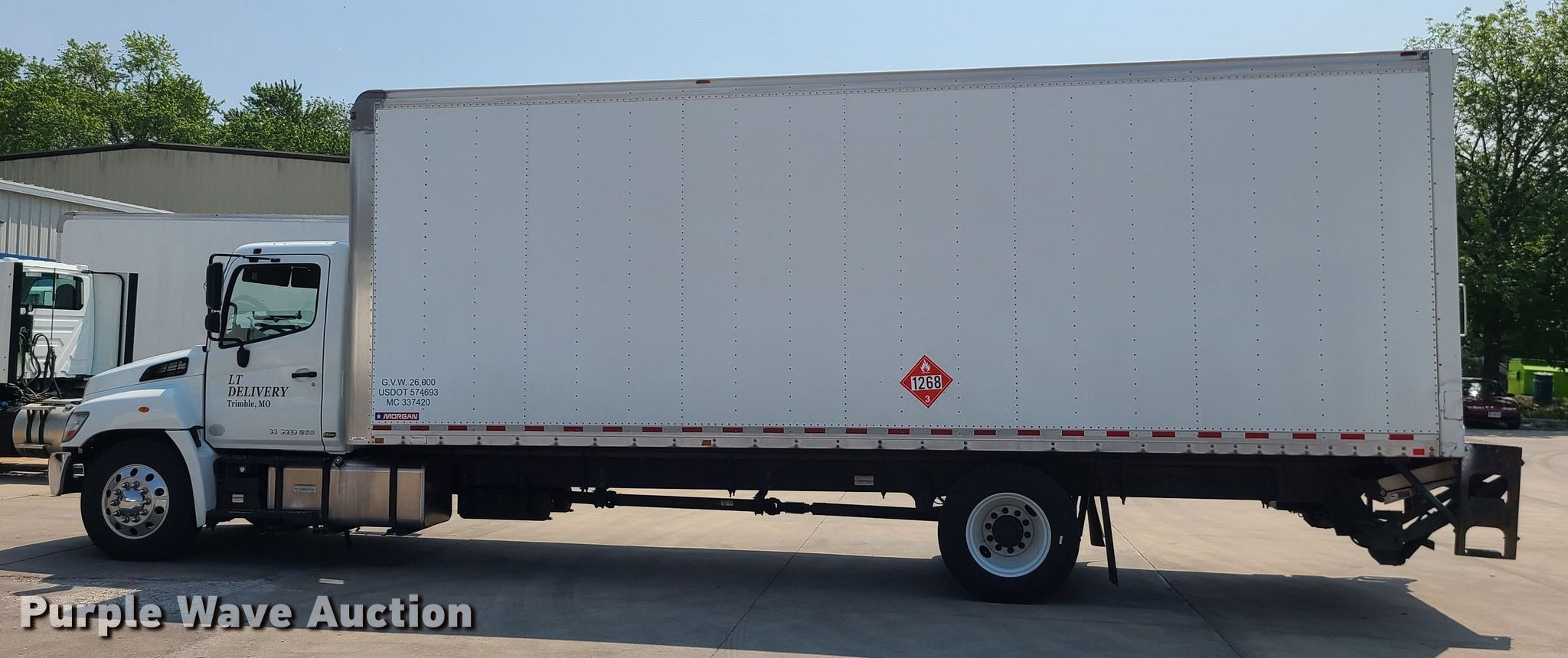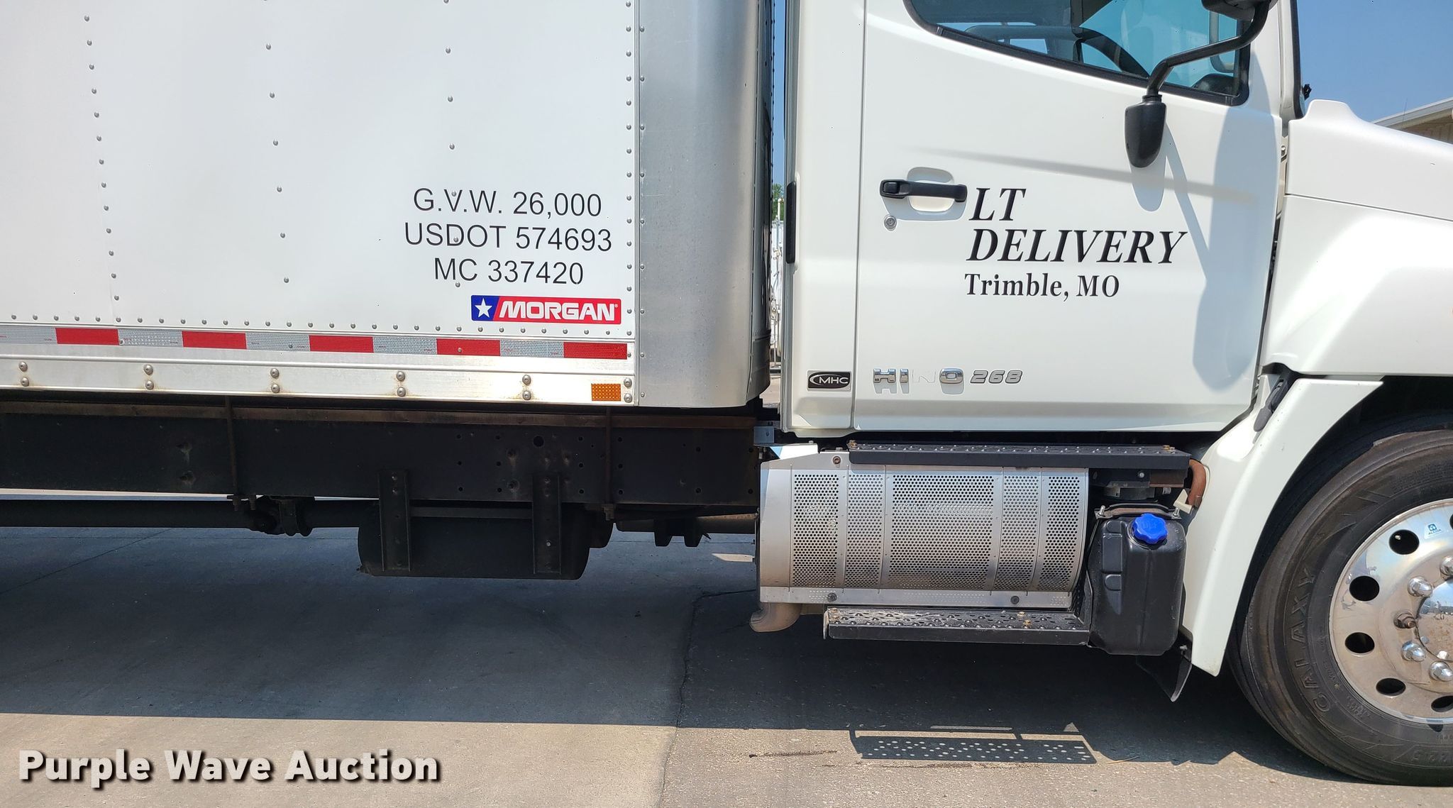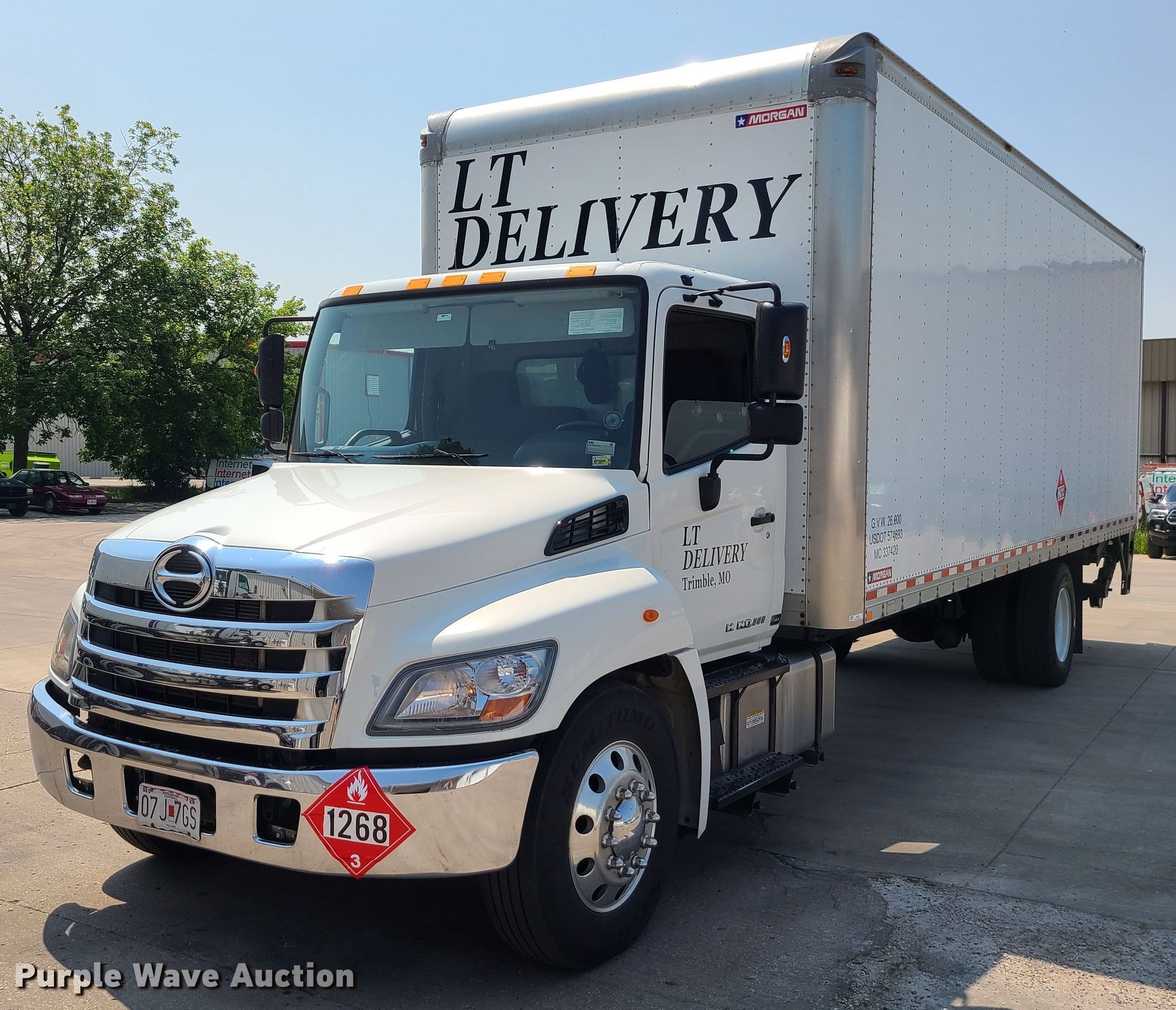 2017 Hino 268A box truck. Miles: 333,904 on odometer, Miles or hours may vary, unit still in use, VIN: 5PVNJ8JV1H4S64375. Engine Displacement: 7.6L, Cylinders: 6, Fuel type: Diesel. Transmission Automatic. Chassis Axles: Single, Suspension: Air, Brakes: Air. Interior AC, Heat, Power windows, Power locks, Cruise control. Features Box bed Morgan, 26' L x 102" W, Floor: Wood, End gate lift Maxon.. Tires Size: 295/75R22.5. Notes Contents not included. Missouri title. Title distribution may be delayed up to 14 days from verification of funds. LT Delivery, Inc.. 5034 NW Waukomis Dr. Northmoor, MO 64151