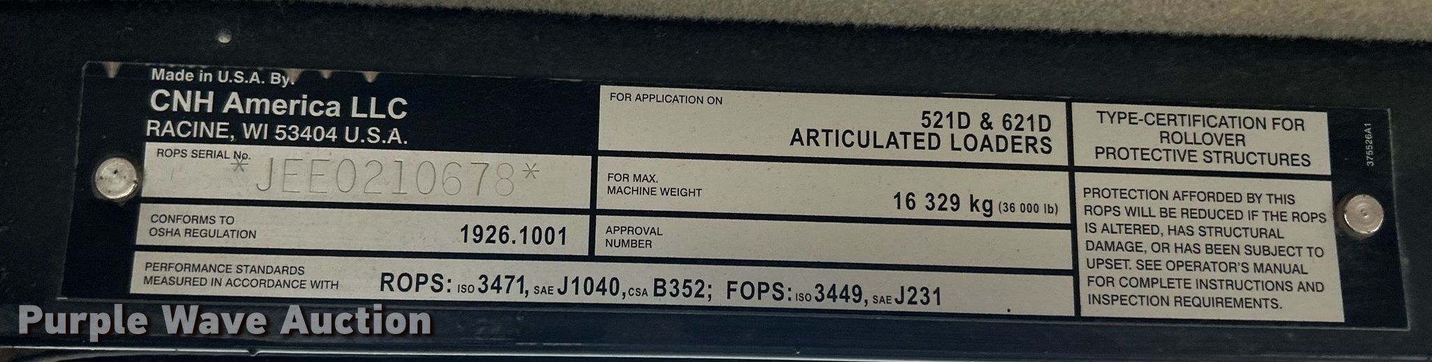 2007 Case 621D XT wheel loader. Hours: 3,544 on meter, Serial: JEE0200597. Engine Case, Cylinders: 6, Fuel type: Diesel. Transmission Powershift, 4F - 3R. Operators station EROPS, AC, Heat, Bucket controls: Joystick, Ride control. Features Auxiliary hydraulics: Front, Quick coupler: Hydraulic, Counter weights, Bucket JRB, Capacity: 2.5 cu.yd., Width: 100", Self- leveling bucket, Cutting edge: Bolt-on, Forks JRB, Length: 60". Tires Size: 20.5-25. Lewis Backhoe & Excavating, Inc. - Open inspection June 16 and 28. 6645 Mitchell Road Southeast. Saint Joseph, MO 64507