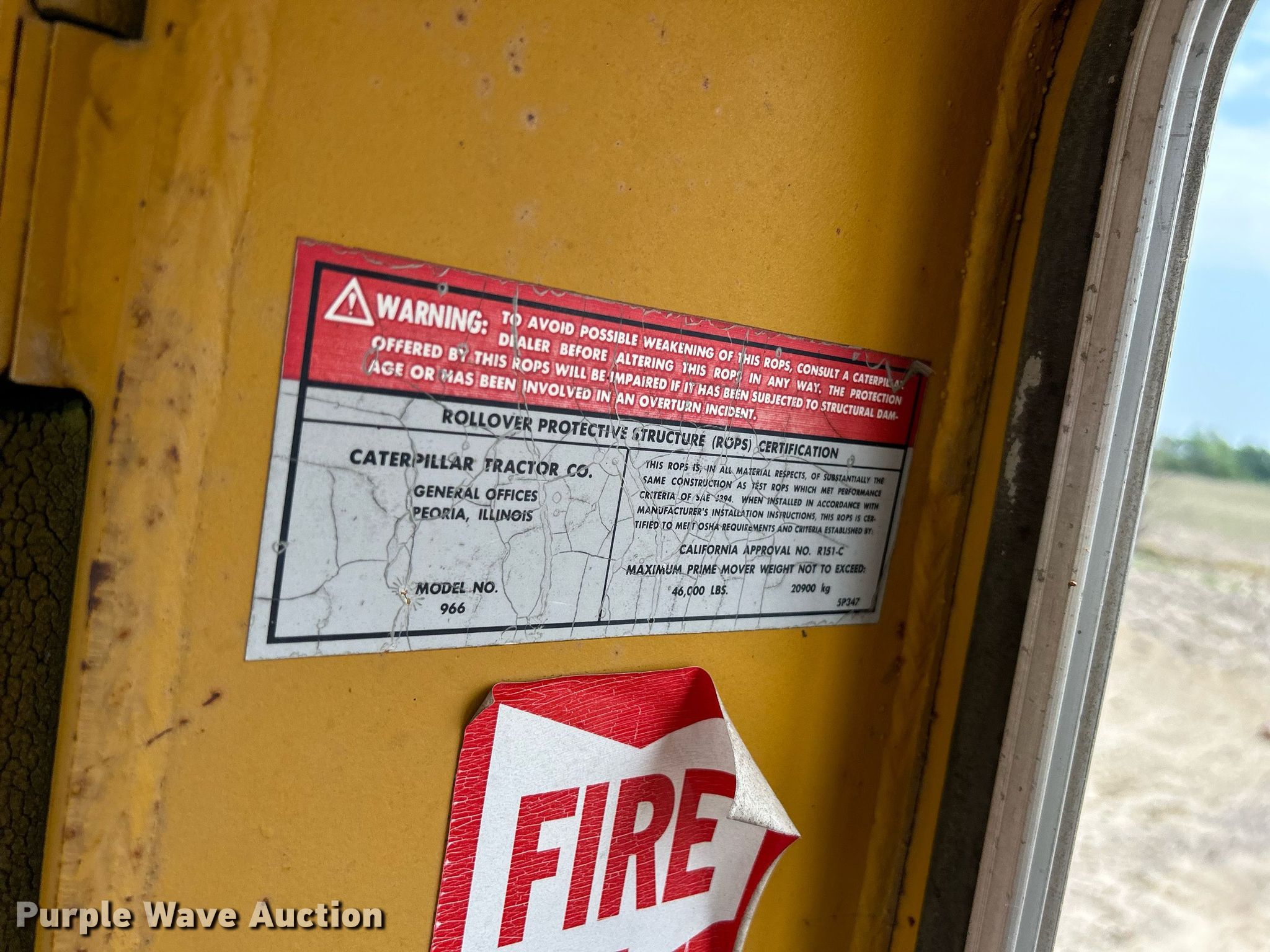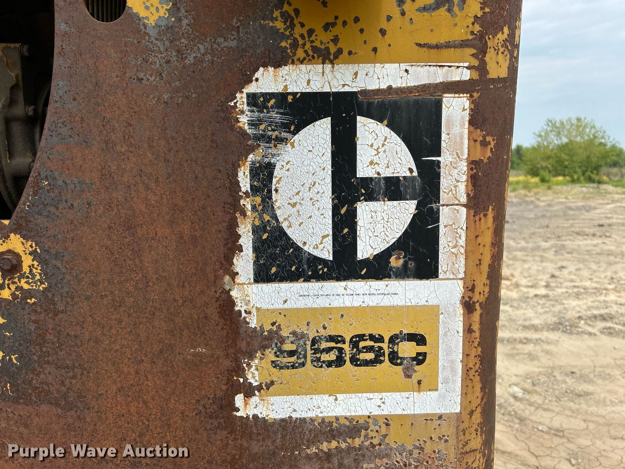 1973 Caterpillar 966C wheel loader. Serial: 76J6718. Engine Caterpillar, Cylinders: 6, Fuel type: Diesel. Transmission Powershift, 4F - 4R. Operators station EROPS, Bucket controls: Two-lever. Features Quick coupler: Hydraulic, Bucket Width: 112". Tires Size: 23.5R25. Notes Glass cracked/missing. Lewis Backhoe & Excavating, Inc. - Open inspection June 16 and 28. 6645 Mitchell Road Southeast. Saint Joseph, MO 64507