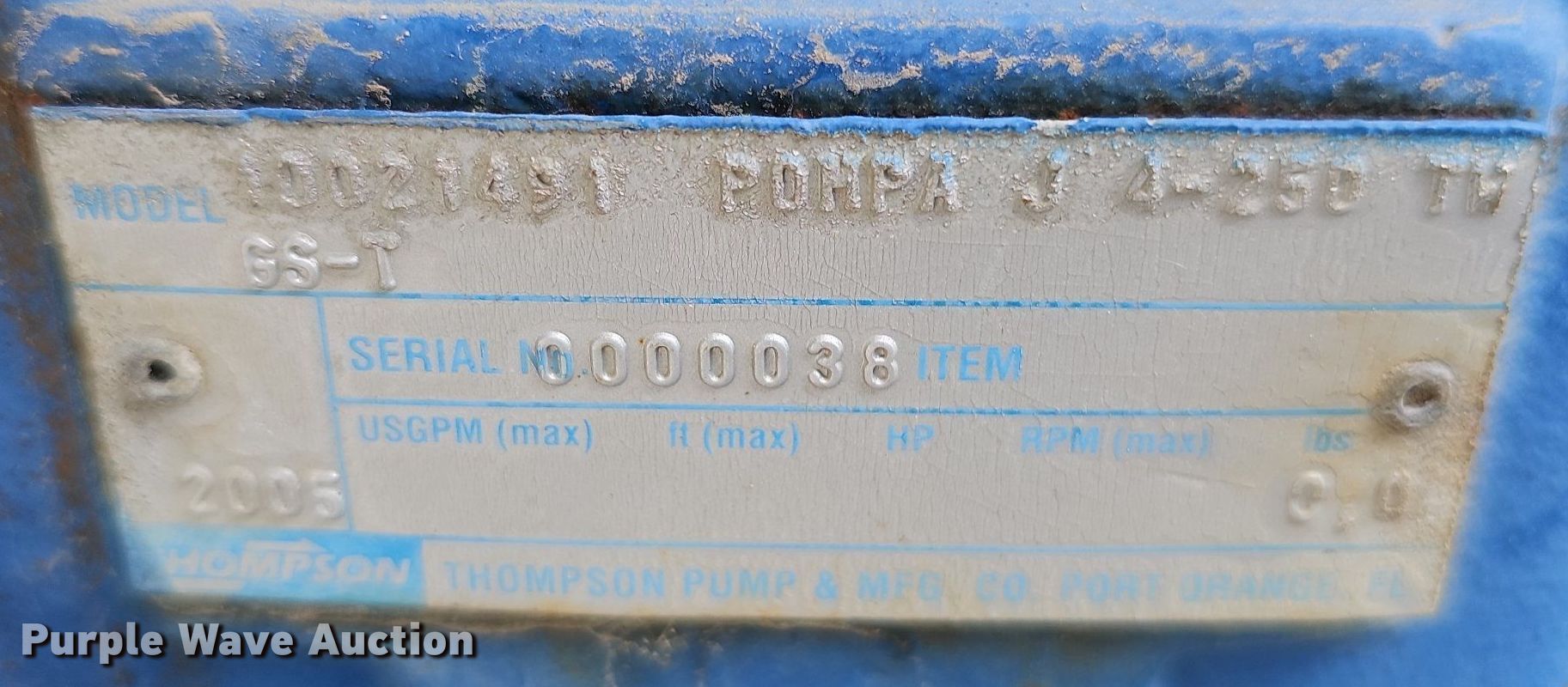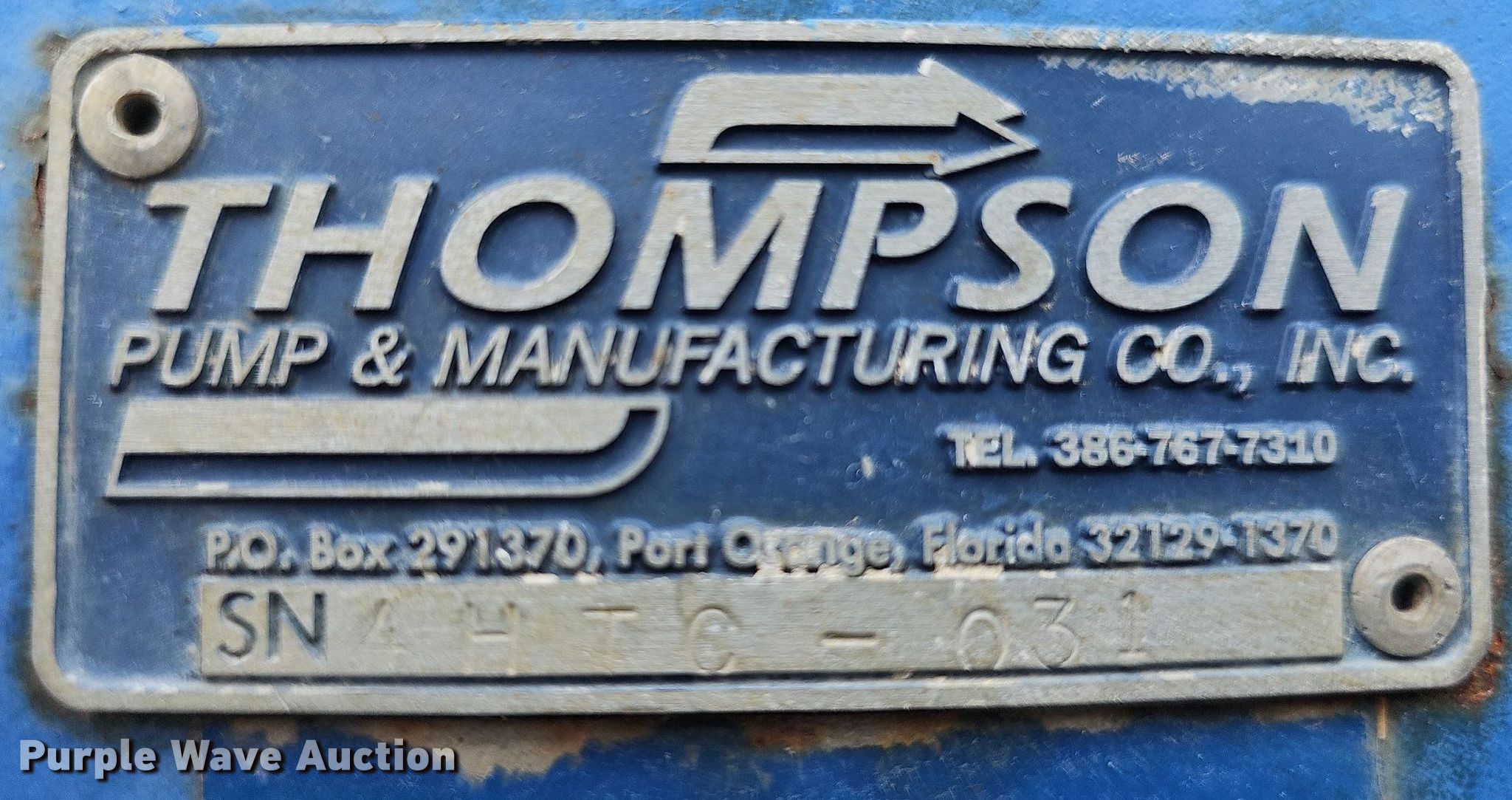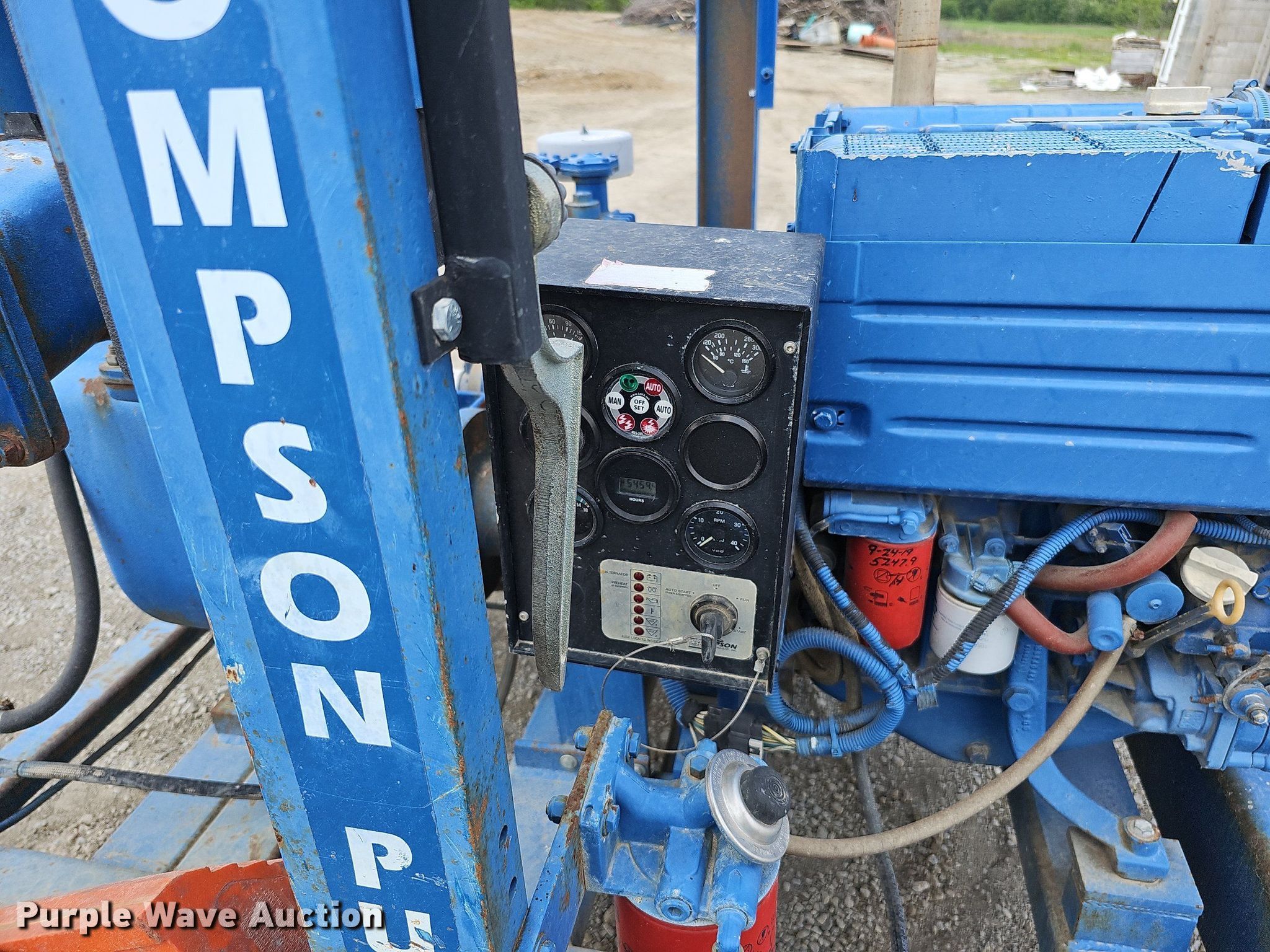 Purple Wave is selling a used Pump in Missouri. This item is a Thompson pump with the following: Hours: 5,459 on meter, Serial: 4HTC-031