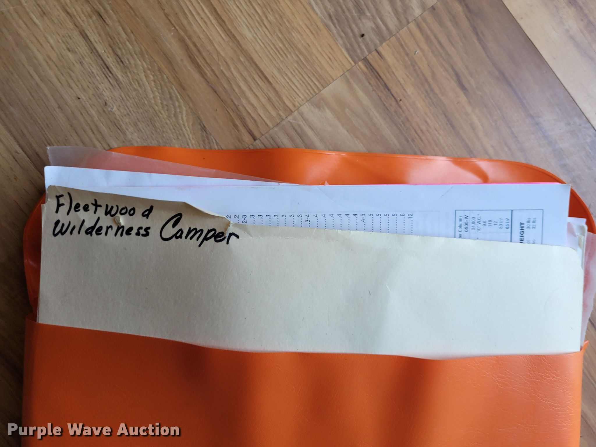 2001 Fleetwood Wilderness GL camper. Camper length: 27', VIN: 1ED1F292914277412. Chassis Axles: Tandem, Suspension: Spring. Interior Kitchen: Sink, Refrigerator, Freezer, Microwave, Oven, Stove: Propane, Living room: Table, Couch, Bathroom, Beds: 1, TVs: 2, Sound system, Heater, AC units: 1. Features Slide outs: 1, Awnings: 1 Awning type: Electric, Ball hitch: 2 5/16", Hitch sway bar. Tires Size: 225/75R15. Notes Slide-out switch replaced with after-market switch, non-operational auto-stop, Awning damage. Kansas title. Title distribution may be delayed up to 14 days from verification of funds. 825 Levee Drive. Manhattan, KS 66502