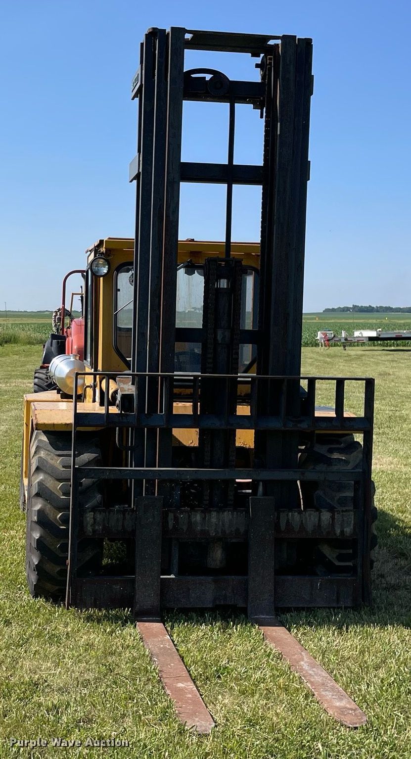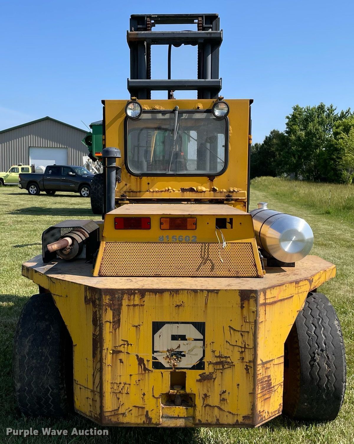 Sellick SG60 forklift. Hours: 2,932 on meter, Serial: 2707605651. Engine Continental, Cylinders: 4, Fuel type: Gas. Transmission Powershift, 4F - 4R. Operators station Enclosed cab. Features Maximum lift capacity: 6,000 lbs, Maximum lift height: 264", Mast stages: 3, Side shift, Mast tilt, Fork length: 52". Tires Front: 15-19.5NHS, Rear: 12-16.5LT, Foam filled. EquipmentCity LLC. 11652 Illinois 54. Clinton, IL 61727