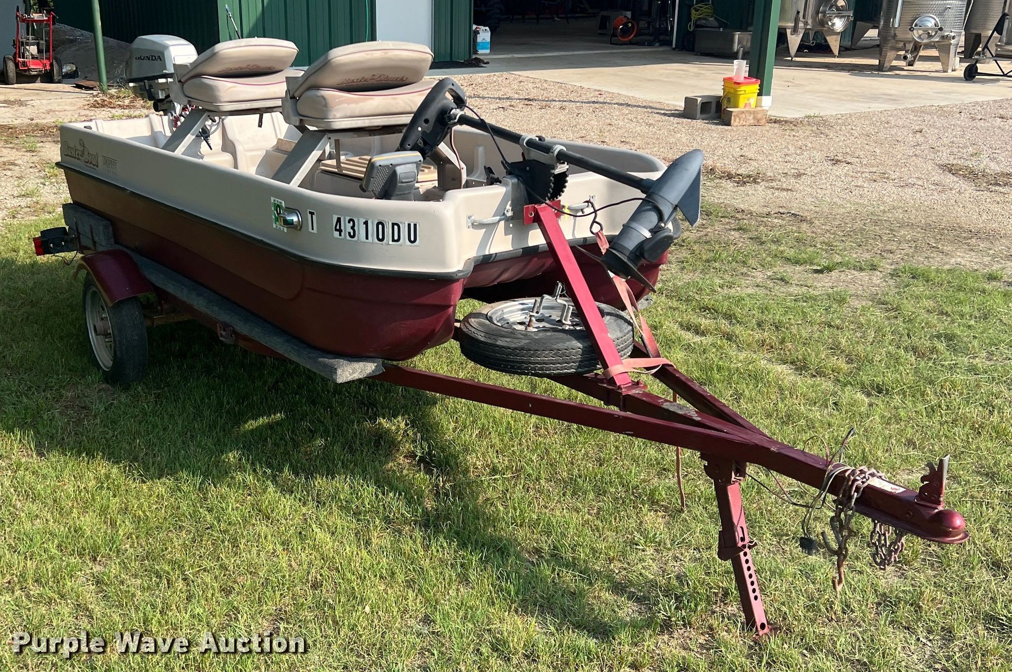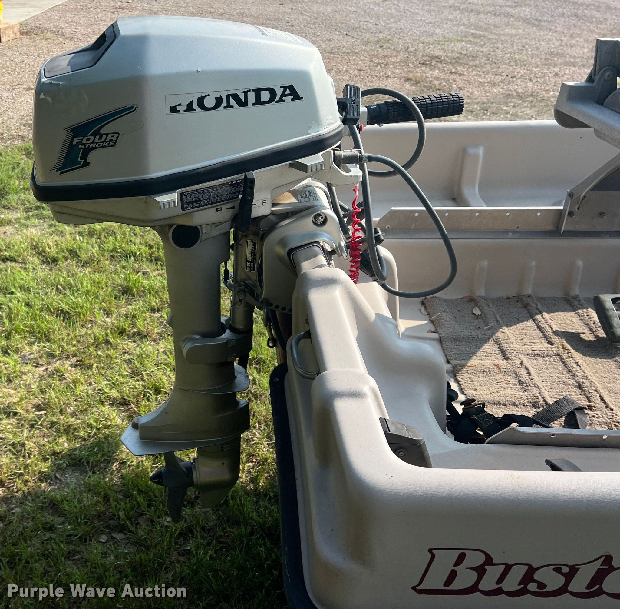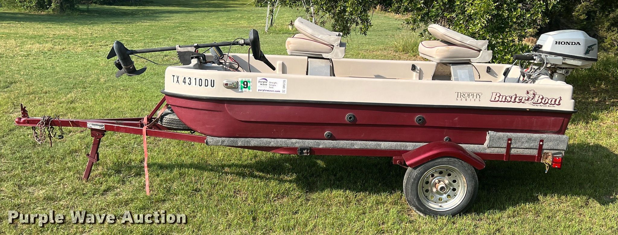 2001 Buster boat. Length: 9', Hull ID: PHGTS040H001. Engine Engine type: Outboard, Honda , Serial: 1801685, Displacement: 127 cc, Cylinders: 1, Fuel type: Gas, Outdrive Propeller: Aluminum. Operators station Capacity Person: 2, Depth finder: Humminbird 300TX. Features Trolling motor: Tilt tiller. Trailer 2001 Splash Marine , VIN: 1S9BF13191S376099, Overall length: 13', Overall width: 60", GVWR: 700 lbs, Ball hitch size: 2", Axles: Single, Tire size: 4.80-12. Boat: Texas title. Outboard motor: Texas title. Trailer: Transfer of ownership of the trailer will be a bill of sale. Title distribution may be delayed up to 14 days from verification of funds. 2607 Suzanne Trail. Hudson Oaks, TX 76087