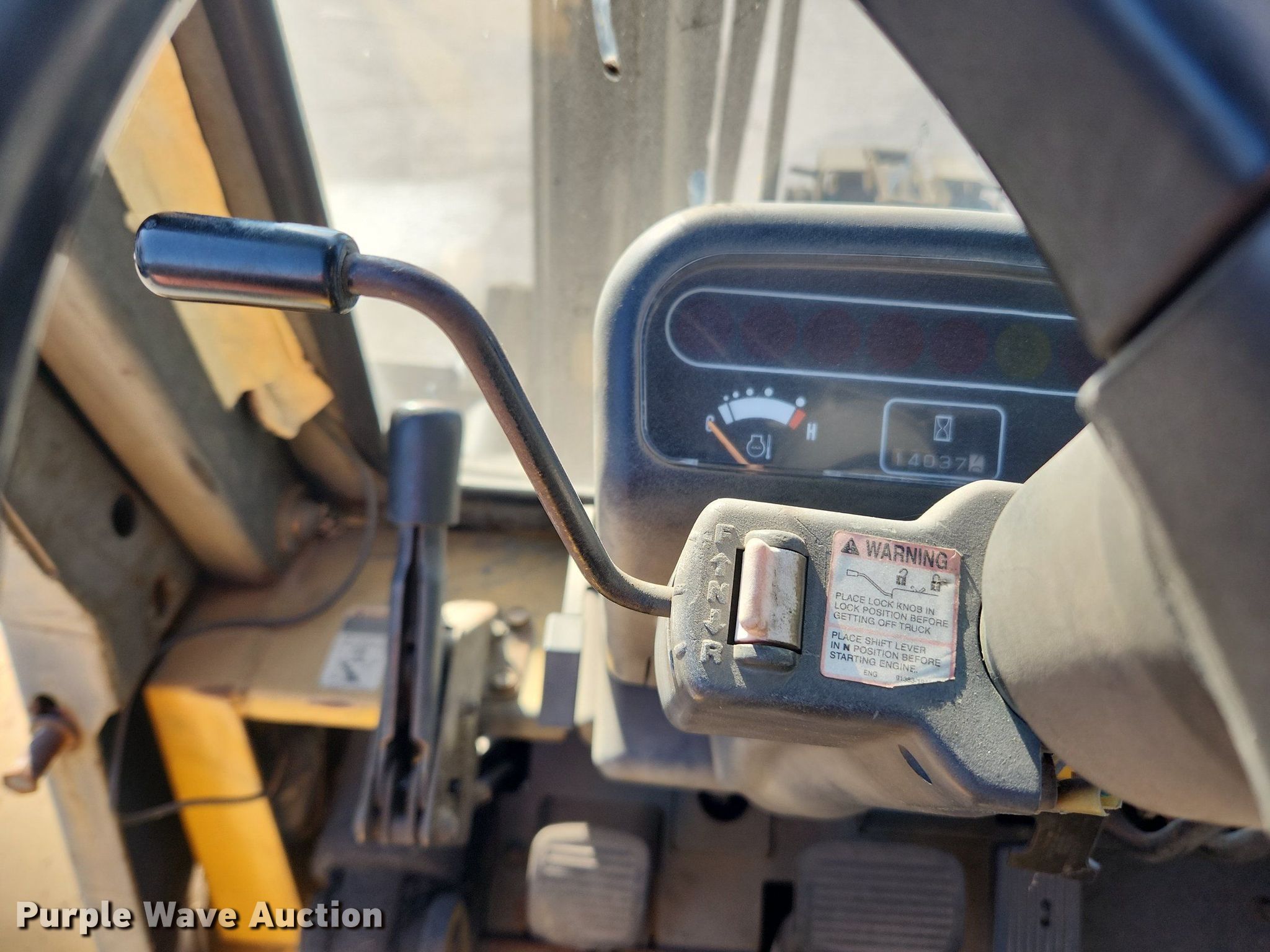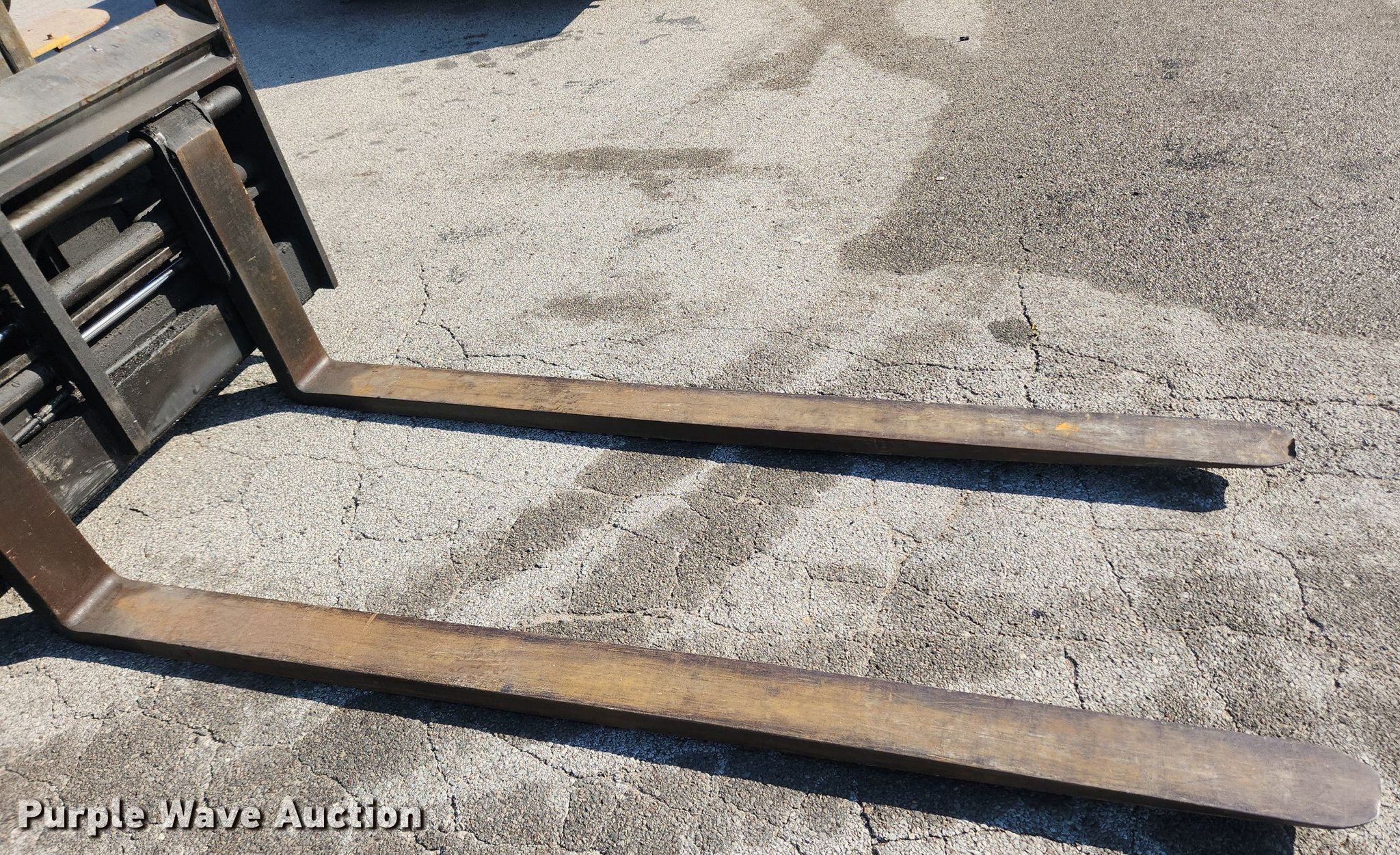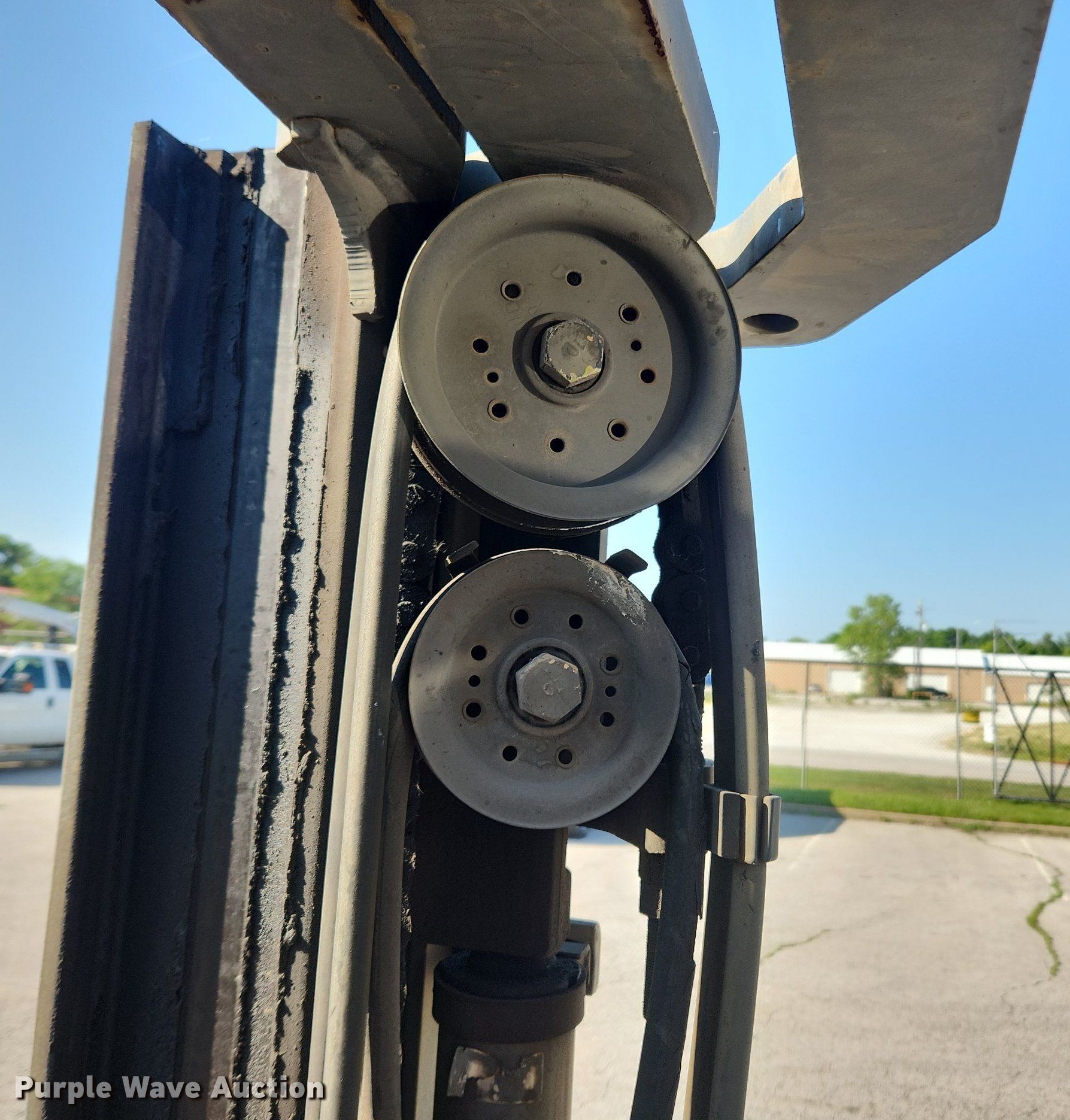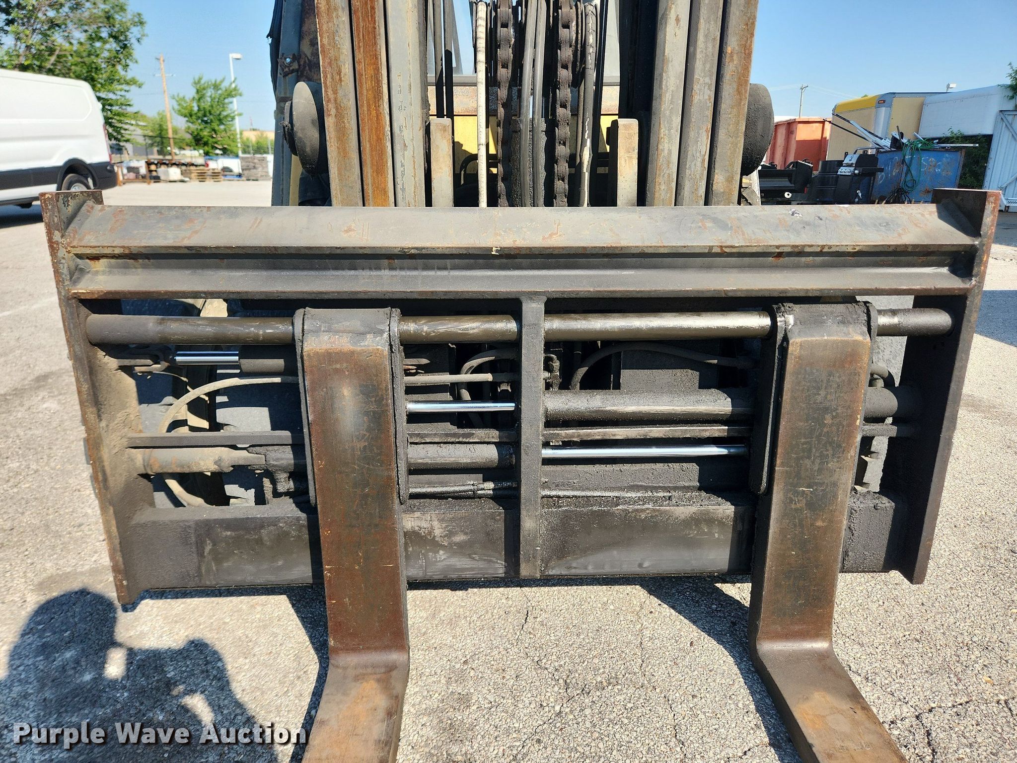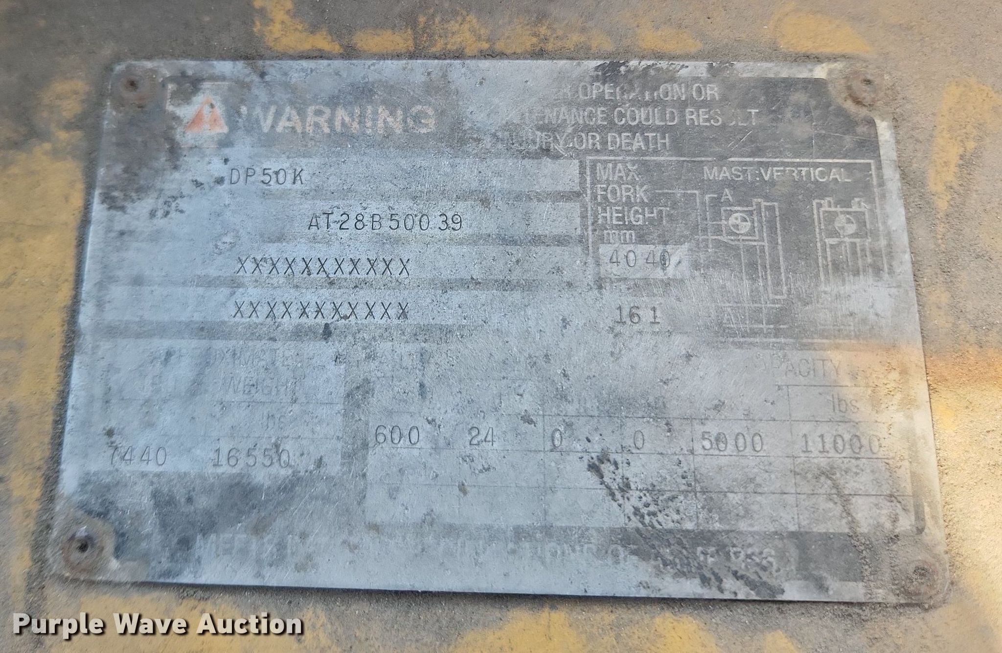 Caterpillar DP50K forklift. Hours: 14,038 on meter, Serial: AT-28B50039. Engine Cylinders: 6, Fuel type: Diesel. Transmission Powershift. Operators station Heat. Features Maximum lift capacity: 11,000 lbs, Maximum lift height: 161", Mast stages: 3, Side shift, Mast tilt, Fork length: 96". Tires Front: 825-15, Rear: 7.00-12, Solid. Notes Missing drivers side door, Passenger door glass cracked, Main cylinder needs rebuilt, Needs brakes. Knapheide Truck Equipment Center. 10101 Mid Rivers Mall Drive. St. Peters, MO 63376