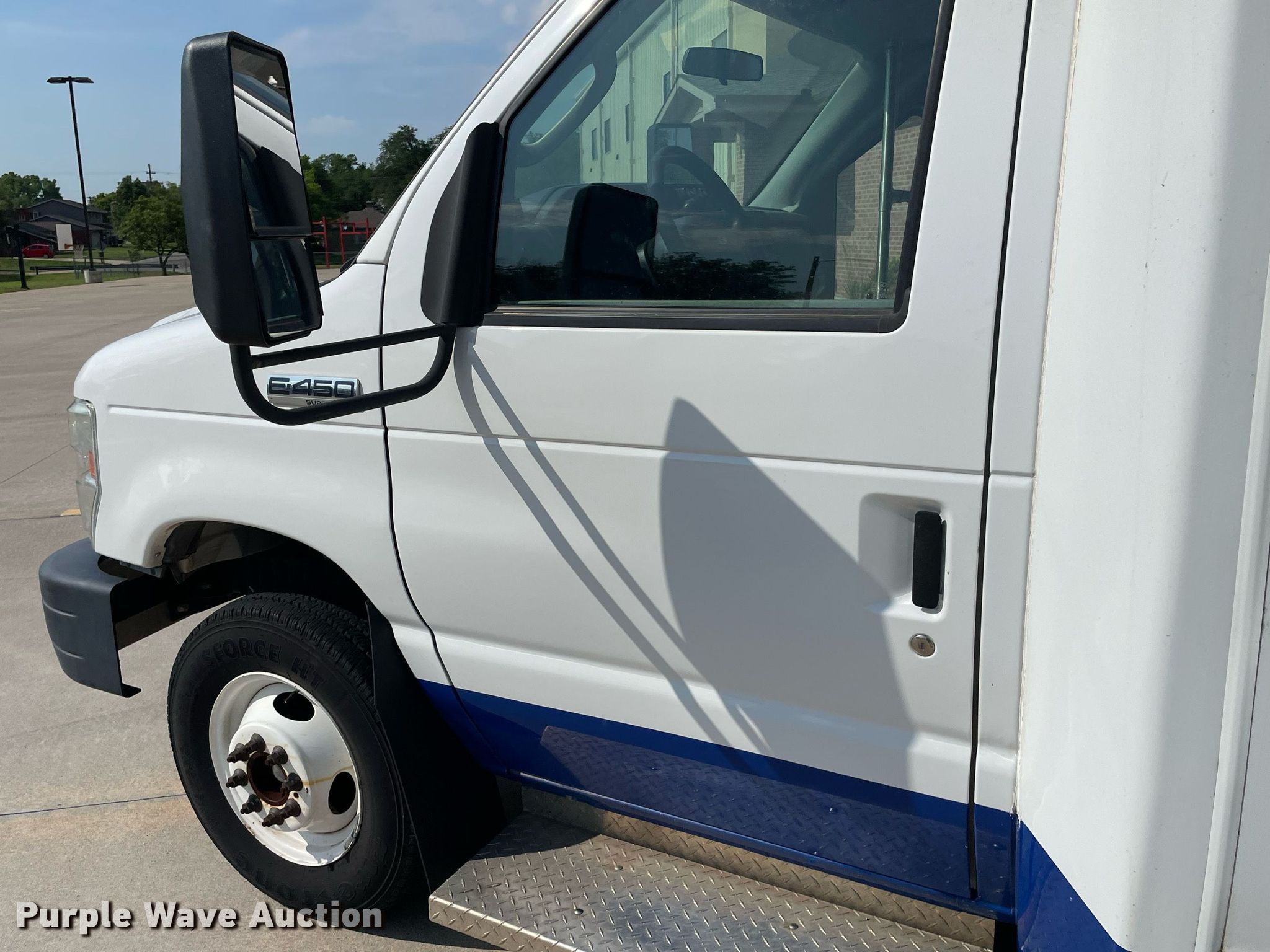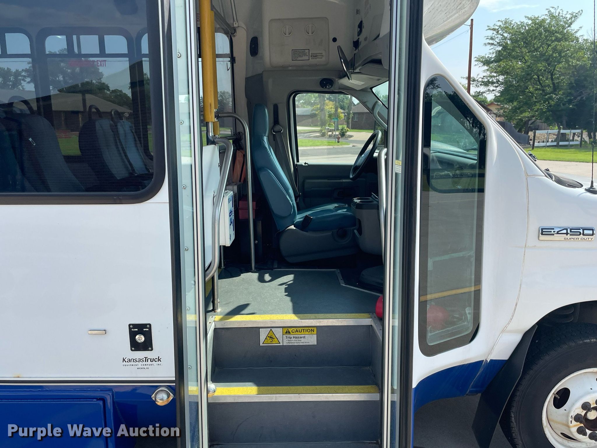 2012 Ford E450 Super Duty shuttle bus. Miles: 189,269 on odometer, VIN: 1FDFE4FS8CDA92821. Engine Displacement: 6.8L, Cylinders: 10, Fuel type: Gas. Transmission Automatic. Chassis Axles: Single, Suspension: Spring, Brakes: Hydraulic, GVWR: 14,500 lbs. Interior AC, Heat, Cruise control, Electric passenger sliding door, Passengers: 18, Wheelchair lift. Tires Size: 225/75R16. Notes Possible emergency egress leak. Kansas title. Journey Mennonite Church. 808 S Poplar. South Hutchinson, KS 67505