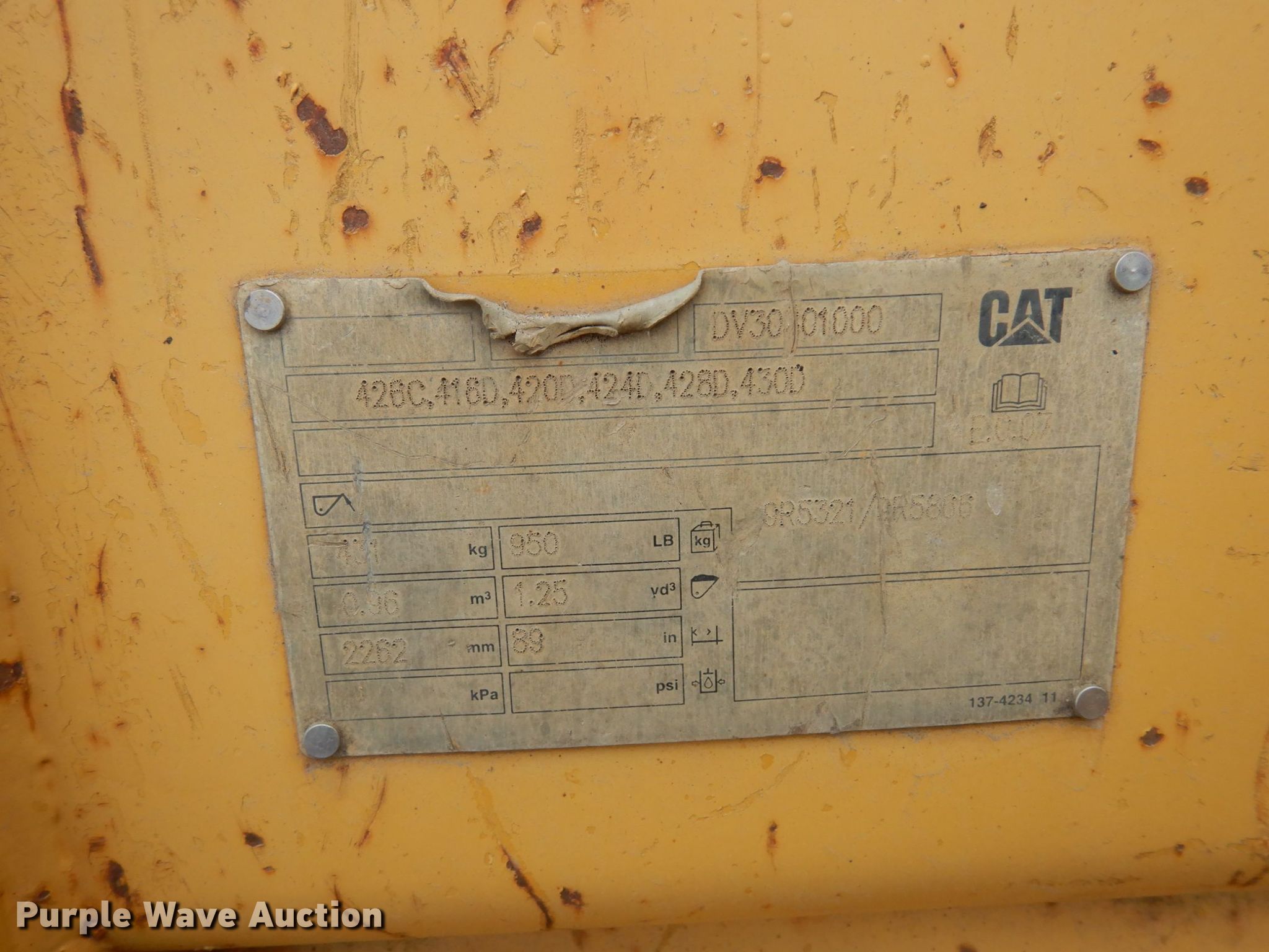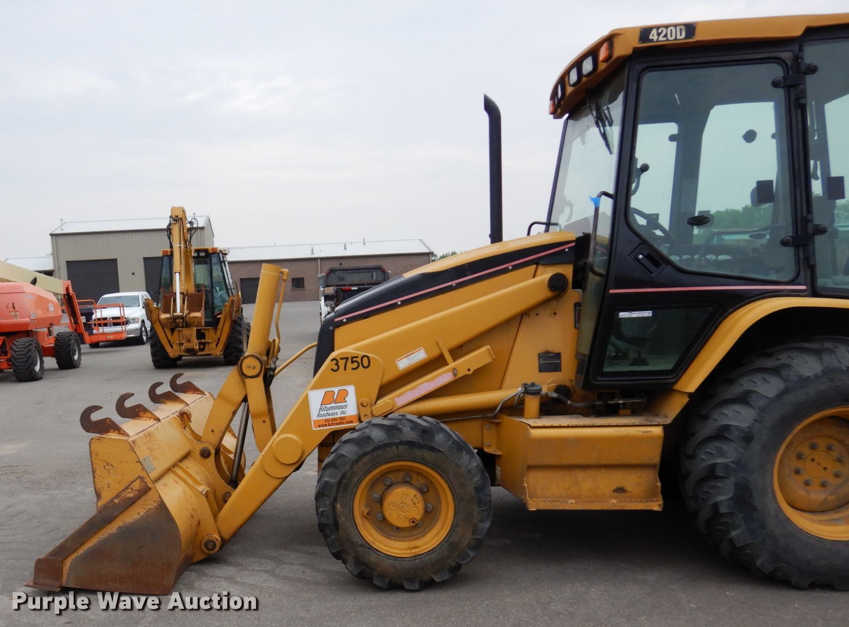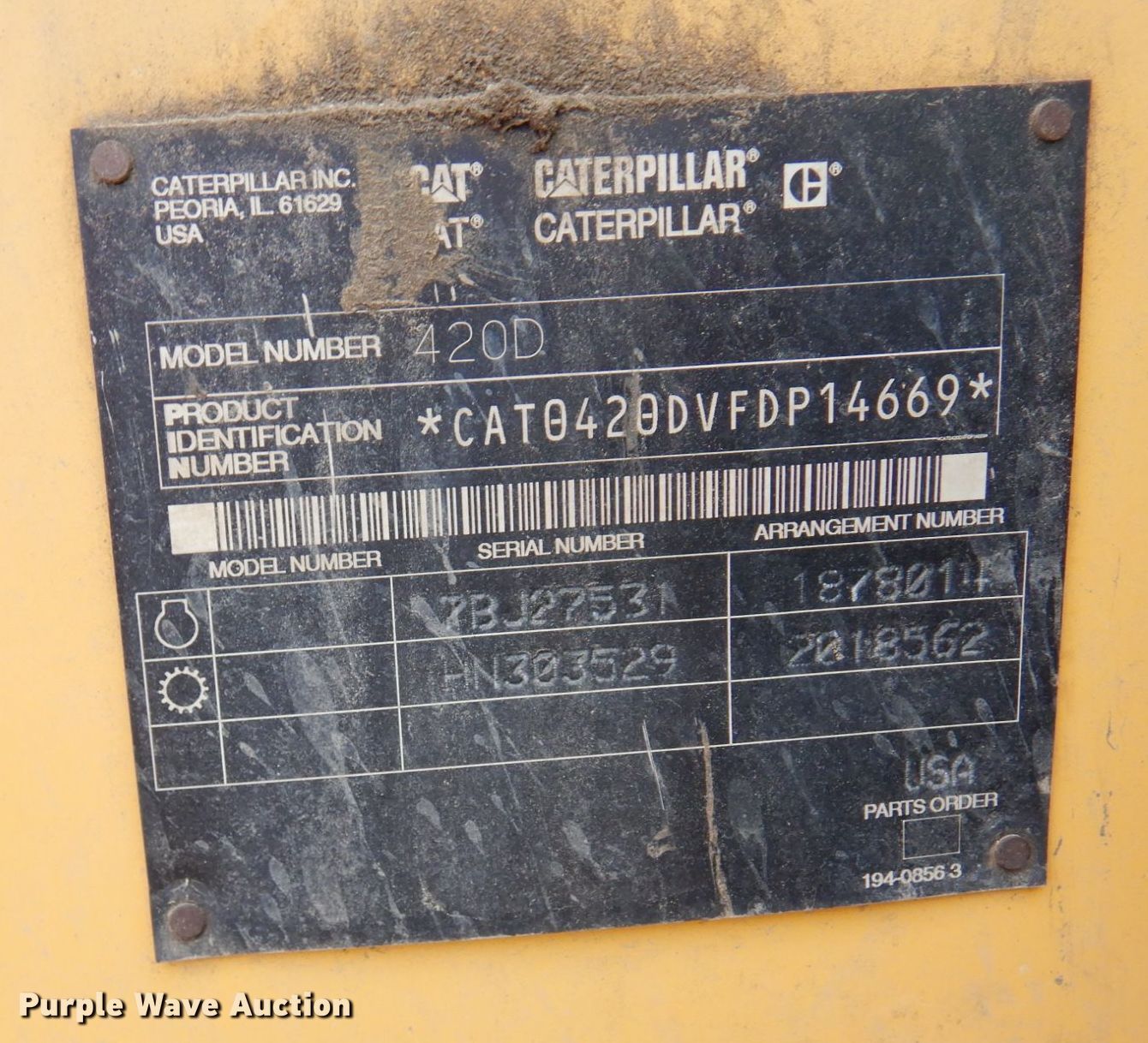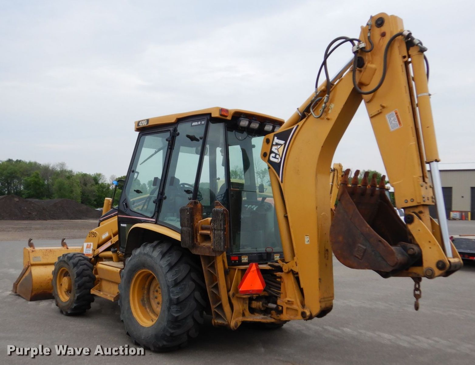 2003 Caterpillar 420D backhoe. Hours: 4,106 on meter, Serial: CAT0420DVFDP14669. Engine Caterpillar, Cylinders: 4, Fuel type: Diesel. Transmission Shuttle shift, 4F - 4R. Chassis Four wheel drive, Differential lock. Operators station Enclosed cab, AC, Heat, Backhoe controls: Wobble stick / two stick Foot control. Features Loader Bucket Caterpillar, Capacity: 1.25 cu.yd., Width: 87.5", Cutting edge: Bolt-on, Backhoe Extendable stick, Width: 29", Cutting edge: Wld-on, Teeth: 5. Tires Front: 12.5/80-18IMP, Rear: 19.5L-24. Notes AC belt removed. 13363 West Freeway Drive. Hugo, MN 55038