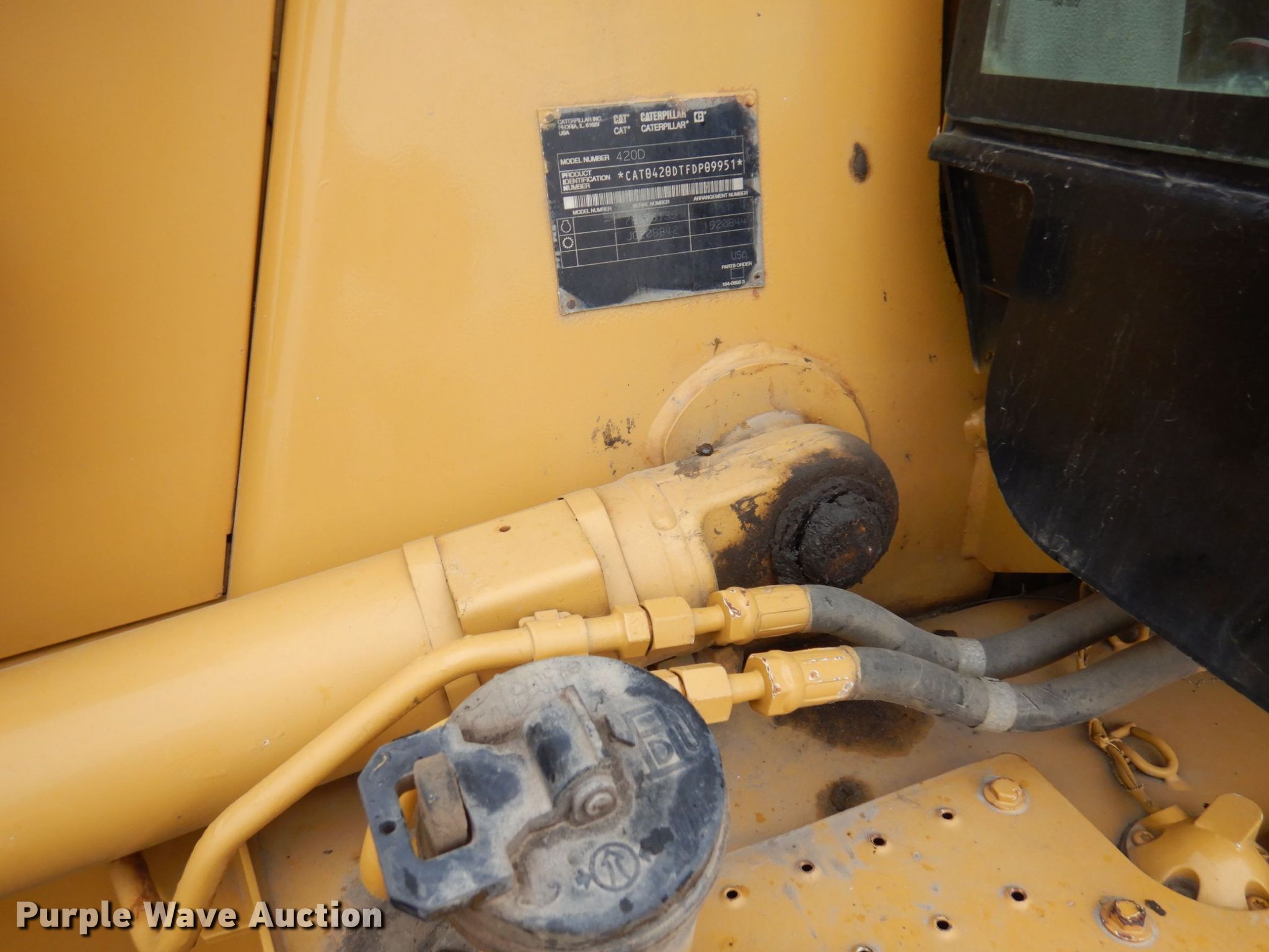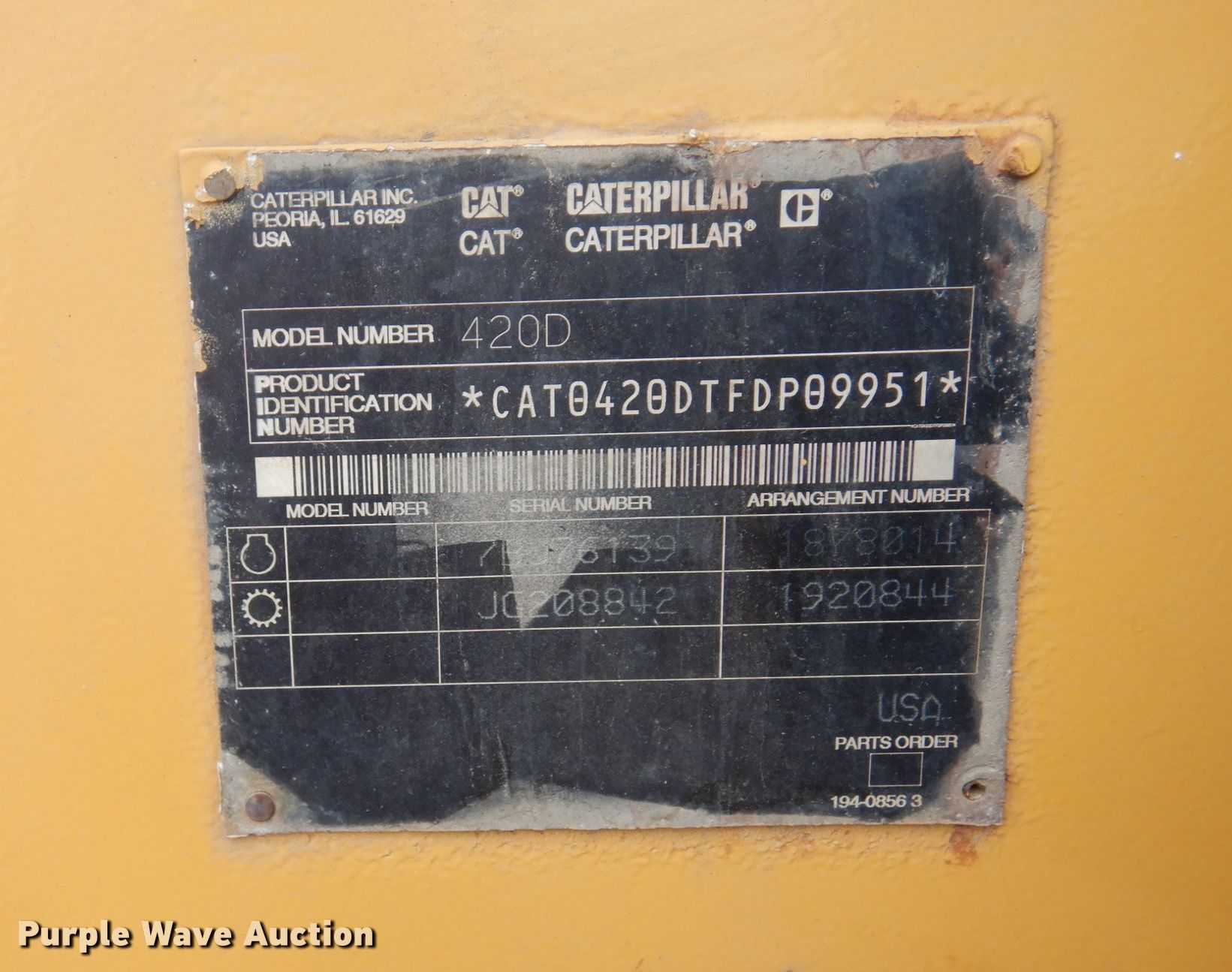 2003 Caterpillar 420D backhoe. Hours: 6,264 on meter, Serial: CAT0420DTFDP09951. Engine Caterpillar, Cylinders: 4, Fuel type: Diesel. Transmission Shuttle shift, 4F - 4R. Chassis Four wheel drive, Differential lock. Operators station Enclosed cab, Heat, Backhoe controls: Wobble stick / two stick Foot control. Features Loader Bucket Width: 86.5", Cutting edge: Bolt-on, Backhoe Extendable stick, Auxiliary hydraulics, Width: 35", Cutting edge: Weld-on, Teeth: 5. Tires Front: 19.5/80-18IND, Rear: 19.5L24IND. 13363 West Freeway Drive. Hugo, MN 55038