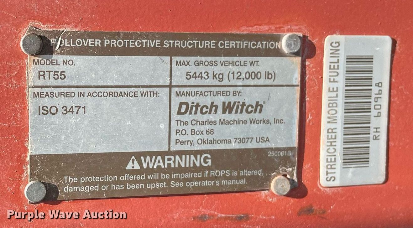2007 Ditch Witch RT55 rock saw. Hours: 850 on meter, Serial: CMWRT55HJ70000369. Engine Deutz, Cylinders: 4, Fuel type: Diesel. Transmission Hydrostatic, Two speed travel, Four wheel drive. Operators station OROPS. Features Rock wheel Wheel diameter: 48", Backfill blade Width: 72". Tires Size: 31x15.5-15. EquipmentCity LLC. 11652 Illinois 54. Clinton, IL 61727